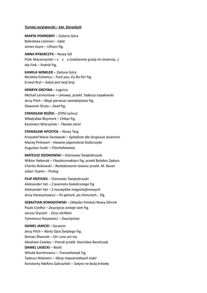 Turniej recytatorski – kat. Dorosłych MARTA POHREBNY – Zielona Góra Bolesława Leśmian – Łąka James Joyce – Ulisses frg. ANNA RYBARCZYK – Nowa Sól Piotr Macierzyński – x x x (codziennie grożą mi śmiercią…) Ida Fink – Podróż frg. KAMILA WINKLER – Zielona Góra Nicoleta Esinencu – Fuck you, Eu.Ro.Pa! frg. Ernest Bryl – Gdzie jest twój kraj HENRYK GRZYWA – Legnica Michaił Lermontow – Umowa, przekł. Tadeusz Łopalewski Jerzy Pilch – Moje pierwsze samobójstwo frg. Sławomir Shuty – Zwał frg. STANISŁAW BOŻEK – (PZN) Łańcut Władysław Reymont – Chłopi frg. Kazimierz Wierzyński – Tkanka ziemi STANISŁAW APOSTOŁ – Nowy Targ Krzysztof Maria Sieniawski – Epitafium dla Sergiusza Jesienina Maciej Pinkwart – Kazanie jegomościa Stolarczyka Augustyn Suski – Chochołowiany MATEUSZ DZIDKOWSKI – Ostrowiec Świętokrzyski Wiktor Neborak – Flaszkocmoktacz frg, przekł Bohdan Zadura Charles Bukowski – Rozładowanie towaru przekł. M. Baran Julian Tuwim – Prolog FILIP KRZYSIEK – Ostrowiec Świętokrzyski Aleksander Vat – Z poematu bukolicznego frg Aleksander Vat – Z naszeptów magnetofonowych Jerzy Harasymowicz – Po górach, po chmurach… frg. SEBASTIAN KOMADOWSKI – (Wojsko Polskie) Nowy Glinnik Paulo Coelho – Zwycięzca zostaje sam frg. Janusz Styczeń - Oczy otchłani Tymoteusz Karpowicz – Zwycięstwo DANIEL JANICKI – Szczecin Jerzy Pilch – Narty Ojca Świętego frg. Roman Śliwonik – On i ona oni my Abraham Cowley – Prorok przekł. Stanisław Barańczak DANIEL LASECKI – Boćki Witold Gombrowicz – Transatlantyk frg. Tadeusz Różewicz – Głosy niepotrzebnych ludzi Konstanty Ildefons Gałczyński – Satyra na bożą krówkę MACIEJ CYMOREK – Czeski Cieszyn (Czechy) Zbigniew Herbert – Siódmy anioł Sławomir Mrożek – Emigranci frg. WŁADYSŁAW KRISTEN – Mosty przy Cieszynie (Czechy) Adam Mickiewicz – Księgi narodu polskiego i pielgrzymstwa polskiego frg. Adam Mickiewicz – Pan Tadeusz frg. MAREK KRASIŃSKI – Starogard Gdański Terry Pratchett – Niewidoczni akademicy frg. przekł. Piotr W. Cholewa Stanisław Tym – Ballada o gospodarzu JANINA DĘGA – Starogard Gdański Wisława Szymborska – Jak ja się czuję Bronisława Wajs – Jak pięknie EDGAR AMADEUSZ WOJTASIAK – Jędrzejów Dawid Bieńkowski – Biało-czerwony frg. Joanna Kulmowa – Naturalizm Tadeusz Różewicz – Uciekinier FILIP KOWALCZYK – Warszawa Adam Mickiewicz – Pan Tadeusz frg. Fiodor Dostojewski – Zbrodnia i kara frg. przekł. J. P. Zajączkwski Juliusz Słowacki – Sen srebrny Salomei frg. TOMASZ GNAP – Lubaczów Wiesław Myśliwski – Drzewo frg. Tadeusz Różewicz – Zielona róża frg. Wisława Szymborska – Rzeczywistość wymaga DANUTA ŁUSZCZEK – (PZN) Szczecin Wiesław Myśliwski – Kamień na kamieniu frg. Czesław Miłosz – Zaśpiew ALICJA CZARNUSZKA – (PZN) Szczecin Nikołaj Erdman – Samobójca frg. Marcin Świetlicki – Brudna woda SYLWIA WITKOWSKA (Wojsko Polskie) Szczecin Tadeusz Nowak – Diabły frg. Jan Lechoń - Kolenda MARCIN GARGAS – (Wojsko Polskie) Szczecin Czesław Miłosz – Kołysanka Wiesław Myśliwski – Kamień na kamieniu frg. MAREK RÓŻAŃSKI – Sieradz Wasilij Szukszyn – Wilki frg. Włodzimierz Wysocki – Pieśń o ziemi