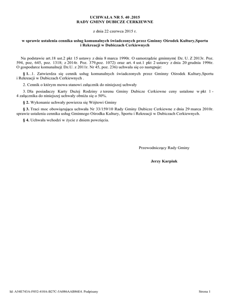 UCHWAŁA NR 5. 40 .2015 RADY GMINY DUBICZE CERKIEWNE z dnia 22 czerwca 2015 r. w sprawie ustalenia cennika usług komunalnych świadczonych przez Gminny Ośrodek Kultury,Sportu i Rekreacji w Dubiczach Cerkiewnych Na podstawie art.18 ust.2 pkt 15 ustawy z dnia 8 marca 1990r. O samorządzie gminnym( Dz. U. Z 2013r. Poz. 594, poz, 645, poz. 1318; z 2014r. Poz. 379,poz. 1072) oraz art. 4 ust.1 pkt 2 ustawy z dnia 20 grudnia 1996r. O gospodarce komunalnej( Dz.U. z 2011r. Nr 45, poz. 236) uchwala się co następuje: § 1. .1. Zatwierdza się cennik usług komunalnych świadczonych przez Gminny Ośrodek Kultury,Sportu i Rekreacji w Dubiczach Cerkiewnych . 2. Cennik o którym mowa stanowi załącznik do niniejszej uchwały 3. Dla posiadaczy Karty Dużej Rodziny z terenu Gminy Dubicze Cerkiewne ceny ustalone w pkt 1 4 załącznika do niniejszej uchwały obniża się o 50%. § 2. Wykonanie uchwały powierza się Wójtowi Gminy § 3. Traci moc obowiązująca uchwała Nr 33/159/10 Rady Gminy Dubicze Cerkiewne z dnia 29 marca 2010r. sprawie ustalenia cennika usług Gminnego Ośrodka Kultury, Sportu i Rekreacji w Dubiczach Cerkiewnych. § 4. Uchwała wchodzi w życie z dniem powzięcia. Przewodniczący Rady Gminy Jerzy Karpiuk Id: A54E743A-F052-410A-B27C-5A086AAB86E4. Podpisany Strona 1 Załącznik do Uchwały Nr 5. 40 .2015 Rady Gminy Dubicze Cerkiewne z dnia 22 czerwca 2015 r. Cennik usług komunalnych świadczonych przez Gminny Ośrodek Kultury, Sportu i Rekreacji w Dubiczach Cerkiewnych 1. WPOŻYCZALNIA SPRZĘTU I KORZYSTANIE Z KAPIELISKA DLA DZIECI I DOROSŁYCH 1) wynajem roweru wodnego, kajaka 10,00zł /godz. - soboty, niedziele i dni wolne od pracy 15,00zł/godz. 2) płetwy, deska do pływania, piłka 3,00zł /godz. 3) rower turystyczny 4,00zł /godz. 4) grill 4,00zł /godz. 5) namiot typu NS 100,00zł /doba 6) za wstęp i pobyt na kąpielisku nad zalewem „Bachmaty” na rzece Orlanka (osoby dorosłe) 3,00zł/od osoby młodzież od lat 7 do lat 18 2,00zł/od osoby 7) korzystanie z prysznica 5 zł/ od osoby 8) opłata za korzystanie z WC 1 zł/ od osoby - osoby przebywające na kąpielisku i polu biwakowym po okazaniu dowodu wniesienia opłat: za rozbicie namiotu, wstępu na kąpielisko mogą korzystać nieodpłatwnie w WC - dzieci do lat 6 i turyści korzystający z miejsc noclegowych w Ośrodku Wypoczynkowym „Bachmaty „ są zwolnieni z opłat. 2. POLE BIWAKOWE (namioty): 1) rozbicie namiotu 15,00 zł /od namiotu za dobę 2) samochód z przyczepa campingową 25,00 zł /za dobę 3) za wjazd samochodu osobowego motocykla, motoroweru 10,00 zł/za dobę 3. NOCLEGI: 1. ) DOMKI TURYSTYCZNE a) „Maciejówka” 1 łóżko b) „Dworek” 1 łóżko 200,00 zł /za dobę 40,00 zł /za dobę od osoby 400,00 zł /za dobę 40,00 zł /za dobę od osoby c) „Bachmatówka” – piętro 1 łóżko 240,00 zł /za dobę 40,00zł / za dobę dostawki w aneksach 30,00 zł /za dobę od osoby d) „Bachmatówka” – parter 40,00 zł /za dobę od osoby dostawki w aneksie 30,00 zł/za dobę od osoby e) „Chatka” 40,00 zł /za dobę Id: A54E743A-F052-410A-B27C-5A086AAB86E4. Podpisany Strona 1 1 łóżko 20,00 zł /za dobę od osoby 2) Za pierwsze 3 doby cena 40 PLN/łóżko za dostawki 30 PLN . Następne doby 35 PLN/za łóżko, dostawki 25 PLN. Cena za noclegi powyżej 10 dni może być negocjowana z Dyrektorem Ośrodka. Dzieci do lat 5 zwolnieni z opłat. 4. OGNISKO: 1) .Przygotowanie ogniska (z patyczkami): 100,00 zł 5. KARTY POCZTOWE i MAPKI TURYSTYCZNE: 1) 1) 1 szt. 0,50 zł cena sprzedaży do punktów handlowych 2) 1 szt. 0,70 zł cena detaliczna 6. WYNAJM POMIESZCZEŃ : 1) sali konferencyjno-widowiskowej w GOKSiR z wykorzystaniem przez firmy prowadzące działalność gospodarczą( np. reklama produktu, konferencje, sympozja) od 100 do 500 zł* 2) sali konferencyjno-widowiskowej w świetlicy w Grabowcu przez firmy prowadzące działalność gospodarczą( np. reklama produktu, konferencje, sympozja)od 100 do 350 zł * * - cena do negocjacji z Dyrektorem GOKSIR. Jej wysokość jest zależna od czasu trwania i ilości uczestników. 7. KORZYSTANIE Z PARKINGU NIESTRZEŻONEGO : 1) wjazd na teren parkingu – 3 zł ( od każdego pojazdu). 8. IZBA KULTURY i TRADYCJI OSP 1) bilet wstępu /zwiedzanie/ - od 3 zł od osoby 2) organizacja warsztatów związanych z twórczością ludową/pisankarstwo, tkactwo, kwiaty z bibuły itp. – 350PLN-450PLN,* - * cena do negocjacji z Dyrektorem GOKSiR. Jej wysokość jest zależna od zakresu świadczonych usług i czasu trwania, ilości uczestników Maksymalna liczba osób uczestnicząca w zajęciach - 24 osoby. Id: A54E743A-F052-410A-B27C-5A086AAB86E4. Podpisany Strona 2