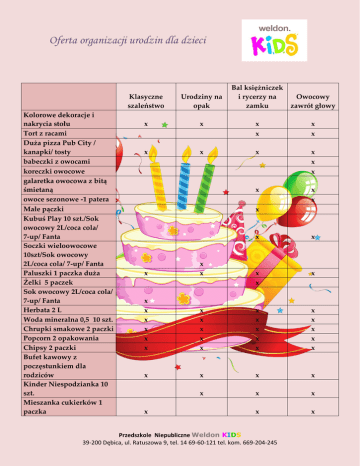 Oferta organizacji urodzin dla dzieci Kolorowe dekoracje i nakrycia stołu Tort z racami Duża pizza Pub City / kanapki/ tosty babeczki z owocami koreczki owocowe galaretka owocowa z bitą śmietaną owoce sezonowe -1 patera Małe pączki Kubuś Play 10 szt./Sok owocowy 2L/coca cola/ 7-up/ Fanta Soczki wieloowocowe 10szt/Sok owocowy 2L/coca cola/ 7-up/ Fanta Paluszki 1 paczka duża Żelki 5 paczek Sok owocowy 2L/coca cola/ 7-up/ Fanta Herbata 2 L Woda mineralna 0,5 10 szt. Chrupki smakowe 2 paczki Popcorn 2 opakowania Chipsy 2 paczki Bufet kawowy z poczęstunkiem dla rodziców Kinder Niespodzianka 10 szt. Mieszanka cukierków 1 paczka Bal księżniczek i rycerzy na zamku Owocowy zawrót głowy Klasyczne szaleństwo Urodziny na opak x x x x x x x x x x x x x x x x x x x x x x x x x x x x x x x x x x x x x x x x x x x x x x x x x x x x x x x Przedszkole Niepubliczne Weldon KIDS 39-200 Dębica, ul. Ratuszowa 9, tel. 14 69-60-121 tel. kom. 669-204-245 Oferta organizacji urodzin dla dzieci Lizaki Chupa Chups 10 szt. Zaproszenia 10 szt. Upominki dla przybyłych gości Balony dla każdego uczestnika imprezy Prezent dla solenizanta Zabawy Dyskoteka Dmuchańce Basen z Kulkami Makijaż twarzy Bańki mydlane Pn-czwartek 10 dzieci/15 dzieci Piątek-niedziela i św. 10 dzieci/15 dzieci Wynajem Sali 1h Animator 1h x x x x x x x x x x x x x x x x x x x x x x x x x x x x x x x x x x x x x x x 240zł/350zł 320zł/470zł 400zł/590zł 420zł/620zł 270zł/390zł 50 zł 50 zł 350zł/510zł 50 zł 50 zł 430zł/630zł 50 zł 50 zł 450zł/660zł 50 zł 50 zł Dla dzieci przedszkolnych 3 godzina gratis za wynajem i animatora Dodatkowo Tort z aplikacją naklejana z racami i świeczkami- 60zł x Tort z aplikacją malowaną z racami i świeczkami- 75zł Szampan 1szt.- 9zł x x x x Przedszkole Niepubliczne Weldon KIDS 39-200 Dębica, ul. Ratuszowa 9, tel. 14 69-60-121 tel. kom. 669-204-245 x