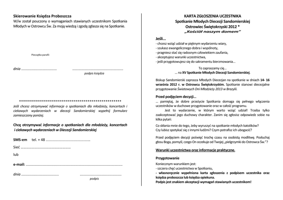 Skierowanie Księdza Proboszcza KARTA ZGŁOSZENIA UCZESTNIKA Spotkanie Młodych Diecezji Sandomierskiej Ostrowiec Świętokrzyski 2012 * W/w został pouczony o wymaganiach stawianych uczestnikom Spotkania Młodych w Ostrowcu Św. Za moją wiedzą i zgodą zgłasza się na Spotkanie. „Kościół naszym domem” Jeśli... ‐ chcesz wziąć udział w pięknym wydarzeniu wiary, ‐ szukasz ewangelicznego dobra i wspólnoty, ‐ pragniesz stać się radosnym człowiekiem zaufania, ‐ akceptujesz warunki uczestnictwa, ‐ jeśli przygotowujesz się do sakramentu bierzmowania... Pieczątka parafii dnia ................................... .................................................. podpis księdza To zapraszamy cię… ... na XV Spotkanie Młodych Diecezji Sandomierskiej. Biskup Sandomierski zaprasza Młodych Diecezjan na spotkanie w dniach 14‐ 16 września 2012 r. w Ostrowcu Świętokrzyskim. Spotkanie stanowi diecezjalne przygotowanie Światowych Dni Młodzieży 2013 w Brazylii. Przed podjęciem decyzji… Jeśli chcesz otrzymywać informacje o spotkaniach dla młodzieży, koncertach i ciekawych wydarzeniach w diecezji Sandomierskiej wypełnij formularz zamieszczony poniżej. ... pamiętaj, że dobre przeżycie Spotkania domaga się pełnego włączenia uczestników w duchowe przygotowanie oraz w całość programu. Jest to wydarzenie, w którym warto wziąć udział! Trzeba tylko zaakceptować jego duchowy charakter. Zanim się zgłosisz odpowiedz sobie na kilka pytań: Chcę otrzymywać informacje o spotkaniach dla młodzieży, koncertach i ciekawych wydarzeniach w Diecezji Sandomierskiej Co skłania mnie do tego, żeby wyruszyć na spotkanie młodych katolików? Czy lubisz spotykać się z innymi ludźmi? Czym potrafisz ich ubogacić? SMS‐em Przed podjęciem decyzji poświęć trochę czasu na osobistą modlitwę. Posłuchaj głosu Boga, pomyśl, czego On oczekuje od Twojej „pielgrzymki do Ostrowca Św.”? *************************************************** tel. + 48 .........................................… Sieć ……………………………………………… Warunki uczestnictwa oraz informacje praktyczne. lub Przygotowanie e‐mail: ............................................................................................... dnia ..................................... ......................................... podpis Koniecznym warunkiem jest: ‐ szczera chęć uczestnictwa w Spotkaniu, ‐ własnoręcznie wypełniona karta zgłoszenia z podpisem uczestnika oraz księdza proboszcza lub księdza opiekuna. Podpis jest znakiem akceptacji wymagań stawianych uczestnikom! Przyjazd wyłącznie w zgłoszonych grupach: w piątek 14 września do godz. 17.00. Wyjazd z Ostrowca do domu: w niedzielę – 16 września, ok. godz. 14.00. Program:. Uczestnicy zobowiązują się do wzięcia udziału we wszystkich oficjalnych wydarzeniach (Msze św., nabożeństwa, grupy dzielenia) w wyznaczonych miejscach. W czasie Spotkania Młodych obowiązuje całkowity zakaz spożywania alkoholu i zakazanych używek. Zakwaterowanie: w prostych warunkach pielgrzymkowych (zabrać śpiwory i karimaty!). Organizatorzy zapewniają noclegi u rodzin (na dywanie) oraz w salach szkolnych. Uczestnicy powinni przyjąć miejsca noclegu tam, gdzie zostaną skierowani przez organizatorów. (Gdy otrzymasz nocleg w rodzinie, pamiętaj o jej bezinteresownej gościnności i nigdy jej nie nadużywaj – warto pomyśleć i przygotować również drobny upominek – np. obrazek – jako wyraz wdzięczności) Wiek: W spotkaniu mogą uczestniczyć w zasadzie młodzi, którzy ukończyli 16 lat (III gimnazjum), jednak za zgodą katechety lub duszpasterza, także uczniowie I i II klas gimnazjalnych, w ramach drogi formacyjnej przed sakramentem bierzmowania. Wyżywienie: należy liczyć przede wszystkim na własny suchy prowiant; w miejscach zbiorowego noclegu organizatorzy zapewniają prosty ciepły posiłek i herbatę. Udział w kosztach (przejazdy na miejscu, materiały organizacyjne, wynajęcie obsługi technicznej itp.) – w sumie to 20 zł od uczestnika. Wpłaty dokonujemy na miejscu w recepcji. UWAGA! Opłata ta nie zawiera kosztów przyjazdu i powrotu. Zgłoszenia udziału: we własnej parafii lub u własnego katechety, po podpisaniu „Karty zgłoszenia”. Nr ......... Spotkanie Młodych Diecezji Sandomierskiej – Ostrowiec Świętokrzyski 2012 OSOBISTE ZGŁOSZENIE UDZIAŁU (wypełnić własnoręcznie i osobiście oddać w recepcji podczas spotkania). Zapoznałem/‐am się dokładnie z założeniami Spotkania Młodych Diecezji Sandomierskiej w Ostrowcu Św. i akceptuję warunki uczestnictwa w Spotkaniu. Pragnę wziąć w nim udział i zobowiązuję się włączyć w całość wspólnego programu. imię i nazwisko: ................................................................................... data urodzenia: .................................................................................... adres: ................................................................................................... parafia: ................................................................................................ telefon domowy (rodziców): ................................................................ szkoła: .................................................................................................. dnia ..................................... ......................................... podpis Uczestnika DEKLARACJA RODZICÓW (dla uczestników niepełnoletnich) Przejazd: każda grupa (w parafii lub w dekanacie) ustala według własnych możliwości. Pozwalam, aby mój syn/ moja córka uczestniczył/‐a w Spotkaniu Młodych Diecezji Sandomierskiej – OSTROWIEC ŚW. 2012 pod opieką Informacje na temat Spotkania Młodych Diecezji Sandomierskiej można znaleźć na oficjalnej stronie internetowej www.sms.sandomierz.opoka.org.pl ..............................................................................
