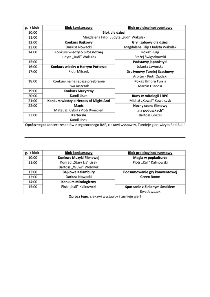 g. \ blok 10:00 11:00 12:00 13:00 14:00 Blok konkursowy Blok prelekcyjno/eventowy Blok dla dzieci Magdalena Filip i Judyta „Judi” Wakulak Konkurs Bajkowy Gry i zabawy dla dzieci Dariusz Nowacki Magdalena Filip I Judyta Wakulak Konkurs wiedzy o piłce nożnej Pokaz iluzji Judyta „Judi” Wakulak Błażej Święszkowski 15:00 Podstawy japonistyki Jolanta Jaworska 16:00 Konkurs wiedzy o Harrym Potterze Piotr Milczek 17:00 Drużynowy Turniej Szachowy Arbiter - Piotr Opolski 18:00 Konkurs na najlepsze przebranie Pokaz Umbra Turris Ewa Jaszczak Marcin Gładosz 19:00 Konkurs Muzyczny Kamil Lisek 20:00 Runy w mitologii i RPG Michał „Kowal” Kowalczyk 21:00 Konkurs wiedzy o Heroes of Might And Magic 22:00 Nocny seans filmowy Mateusz Cybul i Piotr Kwiecień „na poduszkach” 23:00 Karteczki Bartosz Gorzel Kamil Lisek Oprócz tego: koncert zespołów z tegorocznego RAF, ciekawi wystawcy, Turnieje gier, wizyta Red Bull! g. \ blok 10:00 11:00 Blok konkursowy Konkurs Muzyki Filmowej Konrad „Stary Lis” Lisek Bartosz „Wuwi” Wołowik Bajkowe Kalambury Dariusz Nowacki Konkurs Mitologiczny Piotr „Kali” Kalinowski 12:00 13:00 14:00 15:00 Blok prelekcyjno/eventowy Magia w popkulturze Piotr „Kali” Kalinowski Podsumowanie gry konwentowej Green Room Spotkanie z Zielonym Smokiem Ewa Jaszczak Oprócz tego: ciekawi wystawcy i turnieje gier!