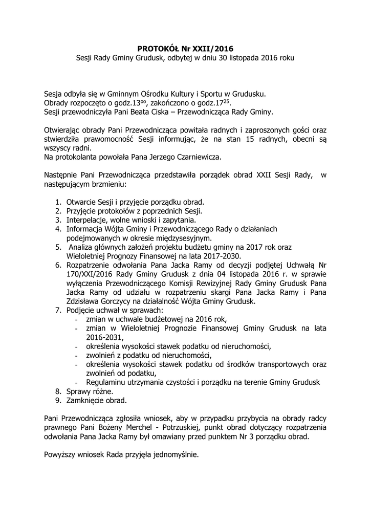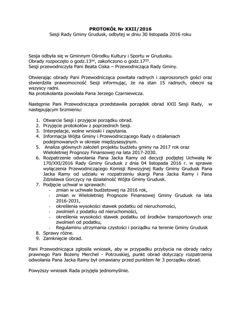 PROTOKÓŁ Nr XXII/2016 Sesji Rady Gminy Grudusk, odbytej w dniu 30 listopada 2016 roku Sesja odbyła się w Gminnym Ośrodku Kultury i Sportu w Grudusku. Obrady rozpoczęto o godz.13oo, zakończono o godz.1725. Sesji przewodniczyła Pani Beata Ciska – Przewodnicząca Rady Gminy. Otwierając obrady Pani Przewodnicząca powitała radnych i zaproszonych gości oraz stwierdziła prawomocność Sesji informując, że na stan 15 radnych, obecni są wszyscy radni. Na protokolanta powołała Pana Jerzego Czarniewicza. Następnie Pani Przewodnicząca przedstawiła porządek obrad XXII Sesji Rady, następującym brzmieniu: 1. 2. 3. 4. 5. 6. 7. 8. 9. w Otwarcie Sesji i przyjęcie porządku obrad. Przyjęcie protokołów z poprzednich Sesji. Interpelacje, wolne wnioski i zapytania. Informacja Wójta Gminy i Przewodniczącego Rady o działaniach podejmowanych w okresie międzysesyjnym. Analiza głównych założeń projektu budżetu gminy na 2017 rok oraz Wieloletniej Prognozy Finansowej na lata 2017-2030. Rozpatrzenie odwołania Pana Jacka Ramy od decyzji podjętej Uchwałą Nr 170/XXI/2016 Rady Gminy Grudusk z dnia 04 listopada 2016 r. w sprawie wyłączenia Przewodniczącego Komisji Rewizyjnej Rady Gminy Grudusk Pana Jacka Ramy od udziału w rozpatrzeniu skargi Pana Jacka Ramy i Pana Zdzisława Gorczycy na działalność Wójta Gminy Grudusk. Podjęcie uchwał w sprawach: - zmian w uchwale budżetowej na 2016 rok, - zmian w Wieloletniej Prognozie Finansowej Gminy Grudusk na lata 2016-2031, - określenia wysokości stawek podatku od nieruchomości, - zwolnień z podatku od nieruchomości, - określenia wysokości stawek podatku od środków transportowych oraz zwolnień od podatku, - Regulaminu utrzymania czystości i porządku na terenie Gminy Grudusk Sprawy różne. Zamknięcie obrad. Pani Przewodnicząca zgłosiła wniosek, aby w przypadku przybycia na obrady radcy prawnego Pani Bożeny Merchel - Potrzuskiej, punkt obrad dotyczący rozpatrzenia odwołania Pana Jacka Ramy był omawiany przed punktem Nr 3 porządku obrad. Powyższy wniosek Rada przyjęła jednomyślnie. Następnie Pani Przewodnicząca zaproponowała, aby na dzisiejszej Sesji nie podejmować uchwały w sprawie przyjęcia Regulaminu utrzymania czystości i porządku na terenie Gminy Grudusk, projekt tego Regulaminu przygotowany na razie został w formie informacyjnej. W/w wniosek został przyjęty jednomyślnie. Wójt Gminy Pan Jacek Oglęcki wnioskował, aby do porządku obrad włączyć projekt uchwały w sprawie dokonania zmian w Uchwale Nr 72/XI/2016 Rady Gminy Grudusk z dnia 27 stycznia 2016 r. dotyczącej emisji obligacji. Wniosek Pana Wójta został przyjęty 10 głosami przy 5 głosach przeciwnych. Ad.pkt.2 Przewodnicząca Rady Pani Beata Ciska zgłosiła wniosek, aby protokoły z XIX, XX i XXI Sesji Rady Gminy zostały przyjęte bez odczytywania. Poinformowała, że osobiście zapoznała się z treścią tych protokołów, w pełni odzwierciedlają one przebieg obrad Sesji. Radni mieli także możliwość wglądu do protokołów, gdyż w okresie międzysesyjnym były wywieszone na tablicy ogłoszeń w Urzędzie Gminy, są zamieszczone na stronie internetowej Urzędu Gminy - Biuletyn Informacji Publicznej oraz dostępne u protokolanta obrad. Radny Pan Zdzisław Gorczyca do w/w protokołów zgłosił następujące uwagi: - w protokole Nr XXI/2016 zmieniona została jego wypowiedź, która powinna mieć brzmienie: „w przypadku rozwiązywania spraw konfliktowych między radnymi a Panem Wójtem oraz między radnymi a Panią Przewodniczącą, nie powinniśmy się opierać na opiniach Pani Potrzuskiej.”, - z protokołu Nr XXI/2016 powinna zostać wykreślona jego wypowiedź dotycząca braku chodnika do ul.Polnej przy modernizowanej obecnie drodze wiodącej w kierunku Rąbieża Gruduskiego, gdyż została wypowiedziana już po zakończeniu obrad, - Sesje, które odbywały się w Urzędzie Gminy, mimo przyjętych ustaleń, nie były nagrywane. Radny Pan Jacek Rama stwierdził, że Statut Gminy mówi nie tylko o możliwości nagrywania obrad Sesji ale także o archiwizacji tych nagrań. Sekretarz Gminy Pani Bogumiła Malinowska poinformowała, że zgodnie ze Statutem Gminy nagranie obrad Sesji Rady powinno być przechowywane do momentu przyjęcia przez Radę protokołu z tej Sesji. Przewodnicząca Rady Pani Beata Ciska informując, iż były przypadki, że radni nie zgodzili się na nagrywanie przebiegu obrad, zwróciła się do nich z pytaniem, czy wszystkie Sesje mają być nagrywane na dyktafon? Rada 14 głosami przy 1 przeciwnym zdecydowała o nagrywaniu wszystkich Sesji. Następnie Pani Przewodnicząca poddała pod głosowanie pozostałe wnioski zgłoszone przez Pana Zdzisława Gorczycę a dotyczące zmiany treści protokołu Nr XXI/2016: - wniosek w sprawie zmiany zapisu dotyczącego rozwiązywania spraw konfliktowych między Wójtem a radnymi i między Panią Przewodniczącą a radnymi, został przyjęty 11 głosami, przy 4 głosach wstrzymujących się, - wniosek w sprawie wykreślenia z protokołu wypowiedzi dotyczącej braku chodnika przy modernizowanej drodze w kierunku Rąbieża Gruduskiego, przyjęto 13 głosami, przy 2 głosach wstrzymujących się. Następnie Rada 14 głosami, przy 1 głosie wstrzymującym się przyjęła protokół Nr XXI/2016 wraz z wnioskami zgłoszonymi przez radnego Pana Zdzisława Gorczycę. Do pozostałych protokołów Rada nie zgłosiła uwag. Ad.pkt.6 Przewodnicząca Rady Pani Beata Ciska odczytała odwołanie Pana Jacka Ramy od decyzji Rady Gminy odnośnie odsunięcia jego osoby, jako Przewodniczącego Komisji Rewizyjnej, od sprawy rozpatrzenia skargi na działalność Wójta Gminy, związaną z prowadzeniem Biuletynu Informacji Publicznej Urzędu Gminy Grudusk. (w/w pismo w załączeniu protokołu) Następnie Pani Przewodnicząca w swoim imieniu odniosła się do powyższego odwołania. (wypowiedź Pani Przewodniczącej w załączeniu protokołu) Radny Pan Piotr Gołębiewski zarzuci
