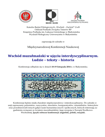 Katedra Badań Filologicznych „Wschód – Zachód” UwB Oddział Podlaski Związku Tatarów RP Książnica Podlaska im. Łukasza Górnickiego w Białymstoku Wydział Filologiczny Uniwersytetu w Białymstoku zapraszają do udziału w Międzynarodowej Konferencji Naukowej Wschód muzułmański w ujęciu interdyscyplinarnym. Ludzie – teksty – historia Konferencja odbędzie się w dniach 18-19 listopada 2016 r. w Białymstoku. Konferencja będzie miała charakter międzynarodowy i interdyscyplinarny. Do udziału w sesji zapraszamy polonistów, rusycystów, slawistów, komparatystów, orientalistów, historyków oraz przedstawicieli innych gałęzi nauk humanistycznych i społecznych, których interesują zagadnienia związane ze światem muzułmańskim i jego recepcją w Europie ŚrodkowoWschodniej. Języki robocze konferencji: angielski, polski, rosyjski. Podczas spotkania chcielibyśmy zastanowić się nad następującymi zagadnieniami: Inspiracje orientalne w literaturach słowiańskich od średniowiecza do współczesności. Problemy metodologiczne w badaniach nad muzułmańskim Wschodem: warunki polskie, kontekst europejski. Literackie obrazy krajów muzułmańskich. Badacze Wschodu muzułmańskiego w Polsce i innych krajach słowiańskich. Idee Wschodu w polityce i kulturze XVI-XX wieku. Wschód muzułmański z perspektywy I i II Rzeczypospolitej. Wschód mistyczny w ujęciu XIX-wiecznym i jego wpływ na polityczne aspekty odrodzenia państwa polskiego w 1918 roku. Podróże polskich pisarzy, uczonych, polityków, dyplomatów do krajów muzułmańskich: ich świadectwa, diagnozy, fascynacje. Pamiętniki i ich twórcy: źródła do poznania dziejów Wschodu w okresie staropolskim i w XIX w. Polacy na Wschodzie: dobrowolni imigranci – przymusowi osiedleńcy i zesłańcy. Tak jak podczas wcześniejszych konferencji organizowanych wspólnie ze Związkiem Tatarów RP (2014 i 2015 r.) interesować nas będą również zagadnienia związane z historią, kulturą i literaturą polskich, litewskich i białoruskich Tatarów: Piśmiennictwo Tatarów Wielkiego Księstwa Litewskiego oraz współczesna literatura polsko-, białorusko- i litewsko-tatarska (ujęcia historyczno- i teoretycznoliterackie, tekstologiczne, kulturoznawcze, socjologiczne i inne). Folklor tatarski (niekanoniczne modlitwy, zamówienia, zaklęcia, baśnie i legendy). Publicystyka i ruch wydawniczy Tatarów w Polsce, na Białorusi i Litwie. Historia Tatarów i islamu w Polsce, na Litwie, Białorusi i Ukrainie od XIV w. do współczesności. * * * Organizatorzy zapewniają nocleg i wyżywienie w dniach 17/18, 18/19 i 19/20 listopada 2016 roku (koszt pokryty będzie z opłaty wpisowej). Uczestnicy powinni opłacić wpisowe w wysokości 490 zł (dla osób z Białegostoku – 350 zł). [o numerze konta poinformujemy w osobnym liście]. Materiały z sesji zostaną wydane w formie recenzowanej punktowanej monografii zbiorowej, która ukaże się w Naukowej Serii Wydawniczej „Colloquia Orientalia Bialostocensia” w 2017 roku. Na zgłoszenia czekamy do 20 czerwca 2016 roku. Prosimy je przesłać na adres elektroniczny: [email protected] Komitet Organizacyjny: - Dr Grzegorz Czerwiński (Katedra Badań Filologicznych „Wschód – Zachód” UwB) - Dr Artur Konopacki (Wydział Pedagogiki i Psychologii UwB / Związek Tatarów RP) - Prof. Aleksander Gadomski (Akademia Jana Długosza w Częstochowie) - Prof. Leonarda Dacewicz (Kierownik Katedry Językoznawstwa Wschodniosłowiańskiego UwB) - Prof. Dariusz Kulesza (Kierownik Zakładu Literatury Międzywojennej i Współczesnej UwB) - Prof. Anna Kieżuń (Zakład Literatury Międzywojennej i Współczesnej UwB) - Mgr Jolanta Dragańska (Katedra Badań Filologicznych „Wschód – Zachód” UwB) Siedziba Komitetu Organizacyjnego: Katedra Badań Filologicznych „Wschód – Zachód” Wydział Filologiczny Uniwersytetu w Białymstoku Plac Uniwersytecki 1, pokój 75, 15-420 Białystok Tel. 725 778 089, e-mail: [email protected]