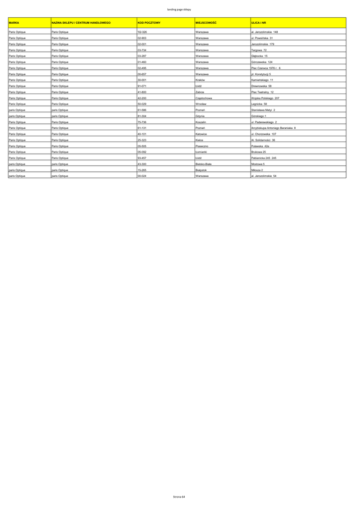 landing page sklepy MARKA NAZWA SKLEPU / CENTRUM HANDLOWEGO KOD POCZTOWY MIEJSCOWOŚĆ ULICA i NR Paris Optique Paris Optique '02-326 Warszawa al. Jerozolimskie 148 Paris Optique Paris Optique 02-903 Warszawa ul. Powsińska 31 Paris Optique Paris Optique 02-001 Warszawa Jerozolimskie 179 Paris Optique Paris Optique 03-734 Warszawa Targowa 72 Paris Optique Paris Optique 03-287 Warszawa Głębocka 15 Paris Optique Paris Optique 01-460 Warszawa Górczewska 124 Paris Optique Paris Optique 02-495 Warszawa Plac Czerwca 1976 r. 6 Paris Optique Paris Optique 00-657 Warszawa pl. Konstytucji 5 Paris Optique Paris Optique 30-001 Kraków Kamieńskiego 11 Paris Optique Paris Optique 91-071 Łódź Drewnowska 58 Paris Optique Paris Optique 41-800 Zabrze Plac Teatralny 12 Paris Optique Paris Optique 42-200 Częstochowa Wojska Polskiego 207 Paris Optique Paris Optique 50-029 Wrocław Legnicka 58 paris Optique paris Optique 61-586 Poznań Stanisława Matyi 2 paris Optique paris Optique 81-304 Gdynia Górskiego 1 Paris Optique Paris Optique 75-736 Koszalin ul. Paderewskiego 2 Paris Optique Paris Optique 61-131 Poznań Arcybiskupa Antoniego Baraniaka 8 Paris Optique Paris Optique 40-101 Katowice ul. Chorzowska 107 Paris Optique Paris Optique 25-323 Kielce Al. Solidarności 36 Paris Optique Paris Optique 05-505 Piaseczno Puławska 42e Paris Optique Paris Optique 05-092 Łomianki Brukowa 25 Paris Optique Paris Optique 93-457 Łódź Pabianicka 245 245 paris Optique paris Optique 43-300 Bielsko-Biała Mostowa 5 paris Optique paris Optique 15-265 Białystok Miłosza 2 paris Optique paris Optique 00-024 Warszawa al. Jerozolimskie 54 Strona 64