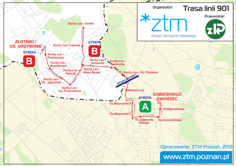 Organizator: Trasa linii 901 Przewoźnik: ul. Bogusławskiego Suchy Las / Działki ZŁOTNIKI / OS. GRZYBOWE STREFA Suchy Las / Łąkowa Ne kta row a B Suchy Las / Promienista ul. STREFA B ul .P ow Suchy Las / Strażacka Suchy Las / Borówkowa st ań có w W ie lk o po ul. Leśna Suchy Las / Kościół lsk Suchy Las / Nowy Rynek Suchy Las / Sprzeczna ul .L eś na Suchy Las / Os. Przylesie ole ch Su ul. Suchy Las / Os. Poziomkowe Wietrzna n/ż STREFA Os.Marysieńki II Os.Marysieńki I W ie rz b ak ul. Stróżyńskiego ul. Mateckiego SOBIESKIEGO DWORZEC A ul. Szymanowskiego Os.Zygmunta Starego ul. Szeligowskiego Suchy Las / Os. Jagodowe sk a ich Szeligowskiego Szymanowskiego Str u mie ńS trz esz y ńsk i Opracowanie: ZTM Poznań, 2013 www.ztm.poznan.pl