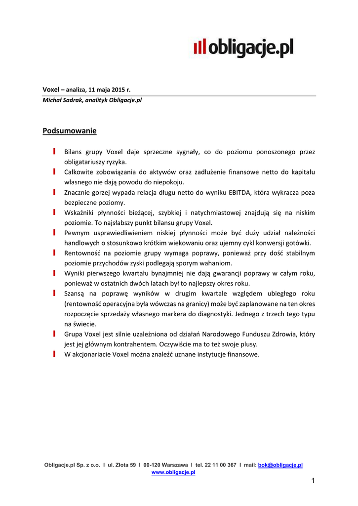 Voxel – analiza, 11 maja 2015 r. Michał Sadrak, analityk Obligacje.pl Podsumowanie Bilans grupy Voxel daje sprzeczne sygnały, co do poziomu ponoszonego przez obligatariuszy ryzyka. Całkowite zobowiązania do aktywów oraz zadłużenie finansowe netto do kapitału własnego nie dają powodu do niepokoju. Znacznie gorzej wypada relacja długu netto do wyniku EBITDA, która wykracza poza bezpieczne poziomy. Wskaźniki płynności bieżącej, szybkiej i natychmiastowej znajdują się na niskim poziomie. To najsłabszy punkt bilansu grupy Voxel. Pewnym usprawiedliwieniem niskiej płynności może być duży udział należności handlowych o stosunkowo krótkim wiekowaniu oraz ujemny cykl konwersji gotówki. Rentowność na poziomie grupy wymaga poprawy, ponieważ przy dość stabilnym poziomie przychodów zyski podlegają sporym wahaniom. Wyniki pierwszego kwartału bynajmniej nie dają gwarancji poprawy w całym roku, ponieważ w ostatnich dwóch latach był to najlepszy okres roku. Szansą na poprawę wyników w drugim kwartale względem ubiegłego roku (rentowność operacyjna była wówczas na granicy) może być zaplanowane na ten okres rozpoczęcie sprzedaży własnego markera do diagnostyki. Jednego z trzech tego typu na świecie. Grupa Voxel jest silnie uzależniona od działań Narodowego Funduszu Zdrowia, który jest jej głównym kontrahentem. Oczywiście ma to też swoje plusy. W akcjonariacie Voxel można znaleźć uznane instytucje finansowe. Obligacje.pl Sp. z o.o. I ul. Złota 59 I 00-120 Warszawa I tel. 22 11 00 367 I mail: [email protected] www.obligacje.pl 1 Profil działalności, historia Voxel Spółka Akcyjna – sieć centrów medycznych wyspecjalizowanych w diagnostyce obrazowej. Świadczone przez nią usługi obok rezonansu magnetycznego i tomografii komputerowej obejmują także zaawansowaną diagnostykę jak pozytonowa tomografia emisyjna oraz tomografia emisyjna pojedynczych fotonów (badania medycyny nuklearnej). Część usług z zakresu radiologii w grupie Voxel realizowana jest poprzez spółkę zależną Centrum Diagnostyki Obrazowej Jelenia Góra. Ponadto, w skład grupy wchodzi także spółka Alteris, która zajmuje się dostarczaniem systemów informatycznych dla placówek medycznych oraz świadczy usługi z obszaru wyposażenia pracowni diagnostycznych. W obu podmiotach Voxel posiada 100-proc. udział w kapitale. Grupa Voxel świadczy usługi w ponad 20 centrach diagnostycznych, które zlokalizowane są na terenie dziesięciu województw. Voxel został wpisany do KRS w sierpniu 2005 r. W październiku 2011 r. akcje spółki zadebiutowały na rynku NewConnect, natomiast dwa lata później nastąpiło ich przeniesienie do obrotu na rynek główny GPW. Akcjonariat, kadra zarządzająca Kapitał spółki dzieli się na 10,5 mln akcji serii A-L, uprawniających do 13,5 mln głosów na zgromadzeniu akcjonariuszy. Akcje uprzywilejowane co do głosu należą do wiodącego akcjonariusza Voxel International S.a.r.l., który posiada 49,3 proc. w kapitale spółki oraz 60,5 proc. według liczby głosów. Wśród ujawnionych akcjonariuszy Voxel znajdują się także trzy instytucje finansowe, z TFI PZU na czele, które jest największym towarzystwem na polskim rynku pod względem wartości zarządzanych aktywów. Warto też zwrócić uwagę na rodzaj inwestorów, bo znajdują się wśród nich zarówno fundusz aktywów niepublicznych, jak i fundusz emerytalny. Obligacje.pl Sp. z o.o. I ul. Złota 59 I 00-120 Warszawa I tel. 22 11 00 367 I mail: [email protected] www.obligacje.pl 2 Akcjonariat Voxel SA (wew. udziały w kapitale, zew. głosy na WZA) Źródło: spółka. W skład zarządu podmiotu dominującego w grupie wchodzą trzy osoby: Jacek Liszka – prezes zarządu, założyciel Voxel SA i Alteris Sp. z o.o. W przeszłości zakładał także Śląskie Centrum Diagnostyki Obrazowej HALIMED oraz Scanmed. Dariusz Pietras – wiceprezes zarządu, założyciel Voxel SA. Na stanowisku od 2007 r. Grzegorz Maślanka – członek zarządu. Odpowiedzialny za finanse. W Voxel od 2010 r. Wcześniej dyrektor finansowy i członek zarządu w Pragmie Faktoring oraz spółkach z grupy BP. Obok doświadczonej kadry zarządzającej, składającej się częściowo z założycieli spółki oraz uznanych instytucji finansowych w akcjonariacie, uwagę warto zwrócić także na notowania akcji Voxel. Po kilkunastu miesiącach trendu spadkowego spółka ponownie zaczęła przyciągać uwagę inwestorów. Od lutego walory Vokselu znajdują się w silnym trendzie wzrostowym, mimo że w drugiej połowie marca opublikowano sprawozdanie za zeszły rok, w którym widniała skonsolidowana strata netto. Obligacje.pl Sp. z o.o. I ul. Złota 59 I 00-120 Warszawa I tel. 22 11 00 367 I mail: [email protected] www.obligacje.pl 3 Notowania akcji Voxel S.A. od dnia giełdowego debiutu Źródło: stooq.pl. Analiza finansowa Wstęp Na wstępie warto podkreślić, że sytuacja finansowa grupy Voxel jest silnie uzależniona od działań Narodowego Funduszu Zdrowia, który jest jej głównym kontrahentem. Ma to swoje dobre strony, jak na przykład relatywnie szybki spływ należności czy ich ogólnie wysoka ściągalność. Lecz po drugiej stronie mamy ryzyko wszelkich działań podejmowanych przez Ministerstwo Zdrowia i NFZ. Po raz ostatni Voxel zwracał na to uwagę przy okazji sprawozdania finansowego za 2014 r., wspominając o nieprecyzyjnych procedurach kontraktowania procedur medycznych. Należy wspomnieć, że wchodząca w skład grupy Alteris SA, znajduje się w fazie głębokiej restrukturyzacji kosztowej. Celem jej przeprowadzenia ma być wykazanie dodatniego wyniku netto za 2015 r. Obligacje.pl Sp. z o.o. I ul. Złota 59 I 00-120 Warszawa I tel. 22 11 00 367 I mail: [email protected] www.obligacje.pl 4 Analizując rachunek wyników grupy Voxel warto przyglądać się także zyskowi EBITDA, który z powodu relatywnie wysokiej amortyzacji (spowodowanej wysokimi aktywami trwałymi) istotnie r