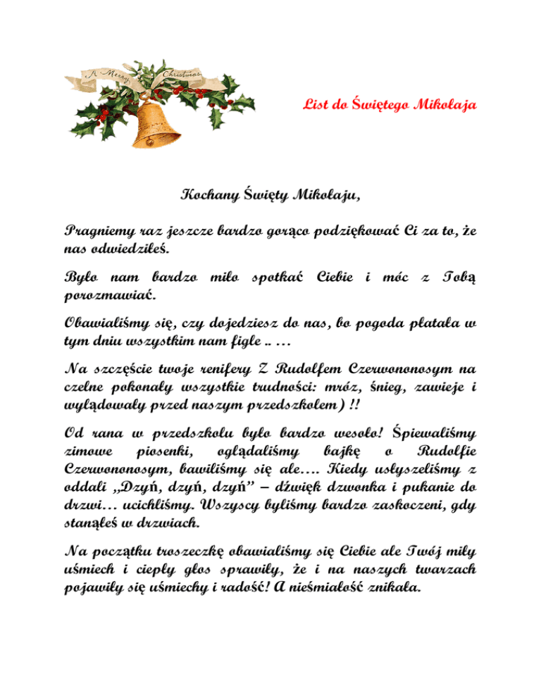 List do Świętego Mikołaja Kochany Święty Mikołaju, Pragniemy raz jeszcze bardzo gorąco podziękować Ci za to, że nas odwiedziłeś. Było nam bardzo miło spotkać Ciebie i móc z Tobą porozmawiać. Obawialiśmy się, czy dojedziesz do nas, bo pogoda płatała w tym dniu wszystkim nam figle .. … Na szczęście twoje renifery Z Rudolfem Czerwononosym na czelne pokonały wszystkie trudności: mróz, śnieg, zawieje i wylądowały przed naszym przedszkolem) !! Od rana w przedszkolu było bardzo wesoło! Śpiewaliśmy zimowe piosenki, oglądaliśmy bajkę o Rudolfie Czerwononosym, bawiliśmy się ale…. Kiedy usłyszeliśmy z oddali „Dzyń, dzyń, dzyń” – dźwięk dzwonka i pukanie do drzwi… ucichliśmy. Wszyscy byliśmy bardzo zaskoczeni, gdy stanąłeś w drzwiach. Na początku troszeczkę obawialiśmy się Ciebie ale Twój miły uśmiech i ciepły głos sprawiły, że i na naszych twarzach pojawiły się uśmiechy i radość! A nieśmiałość znikała. Ucieszyliśmy się, że spodobał Ci się nasz występ i piosenki, które dla Ciebie zaśpiewaliśmy. Dziękujemy Ci bardzo gorąco za prezenty, którymi nas obdarowałeś i za to że o nas pamiętałeś! Święty Mikołaju! Pozdrawiamy Cię serdecznie i do miłego zobaczenia!! Mali Przyjaciele