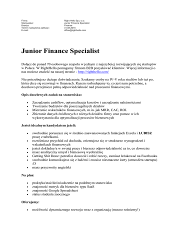 Firma: Stanowisko: Branża: Termin nadsyłania aplikacji : E-mail: Right Hello Sp.z o.o. Junior Finance Specialist Finanse 31.08.2016 [email protected] Junior Finance Specialist Dołącz do ponad 70 osobowego zespołu w jednym z najszybciej rozwijających się startupów w Polsce. W RightHello pomagamy firmom B2B pozyskiwać klientów. Więcej informacji o nas możesz znaleźć na naszej stronie - http://righthello.com/ Nie potrzebujesz dużego doświadczenia. Szukamy osoby na IV-V roku studiów lub tuż po, która chce się rozwinąć w finansach. Razem rozbudujemy to, co jest nam potrzebne, a docelowo przejmiesz pełną odpowiedzialność nad procesami finansowymi. Opis docelowych zadań na stanowisku: Zarządzanie cashflow, optymalizacja kosztów i zarządzanie należnościami Tworzenie budżetów dla poszczególnych działów Mierzenie wskaźników finansowych, m.in. jak MRR, CAC, ROI. Zbieranie danych źródłowych z różnych działów firmy oraz pomoc w ich wykorzystaniu dla optymalizacji procesów biznesowych Jesteś idealnym kandydatem jeżeli: swobodnie poruszasz się w średnio-zaawansowanych funkcjach Excela i LUBISZ pracę z tabelkami. rozróżniasz przychód od dochodu, orientujesz się w strukturze wynagrodzeń i wskaźnikach finansowych jesteś dokładny/a w swojej pracy i bierzesz odpowiedzialność za to, co dowozisz masz analityczny umysł i biznesową wyobraźnię Getting Shit Done: potrafisz dowozić i robić rzeczy, zamiast leżakować na Facebooku swobodnie komunikujesz się z ludźmi i znosisz niesmaczne żarty (atmosfera startupu) :D masz przyzwoity angielski Na plus: praktyka/staż/doświadczenie na podobnym stanowisku znajomość metryk dla biznesów typu SaaS znajomość Google Spreadsheet status studenta zaocznego Oferujemy: możliwość dynamicznego rozwoju wraz z organizacją (mocno rośniemy!) pracę na pełny etat umowę na okres próbny (1 miesiąc) a następnie umowę na czas nieokreślony stałe wynagrodzenie miesięczne w wysokości uzależnionej od doświadczenia oraz motywacji do pracy praca w super szybko rozwijającej się firmie z fajnymi ludźmi narzędzia pracy oraz dobrą kawę firmowy lunch, imprezy firmowe, gry, planszówki i wiele innych! Wyślij maila z CV/profilem na LinkedIn oraz krótką informacją, dlaczego chciałbyś z nami pracować. *Skontaktujemy się tylko z wybranymi osobami. **Na Twoją aplikację czekamy do 31.08