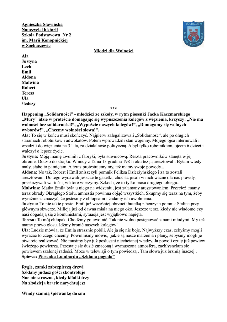 Agnieszka Sławińska Nauczyciel historii Szkoła Podstawowa Nr 2 im. Marii Konopnickiej w Sochaczewie Młodzi dla Wolności Ala Justyna Lech Emil Aldona Malwina Robert Teresa Ula śledczy *** Happening „Solidarności” - młodzież ze szkoły, w rytm piosenki Jacka Kaczmarskiego „Mury” idzie w proteście domagając się wypuszczenia kolegów z więzienia, krzyczy: „Nie ma wolności bez solidarności!”, „Wypuście naszych kolegów!”, „Domagamy się wolnych wyborów!”, „Chcemy wolności słowa!”. Ala: To się w końcu musi skończyć. Najpierw zalegalizowali „Solidarność”, ale po długich staraniach robotników i adwokatów. Potem wprowadzili stan wojenny. Mojego ojca internowali i wsadzili do więzienia na 3 lata, za działalność polityczną. A był tylko robotnikiem, ojcem 6 dzieci i walczył o lepsze życie. Justyna: Moją mamę zwolnili z fabryki, była suwnicową. Reszta pracowników stanęła w jej obronie. Doszło do strajku. W nocy z 12 na 13 grudnia 1981 roku też ją aresztowali. Byłam wtedy mały, słabo to pamiętam. A teraz protestujemy my, też mamy swoje powody... Aldona: No tak, Robert i Emil zniszczyli pomnik Feliksa Dzierżyńskiego i za to zostali aresztowani. Do tego wydawali jeszcze te gazetki, chociaż pisali w nich ważne dla nas prawdy, przekazywali wartości, w które wierzymy. Szkoda, że to tylko prasa drugiego obiegu... Malwina: Matka Emila była u niego na widzeniu, jest załamany aresztowaniem. Przecież mamy teraz obrady Okrągłego Stołu, amnestia powinna objąć wszystkich. Skupmy się teraz na tym, żeby wyraźnie zaznaczyć, że jesteśmy z chłopcami i żądamy ich uwolnienia. Justyna: To nie takie proste. Emil już wcześniej obrzucił butelką z benzyną pomnik Stalina przy głównym skwerze. Milicja już od dawna miała na niego oko. Jeszcze teraz, kiedy nie wiadomo czy nasi dogadają się z komunistami, sytuacja jest wyjątkowo napięta. Teresa: To mój chłopak. Chodźmy go uwolnić. Tak nie wolno postępować z nami młodymi. My też mamy prawo głosu. Idźmy bronić naszych kolegów! Ula: Ludzie mówią, że Emila strasznie pobili. Ale ja się nie boję. Najwyższy czas, żebyśmy mogli wyrażać to czego chcemy. Powinniśmy mówić, jakie są nasze marzenia i plany, żebyśmy mogli je otwarcie realizować. Nie musimy być już posłuszni niechcianej władzy. Ja powoli czuję już powiew świeżego powietrza. Przestaję się dusić zmąconą i wymuszoną atmosferą, zachłysnęłam się powiewem szalonej radości. Może w telewizji o tym powiedzą . Tam słowa już brzmią inaczej.. Śpiewa: Piosenka Lombardu „Szklana pogoda” Rygle, zamki zabezpieczą drzwi Szklany judasz gości skontroluje Noc nie straszna, kiedy kłódki trzy Na złodzieja bracie narychtujesz Windy szumią śpiewankę do snu Sąsiad pacierz klepie na kolanach Może jeszcze raz się uda znów Przetrwać noc i doczołgać do rana Refren: Szklana pogoda Szyby niebieskie od telewizorów Szklana pogoda Szklanka naciąga bez humoru Szklana pogoda *** Scena w więzieniu, Emil jest przesłuchiwany przez śledczego: Emil: Jeszcze raz mówię, że to co zrobiłem, nie jest przestępstwem. Jak można nadal stawiać kwiatki przed pomnikiem Feliksa Dzierżyńskiego czy Józefa Stalina. To nienormalne w kraju, gdzie większość społeczeństwa domaga się demokratycznych praw. Musicie mnie wypuścić, nawet jeśli mnie tu zatrzymacie, to na moje miejsce znajdzie się 10 innych, którzy postanowią walczyć o liberalizm dla naszej Ojczyzny. Śledczy: No Rybeńko, widzę, że lanie nic nie pomogło. Możemy sprać Cię jeszcze raz, mocniej. Chyba nie wiesz, z kim zadarłeś. Od tej waszej paplaninie o demokracji to aż głowa boli. Tera pójdziesz sobie do celi i pomyślisz, a jak nic nowego nie wymyślisz, to trafisz w ręce Franka... No, jazda z nim na dołek, do karca, niech się trochę ptaszyna wyziębi... Emila zostaje wyprowadzony do pojedynczej celi przez śledczego. Emil za kratkami. Emil: Co ja mam robić? Bronić swoich przekonań? Czy ja dam radę? Jestem już taki zmęczony. Ledwie przeżyłem wczorajsze bicie. Ale za własne zdanie, za ochronę wartości czasami płaci się najwyższą cenę. Nie dam złamać swojej godności. Będę walczył o prawdę. Czy dam radę? Czy to wszystko zniosę...Jestem obcy dla tego komunistycznego systemu, mam wolną duszę , ale oni nie rozumieją... W celi , załamany śpiewa: Lady Pank „Obcy” Są dni, kiedy mówię: dość Żyję chyba sobie sam na złość Wciąż gram, śpiewam, jem i śpię Tak naprawdę jednak nie ma mnie Wciąż jestem obcy Zupełnie obcy tu - niby wróg Wciąż jestem obcy Wciąż bardziej obcy wam I sobie sam Ktoś znów wczoraj mówił mi: Trzeba przecież kochać coś, by żyć Mieć gdzieś jakiś własny ląd Choćby o te dziesięć godzin stąd Wciąż jestem obcy Zupełnie obcy tu - niby wróg Wciąż jestem obcy Wciąż bardziej obcy wam I sobie sam Wciąż jestem obcy Zupełnie obcy tu - niby wróg Wciąż jestem obcy Wciąż bardziej obcy wam I sobie sam Obcy... Obcy... Obcy... Obcy... *** Po kilku dniach w oknie pojawia się Malwina, pociesza Emila: To ja Malwina, zakradłam się tu niepostrzeżenie. Emilu, czy Ty mnie słyszysz? Jesteś tam? Prawie nic nie widzę...Mówili, że dzielnie się trzymasz. Emil, słabym głosem: Teresko, to Ty? Malwina: Nie, to ja Malwina, twoja przyjaciółka z ławki. Emilu, jak się czujesz? Trzymają Cię tu już prawie 3 miesiące. Chyba grają na zwłokę. Obrady Okrągłego Stołu już powoli się kończą. Wkrótce zwolnią wszystkich więźniów politycznych, nawet takich młodych i szalonych bojowników o wolność jak Ty! Emil: Malwinko, jak się tu przedostałaś pod to więzienne okno? Malwina: Obserwowałyśmy z dziewczynami areszt. Kilka dni. Chłopców też aresztowali, po manifestacji, którą przeprowadziliśmy miesiąc temu w Twojej obronie! Emil: Może coś słyszałem, sam już nie wiem. Malwina: Nas też zakuli w kajda