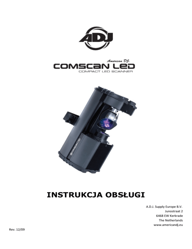 INSTRUKCJA OBSŁUGI A.D.J. Supply Europe B.V. Junostraat 2 6468 EW Kerkrade The Netherlands www.americandj.eu Rev. 12/09 Spis treści INFORMACJE OGÓLNE ............................................................................................................................................................ 3 WSKAZÓWKI OGÓLNE ............................................................................................................................................................ 3 CHARAKTERYSTYKA ................................................................................................................................................................. 3 BEZPIECZNA OBSŁUGA ............................................................................................................................................................ 3 ŚRODKI BEZPIECZEŃSTWA ...................................................................................................................................................... 4 USTAWIENIA ........................................................................................................................................................................... 5 MENU SYSTEMU – TABELA ..................................................................................................................................................... 7 MENU SYSTEMU ..................................................................................................................................................................... 8 DZIAŁANIE ............................................................................................................................................................................... 9 STEROWANIE KONSOLĄ UC3 ................................................................................................................................................ 12 WARTOŚCI I FUNKCJE DMX ................................................................................................................................................... 13 WYMIANA BEZPIECZNIKA ..................................................................................................................................................... 14 CZYSZCZENIA ......................................................................................................................................................................... 14 USUWANIE USTEREK............................................................................................................................................................. 14 SPECYFIKACJA ....................................................................................................................................................................... 15 ROHS ORAZ WEEE ................................................................................................................................................................. 16 A.D.J. Supply Europe B.V. – www.americandj.eu – Comscan LED™ Instrukcja Obsługi str. 2 INTRODUCTION INFORMACJE OGÓLNE Wypakowanie: Dziękujemy za zakup urządzenia świetlnego Comscan LED firmy American DJ®. Każdy egzemplarz Comscan LED został gruntownie przetestowany, co jest gwarancją jego prawidłowego funkcjonowania. Przed rozpakowaniem należy sprawdzić czy opakowanie nie zostało uszkodzone w czasie transportu. W razie stwierdzenia uszkodzenia opakowania, dokładnie sprawdź, czy nie nastąpiło uszkodzenie sprzętu oraz upewnij się, że wszystkie części konieczne do obsługi urządzenia przybyły w stanie nienaruszonym. W razie stwierdzenia usterek lub braku części, należy skontaktować się z bezpłatnym biurem obsługi klienta. Prosimy o taki kontakt przed podjęciem decyzji o zwrocie urządzenia do sprzedawcy. Wstęp: Comscan LED jest pięciokanałowym inteligentnym skanerem LED kompatybilnym z systemem DMX. Urządzenie może być używane samodzielnie w trybie Stand Alone lub w konfiguracji Master/Slave. Comscan LED posiada trzy tryby operacyjne: tryb reakcji na dźwięk (Sound Active Mode), tryb pokazu (Show Mode) oraz tryb sterowania sygnałem DMX. W celu osiągnięcia lepszych efektów poprzez poprawienie widoczności projektowanej wiązki światła, należy równocześnie użyć maszyny mgielnej lub dymu do efektów specjalnych. Obsługa klienta: W razie jakichkolwiek problemów, prosimy o kontakt z zaufanym punktem sprzedaży American Audio. Istnieje również możliwość bezpośredniego kontaktu z nami. Można to zrobić poprzez naszą stronę internetową www.americandj.eu oraz pisząc na adres: [email protected]. W celu zakupu części w sieci, zapraszamy na stronę http://parts.americandj.com Ostrzeżenie! Aby zapobiec lub zmniejszyć ryzyko porażenia prądem lub pożaru, nie włączaj urządzenia w warunkach deszczowych lub przy podwyższonej wilgotności powietrza. Ostrzeżenie! Urządzenie może poważnie uszkodzić wzrok. Nie należy patrzeć bezpośrednio na źródło światła. WSKAZÓWKI OGÓLNE Aby w pełni wykorzystać możliwości urządzenia, prosimy o przeczytanie instrukcji obsługi i zapoznanie z podstawowymi funkcjami urządzenia. Instrukcja zawiera ważne informacje dotyczące bezpieczeństwa obsługi oraz sposobu konserwacji urządzenia. Prosimy o zachowanie instrukcji obsługi w celu ponownego użycia. CHARAKTERYSTYKA • Kompatybilny z Protokołem DMX-512 (5 Kanałów DMX) • Ruchy Lustra w Poziomie/Pionie (X/Y) • 3 Tryby Operacyjne – Reakcja na Dźwięk (Sound Active), Pokaz (Show) i Kontrola Sygnałem DMX • Mikrofon Wewnętrzny • Cyfrowy Wyświetlacz dla Ustawienia Adresów i Funkcji • Kompatybilny z konsolą UC3 (sprzedawana osobno) BEZPIECZNA OBSŁUGA Uwaga! Urządzenie nie zawiera żadnych elementów przeznaczonych do serwisowania przez użytkownika. Gwarancja na urządzenie traci ważność, jeśli użytkownik zdecyduje się na samowolną naprawę którejkolwiek z cz