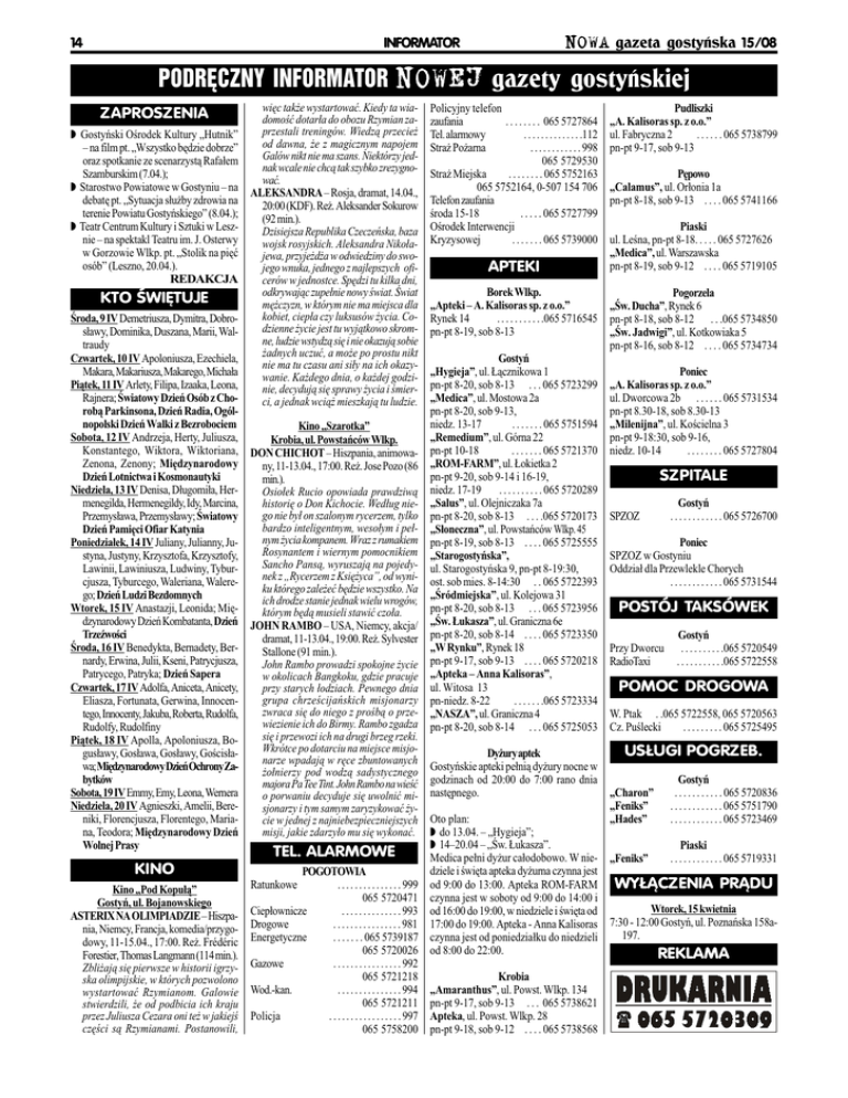 14 INFORMATOR NOWA gazeta gostyñska 15/08 PODRÊCZNY INFORMATOR NOWEJ gazety gostyñskiej ZAPROSZENIA w Gostyñski Orodek Kultury Hutnik na film pt. Wszystko bêdzie dobrze oraz spotkanie ze scenarzyst¹ Rafa³em Szamburskim (7.04.); w Starostwo Powiatowe w Gostyniu na debatê pt. Sytuacja s³u¿by zdrowia na terenie Powiatu Gostyñskiego (8.04.); w Teatr Centrum Kultury i Sztuki w Lesznie na spektakl Teatru im. J. Osterwy w Gorzowie Wlkp. pt. Stolik na piêæ osób (Leszno, 20.04.). REDAKCJA KTO WIÊTUJE wiêc tak¿e wystartowaæ. Kiedy ta wiadomoæ dotar³a do obozu Rzymian zaprzestali treningów. Wiedz¹ przecie¿ od dawna, ¿e z magicznym napojem Galów nikt nie ma szans. Niektórzy jednak wcale nie chc¹ tak szybko zrezygnowaæ. ALEKSANDRA Rosja, dramat, 14.04., 20:00 (KDF). Re¿. Aleksander Sokurow (92 min.). Dzisiejsza Republika Czeczeñska, baza wojsk rosyjskich. Aleksandra Niko³ajewa, przyje¿d¿a w odwiedziny do swojego wnuka, jednego z najlepszych oficerów w jednostce. Spêdzi tu kilka dni, odkrywaj¹c zupe³nie nowy wiat. wiat mê¿czyzn, w którym nie ma miejsca dla kobiet, ciep³a czy luksusów ¿ycia. Codzienne ¿ycie jest tu wyj¹tkowo skromne, ludzie wstydz¹ siê i nie okazuj¹ sobie ¿adnych uczuæ, a mo¿e po prostu nikt nie ma tu czasu ani si³y na ich okazywanie. Ka¿dego dnia, o ka¿dej godzinie, decyduj¹ siê sprawy ¿ycia i mierci, a jednak wci¹¿ mieszkaj¹ tu ludzie. Policyjny telefon zaufania . . . . . . . . 065 5727864 Tel. alarmowy . . . . . . . . . . . . . .112 Stra¿ Po¿arna . . . . . . . . . . . . 998 065 5729530 Stra¿ Miejska . . . . . . . . 065 5752163 065 5752164, 0-507 154 706 Telefon zaufania roda 15-18 . . . . . 065 5727799 Orodek Interwencji Kryzysowej . . . . . . . 065 5739000 APTEKI Pudliszki A. Kalisoras sp. z o.o. ul. Fabryczna 2 . . . . . . 065 5738799 pn-pt 9-17, sob 9-13 Pêpowo Calamus, ul. Or³onia 1a pn-pt 8-18, sob 9-13 . . . . 065 5741166 Piaski ul. Lena, pn-pt 8-18. . . . . 065 5727626 Medica, ul. Warszawska pn-pt 8-19, sob 9-12 . . . . 065 5719105 Borek Wlkp. Pogorzela Apteki A. Kalisoras sp. z o.o. w. Ducha, Rynek 6 Rynek 14 . . . . . . . . . . .065 5716545 pn-pt 8-18, sob 8-12 . . .065 5734850 pn-pt 8-19, sob 8-13 w. Jadwigi, ul. Kotkowiaka 5 pn-pt 8-16, sob 8-12 . . . . 065 5734734 Gostyñ Hygieja, ul. £¹cznikowa 1 Poniec pn-pt 8-20, sob 8-13 . . . 065 5723299 A. Kalisoras sp. z o.o. Medica, ul. Mostowa 2a ul. Dworcowa 2b . . . . . . 065 5731534 pn-pt 8-20, sob 9-13, pn-pt 8.30-18, sob 8.30-13 niedz. 13-17 . . . . . . . 065 5751594 Milenijna, ul. Kocielna 3 Remedium, ul. Górna 22 pn-pt 9-18:30, sob 9-16, pn-pt 10-18 . . . . . . . 065 5721370 niedz. 10-14 . . . . . . . . 065 5727804 ROM-FARM, ul. £okietka 2 SZPITALE pn-pt 9-20, sob 9-14 i 16-19, niedz. 17-19 . . . . . . . . . . 065 5720289 Salus, ul. Olejniczaka 7a Gostyñ pn-pt 8-20, sob 8-13 . . . .065 5720173 SPZOZ . . . . . . . . . . . . 065 5726700 S³oneczna, ul. Powstañców Wlkp. 45 pn-pt 8-19, sob 8-13 . . . . 065 5725555 Poniec Starogostyñska, SPZOZ w Gostyniu ul. Starogostyñska 9, pn-pt 8-19:30, Oddzia³ dla Przewlekle Chorych ost. sob mies. 8-14:30 . . 065 5722393 . . . . . . . . . . . . 065 5731544 ródmiejska, ul. Kolejowa 31 POSTÓJ TAKSÓWEK pn-pt 8-20, sob 8-13 . . . 065 5723956 w. £ukasza, ul. Graniczna 6e pn-pt 8-20, sob 8-14 . . . . 065 5723350 Gostyñ W Rynku, Rynek 18 Przy Dworcu . . . . . . . . . .065 5720549 pn-pt 9-17, sob 9-13 . . . . 065 5720218 RadioTaxi . . . . . . . . . . .065 5722558 Apteka Anna Kalisoras, POMOC DROGOWA ul. Witosa 13 pn-niedz. 8-22 . . . . . . .065 5723334 NASZA, ul. Graniczna 4 W. Ptak . .065 5722558, 065 5720563 pn-pt 8-20, sob 8-14 . . . 065 5725053 Cz. Pulecki . . . . . . . . . 065 5725495 roda, 9 IV Demetriusza, Dymitra, Dobros³awy, Dominika, Duszana, Marii, Waltraudy Czwartek, 10 IV Apoloniusza, Ezechiela, Makara, Makariusza, Makarego, Micha³a Pi¹tek, 11 IV Arlety, Filipa, Izaaka, Leona, Rajnera; wiatowy Dzieñ Osób z Chorob¹ Parkinsona, Dzieñ Radia, Ogólnopolski Dzieñ Walki z Bezrobociem Kino Szarotka Sobota, 12 IV Andrzeja, Herty, Juliusza, Krobia, ul. Powstañców Wlkp. Konstantego, Wiktora, Wiktoriana, DON CHICHOT Hiszpania, animowaZenona, Zenony; Miêdzynarodowy ny, 11-13.04., 17:00. Re¿. Jose Pozo (86 Dzieñ Lotnictwa i Kosmonautyki min.). Niedziela, 13 IV Denisa, D³ugomi³a, HerOsio³ek Rucio opowiada prawdziw¹ menegilda, Hermenegildy, Idy, Marcina, historiê o Don Kichocie. Wed³ug niego nie by³ on szalonym rycerzem, tylko Przemys³awa, Przemys³awy; wiatowy bardzo inteligentnym, weso³ym i pe³Dzieñ Pamiêci Ofiar Katynia nym ¿ycia kompanem. Wraz z rumakiem Poniedzia³ek, 14 IV Juliany, Julianny, JuRosynantem i wiernym pomocnikiem styna, Justyny, Krzysztofa, Krzysztofy, Sancho Pans¹, wyruszaj¹ na pojedyLawinii, Lawiniusza, Ludwiny, Tyburnek z Rycerzem z Ksiê¿yca, od wynicjusza, Tyburcego, Waleriana, Walereku którego zale¿eæ bêdzie wszystko. Na go; Dzieñ Ludzi Bezdomnych ich drodze stanie jednak wielu wrogów, Wtorek, 15 IV Anastazji, Leonida; Miêktórym bêd¹ musieli stawiæ czo³a. dzynarodowy Dzieñ Kombatanta, Dzieñ JOHN RAMBO USA, Niemcy, akcja/ Trzewoci dramat, 11-13.04., 19:00. Re¿. Sylvester roda, 16 IV Benedykta, Bernadety, BerStallone (91 min.). nardy, Erwina, Julii, Kseni, Patrycjusza, John Rambo prowadzi spokojne ¿ycie Patrycego, Patryka; Dzieñ Sapera w okolicach Bangkoku, gdzie pracuje Czwartek, 17 IV Adolfa, Aniceta, Anicety, przy starych ³odziach. Pewnego dnia grupa chrzecijañskich misjonarzy Eliasza, Fortunata, Gerwina, Innocenzwraca siê do niego z prob¹ o przetego, Innocenty, Jakuba, Roberta, Rudolfa, wiezienie ich do Birmy. Rambo zgadza Rudolfy, Rudolfiny siê i przewozi ich na drugi brzeg rzeki. Pi¹tek, 18 IV Apolla, Apoloniusza, BoWkrótce po dotarciu na miejsce misjogus³awy, Gos³awa, Gos³awy, Gocis³aDy¿ury aptek narze wpadaj¹ w rêce zbuntowanych wa; Miêdzynarodowy Dzieñ Ochrony Za¿o³nierzy pod wodz¹ sadystycznego Gostyñskie apteki pe³ni¹ d