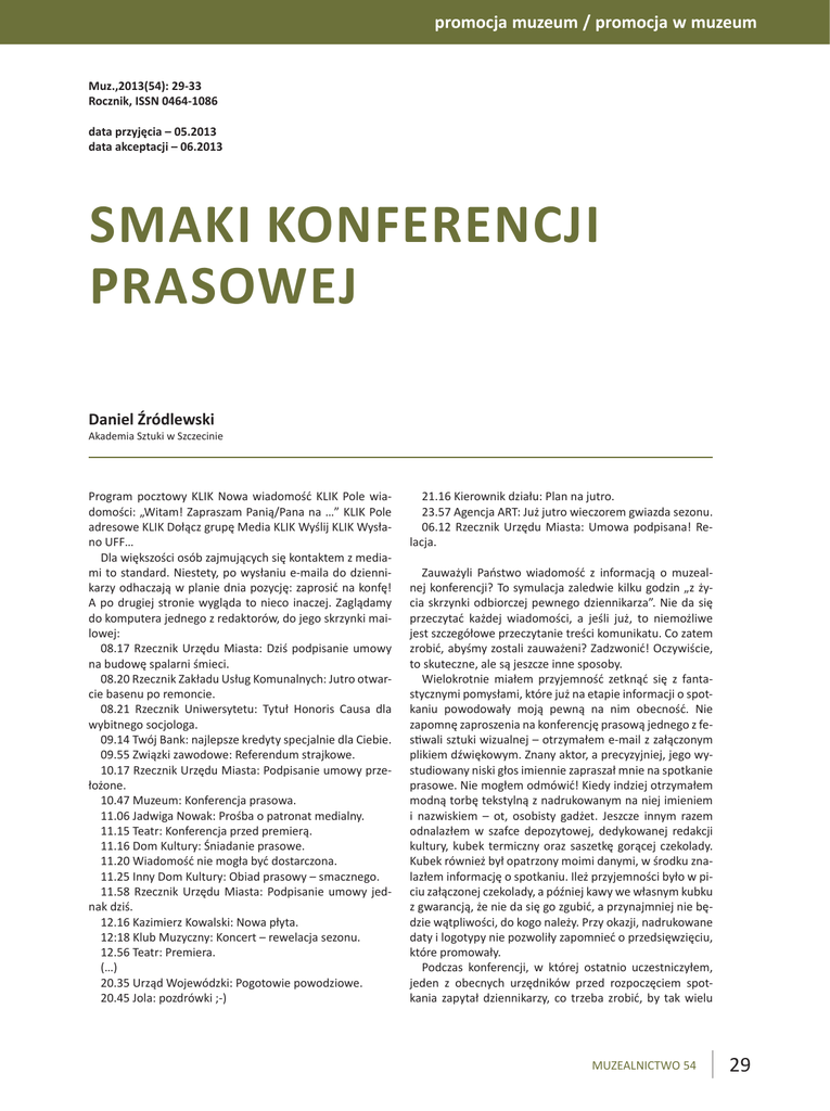promocja muzeum / promocja w muzeum Muz.,2013(54): 29-33 Rocznik, ISSN 0464-1086 data przyjęcia – 05.2013 data akceptacji – 06.2013 SMAKI KONFERENCJI PRASOWEJ Daniel Źródlewski Akademia Sztuki w Szczecinie Program pocztowy KLIK Nowa wiadomość KLIK Pole wiadomości: „Witam! Zapraszam Panią/Pana na …” KLIK Pole adresowe KLIK Dołącz grupę Media KLIK Wyślij KLIK Wysłano UFF… Dla większości osób zajmujących się kontaktem z mediami to standard. Niestety, po wysłaniu e-maila do dziennikarzy odhaczają w planie dnia pozycję: zaprosić na konfę! A po drugiej stronie wygląda to nieco inaczej. Zaglądamy do komputera jednego z redaktorów, do jego skrzynki mailowej: 08.17 Rzecznik Urzędu Miasta: Dziś podpisanie umowy na budowę spalarni śmieci. 08.20 Rzecznik Zakładu Usług Komunalnych: Jutro otwarcie basenu po remoncie. 08.21 Rzecznik Uniwersytetu: Tytuł Honoris Causa dla wybitnego socjologa. 09.14 Twój Bank: najlepsze kredyty specjalnie dla Ciebie. 09.55 Związki zawodowe: Referendum strajkowe. 10.17 Rzecznik Urzędu Miasta: Podpisanie umowy przełożone. 10.47 Muzeum: Konferencja prasowa. 11.06 Jadwiga Nowak: Prośba o patronat medialny. 11.15 Teatr: Konferencja przed premierą. 11.16 Dom Kultury: Śniadanie prasowe. 11.20 Wiadomość nie mogła być dostarczona. 11.25 Inny Dom Kultury: Obiad prasowy – smacznego. 11.58 Rzecznik Urzędu Miasta: Podpisanie umowy jednak dziś. 12.16 Kazimierz Kowalski: Nowa płyta. 12:18 Klub Muzyczny: Koncert – rewelacja sezonu. 12.56 Teatr: Premiera. (…) 20.35 Urząd Wojewódzki: Pogotowie powodziowe. 20.45 Jola: pozdrówki ;-) 21.16 Kierownik działu: Plan na jutro. 23.57 Agencja ART: Już jutro wieczorem gwiazda sezonu. 06.12 Rzecznik Urzędu Miasta: Umowa podpisana! Relacja. Zauważyli Państwo wiadomość z informacją o muzealnej konferencji? To symulacja zaledwie kilku godzin „z życia skrzynki odbiorczej pewnego dziennikarza”. Nie da się przeczytać każdej wiadomości, a jeśli już, to niemożliwe jest szczegółowe przeczytanie treści komunikatu. Co zatem zrobić, abyśmy zostali zauważeni? Zadzwonić! Oczywiście, to skuteczne, ale są jeszcze inne sposoby. Wielokrotnie miałem przyjemność zetknąć się z fantastycznymi pomysłami, które już na etapie informacji o spotkaniu powodowały moją pewną na nim obecność. Nie zapomnę zaproszenia na konferencję prasową jednego z fes wali sztuki wizualnej – otrzymałem e-mail z załączonym plikiem dźwiękowym. Znany aktor, a precyzyjniej, jego wystudiowany niski głos imiennie zapraszał mnie na spotkanie prasowe. Nie mogłem odmówić! Kiedy indziej otrzymałem modną torbę tekstylną z nadrukowanym na niej imieniem i nazwiskiem – ot, osobisty gadżet. Jeszcze innym razem odnalazłem w szafce depozytowej, dedykowanej redakcji kultury, kubek termiczny oraz saszetkę gorącej czekolady. Kubek również był opatrzony moimi danymi, w środku znalazłem informację o spotkaniu. Ileż przyjemności było w piciu załączonej czekolady, a później kawy we własnym kubku z gwarancją, że nie da się go zgubić, a przynajmniej nie będzie wątpliwości, do kogo należy. Przy okazji, nadrukowane daty i logotypy nie pozwoliły zapomnieć o przedsięwzięciu, które promowały. Podczas konferencji, w której ostatnio uczestniczyłem, jeden z obecnych urzędników przed rozpoczęciem spotkania zapytał dziennikarzy, co trzeba zrobić, by tak wielu MUZEALNICTWO 54 29 redaktorów się zjawiło. Usłyszał jednogłos – gadżety, prezenty, bilety na omawiane wydarzenie i catering. Wniosek jest jeden: w pierwszym etapie naszej pracy liczy się nie wartość merytoryczna, lecz oryginalność. Warto też zaproponować coś niezwykłego. Jeśli mówimy o instytucji muzealnej, zwabmy dziennikarzy np. przedpremierową prezentacją dzieła lub zagwarantujmy wejście do przestrzeni na co dzień niedostępnych. Im większa atrakcja, tym większa pewność obecności dziennikarzy. Warto także pamiętać, że publikacja po naszym spotkaniu obok słowa pisanego czy mówionego zawierać będzie również zdjęcia lub film. Przy doborze atrakcji nie należy jednak przesadzić. Ich dobór pozostawiam Państwa wyczuciu i dobremu smakowi… Smak konferencji A skoro o smaku… Tak, tak… konferencja MOŻE smakować, a MUSI kusić, mało tego − jej smak powinien być odczuwalny długo po spożyciu… Nie myślę tu o popularnej odmianie gruszki Konferencji (faktycznie smacznej), lecz o pewnym pozornie nieistotnym, a w rzeczywistości jednym z najważniejszych punktów prasowego spotkania. Nieodłącznym elementem każdej niemal konferencji, sesji, seminarium jest… kawa lub skromny poczęstunek. Proszę zauważyć, gdzie koncentruje się przed- i pokonferencyjne życie dziennikarzy i uczestników spotkania. Przy stole! Z własnego doświadczenia i obserwacji wiem, że na jednego dziennikarza przypadają co najmniej dwie kawy (wypite przed i po spotkaniu). Z tego samego źródła wiem, jak istotny jest smak i jakość podawanego poczęstunku. Tam, gdzie kawa niesmaczna, nie chodzi się. A plotka szybsza niż życie, ta zachwalająca nasze smaki także! Nie każda z instytucji dysponuje ciśnieniowym ekspresem, nie każdą stać na wynajęcie profesjonalnej obsługi cateringowej, ale każdą z instytucji powinno być stać na kupno dobrej kawy. Dobra oznacza nie tyle droga, co droższa od tych najtańszych, ale biorąc pod uwagę powyższe – to jedna z najbardziej trafionych inwestycji. A do tego organizator też może skorzystać… Banalne? Być może, ale jakże istotne. Kawa ze stołu, a na stole… Kawa czy poczęstunek stoi na stole. Zainspirowany tym faktem, poniższe uwagi pragnę poświęcić meblowi, bez którego konferencji zorganizować nie sposób. Tak jak krzesło na 30 MUZEALNICTWO 54 scenie w przedstawieniu teatralnym, tak stół na konferencji prasowej to podstawa. To pewne i oczywiste, ale pewne i proste nie jest już gdzie powinien stać ów mebel i 