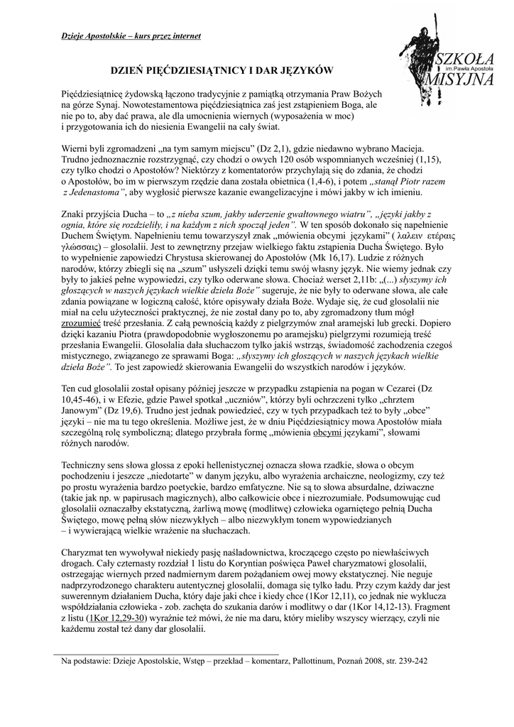 Dzieje Apostolskie – kurs przez internet DZIEŃ PIĘĆDZIESIĄTNICY I DAR JĘZYKÓW Pięćdziesiątnicę żydowską łączono tradycyjnie z pamiątką otrzymania Praw Bożych na górze Synaj. Nowotestamentowa pięćdziesiątnica zaś jest zstąpieniem Boga, ale nie po to, aby dać prawa, ale dla umocnienia wiernych (wyposażenia w moc) i przygotowania ich do niesienia Ewangelii na cały świat. Wierni byli zgromadzeni „na tym samym miejscu” (Dz 2,1), gdzie niedawno wybrano Macieja. Trudno jednoznacznie rozstrzygnąć, czy chodzi o owych 120 osób wspomnianych wcześniej (1,15), czy tylko chodzi o Apostołów? Niektórzy z komentatorów przychylają się do zdania, że chodzi o Apostołów, bo im w pierwszym rzędzie dana została obietnica (1,4-6), i potem „stanął Piotr razem z Jedenastoma”, aby wygłosić pierwsze kazanie ewangelizacyjne i mówi jakby w ich imieniu. Znaki przyjścia Ducha – to „z nieba szum, jakby uderzenie gwałtownego wiatru”, „języki jakby z ognia, które się rozdzieliły, i na każdym z nich spoczął jeden”. W ten sposób dokonało się napełnienie Duchem Świętym. Napełnieniu temu towarzyszył znak „mówienia obcymi językami” ( λαλειν ετεραις γλωσσαις) – glosolalii. Jest to zewnętrzny przejaw wielkiego faktu zstąpienia Ducha Świętego. Było to wypełnienie zapowiedzi Chrystusa skierowanej do Apostołów (Mk 16,17). Ludzie z różnych narodów, którzy zbiegli się na „szum” usłyszeli dzięki temu swój własny język. Nie wiemy jednak czy były to jakieś pełne wypowiedzi, czy tylko oderwane słowa. Chociaż werset 2,11b: „(...) słyszymy ich głoszących w naszych językach wielkie dzieła Boże” sugeruje, że nie były to oderwane słowa, ale całe zdania powiązane w logiczną całość, które opisywały działa Boże. Wydaje się, że cud glosolalii nie miał na celu użyteczności praktycznej, że nie został dany po to, aby zgromadzony tłum mógł zrozumieć treść przesłania. Z całą pewnością każdy z pielgrzymów znał aramejski lub grecki. Dopiero dzięki kazaniu Piotra (prawdopodobnie wygłoszonemu po aramejsku) pielgrzymi rozumieją treść przesłania Ewangelii. Glosolalia dała słuchaczom tylko jakiś wstrząs, świadomość zachodzenia czegoś mistycznego, związanego ze sprawami Boga: „słyszymy ich głoszących w naszych językach wielkie dzieła Boże”. To jest zapowiedź skierowania Ewangelii do wszystkich narodów i języków. Ten cud glosolalii został opisany później jeszcze w przypadku zstąpienia na pogan w Cezarei (Dz 10,45-46), i w Efezie, gdzie Paweł spotkał „uczniów”, którzy byli ochrzczeni tylko „chrztem Janowym” (Dz 19,6). Trudno jest jednak powiedzieć, czy w tych przypadkach też to były „obce” języki – nie ma tu tego określenia. Możliwe jest, że w dniu Pięćdziesiątnicy mowa Apostołów miała szczególną rolę symboliczną; dlatego przybrała formę „mówienia obcymi językami”, słowami różnych narodów. Techniczny sens słowa glossa z epoki hellenistycznej oznacza słowa rzadkie, słowa o obcym pochodzeniu i jeszcze „niedotarte” w danym języku, albo wyrażenia archaiczne, neologizmy, czy też po prostu wyrażenia bardzo poetyckie, bardzo emfatyczne. Nie są to słowa absurdalne, dziwaczne (takie jak np. w papirusach magicznych), albo całkowicie obce i niezrozumiałe. Podsumowując cud glosolalii oznaczałby ekstatyczną, żarliwą mowę (modlitwę) człowieka ogarniętego pełnią Ducha Świętego, mowę pełną słów niezwykłych – albo niezwykłym tonem wypowiedzianych – i wywierającą wielkie wrażenie na słuchaczach. Charyzmat ten wywoływał niekiedy pasję naśladownictwa, kroczącego często po niewłaściwych drogach. Cały czternasty rozdział 1 listu do Koryntian poświęca Paweł charyzmatowi glosolalii, ostrzegając wiernych przed nadmiernym darem pożądaniem owej mowy ekstatycznej. Nie neguje nadprzyrodzonego charakteru autentycznej glosolalii, domaga się tylko ładu. Przy czym każdy dar jest suwerennym działaniem Ducha, który daje jaki chce i kiedy chce (1Kor 12,11), co jednak nie wyklucza współdziałania człowieka - zob. zachęta do szukania darów i modlitwy o dar (1Kor 14,12-13). Fragment z listu (1Kor 12,29-30) wyraźnie też mówi, że nie ma daru, który mieliby wszyscy wierzący, czyli nie każdemu został też dany dar glosolalii. Na podstawie: Dzieje Apostolskie, Wstęp – przekład – komentarz, Pallottinum, Poznań 2008, str. 239-242