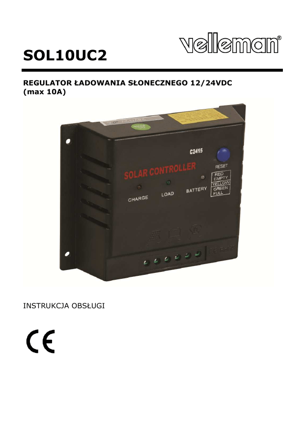 SOL10UC2 REGULATOR ŁADOWANIA SŁONECZNEGO 12/24VDC (max 10A) INSTRUKCJA OBSŁUGI * nie załączone Instrukcja obsługi 1. Wstęp Niniejsza instrukcja przeznaczona jest dla użytkowników w krajach Unii Europejskiej. Ważne informacje dotyczące środowiska. Niniejszy symbol umieszczony na urządzeniu bądź opakowaniu oznacza, że wyrzucenie produktu może być szkodliwe dla środowiska. Nie umieszczać zużytych urządzeń bądź baterii w zwykłych pojemnikach na odpady. W tym celu należy skontaktować się z firmą zajmującą się recyklingiem. Urządzenie można przekazać dystrybutorowi lub firmie zajmującej się recyklingiem. Należy przestrzegać lokalnych przepisów dotyczącymi ochrony środowiska. W przypadku wątpliwości należy skontaktować się z lokalną firmą zajmującą się utylizacją odpadów! Dziękujemy za zakup produktu Velleman Przed rozpoczęciem użytkowania prosimy o dokładne zapoznanie się z instrukcją obsługi. SOL10UC2 to regulator ładowania słonecznego, zaprojektowany do optymalnego przeprowadzania prądu z i do baterii. 2. Instrukcje bezpieczeństwa Tylko do użytku w pomieszczeniach. Trzymać urządzenie z dala od deszczu, wilgoci, rozpryskujących się lub kapiących płynów. Chronić urządzenie przed dzieci i nieupoważnionymi użytkownikami. Podczas instalacji należy zachować szczególną ostrożność: dotknięcie przewodów pod napięciem może prowadzić do zagrażającego życiu porażenia prądem elektrycznym. Wewnątrz urządzenia nie ma żadnych części, które użytkownik mógłby serwisować samodzielnie. W razie konieczności serwisowania lub wymiany części, skontaktować się z autoryzowanym dealerem. 3. Wskazόwki ogόlne Proszę zapoznać się z Velleman® usługi i gwarancja jakości na końcu niniejszej instrukcji. Tylko do użytku w pomieszczeniach. Trzymać urządzenie z dala od deszczu, wilgoci, rozpryskujących się lub kapiących płynów. Chronić urządzenie przed zbyt ekstremalną temperaturą i pyłem. Nie zakrywaj i nie stawiaj nic na urządzeniu aby uniknąć przegrzania. Chronić urządzenie przed wstrząsami i niezgodnym z przeznaczeniem użyciem. Podczas obsługi urządzenia unikać używania siły. • Przed rozpoczęciem pracy z urządzeniem należy zapoznać się z jego funkcjami. • Nie wolno wprowadzać zmian w urządzeniu. • Urządzenie należy używać jedynie zgodnie z przeznaczeniem. Używanie urządzenia niezgodnie z przeznaczeniem spowoduje unieważnienie gwarancji. • Używanie urządzenia niezgodnie z przeznaczeniem spowoduje unieważnienie gwarancji. Dystrybutor nie podejmie odpowiedzialności wynikających z usterek spowodowanych niepoprawnym użytkowaniem urządzenia. • Zachowaj instrukcję obsługi do wykorzystania w przyszłości. • Nie należy używać poza wyszczególnionymi w specyfikacji technicznej parametrami. • Ani Velleman ani jego dystrybutorzy nie ponoszą odpowiedzialności za szkody (nadzwyczajne, przypadkowe lub pośrednie) – o różnym charakterze (finansowym, fizycznym…) powstałe w wyniku posiadania, użytkowania lub awarii produktu. 4. Przegląd Patrz rysunki na stronie 2 niniejszej instrukcji. 1 2 3 4 wskaźnik naładowania wskaźnik obciążenia stan akumulatora złącza panelu słonecznego Ustawienia 5. 5 6 7 c a panel słoneczny* d b akumulator* e złącza akumulatora złącza obciążenia prądem stałym DC przycisk resetowania przetwornica DC/AC* obciążenie prądem stałym DC* obciążenie prądem zmiennym AC* *Nie jest elementem zestawu Montaż • Zamocować regulator za pomocą 4 otworów montażowych w chłodnym, przewiewnym i • • • • suchym miejscu. W celu łatwiejszego montażu zastosować montażowe M4x20 (nie są elementem zestawu). Podłączyć akumulator [b] (nie jest elementem zestawu) do złączy [5]. Należy zwrócić uwagę na biegunowość! Uwaga: Zastosować zaizolowany wielożyłowy przewód miedziany maks. 2,5mm² o żyle ±5mm. Następnie podłączyć panel słoneczny [a] (nie jest elementem zestawu) do złączy [4]. Należy upewnić się, że panel słoneczny jest zgodny ze specyfikacjami regulatora. Należy zwrócić uwagę na biegunowość! Na końcu podłączyć obciążenie prądem stałym [d] (nie jest elementem zestawu) do złączy [6]. Należy upewnić się, że przyłączane obciążenie jest zgodne ze specyfikacjami regulatora oraz że jest wyłączone. Należy zwrócić uwagę na biegunowość! Podczas podłączania obciążenia prądem zmiennym [e] (nie jest elementem zestawu), pomiędzy akumulatorem [b] i zasilaniem [e] należy zamontować odpowiednią przetwornicę DC/AC [c] (nie jest elementem zestawu). Nie powodować zwarcia ani nie odwracać biegunowości akumulatora, panelu słonecznego lub obciążenia, gdyż może prowadzić to do nieodwracalnych uszkodzeń. • Aby odłączyć regulator, należy najpierw odłączyć panel słoneczny [a], następnie obciążenie [d lub e], a na końcu akumulator [b]. • Należy zwrócić uwagę, że krótsze przewody przyłączeniowe zredukują straty mocy. 6. Tryby zabezpieczeń • Tryb ochrony przed nadmiernym rozładowaniem. Tryb ten uruchomi się, gdy • • • • napięcie akumulatora będzie zbyt niskie. Zasilanie doprowadzane do złączy wyjściowych jest odcinane w celu ochrony przed uszkodzeniem akumulatora. Należy usunąć ładunek ze złącza i poczekać na pełne naładowanie akumulatora. Tryb ochrony przed przeładowaniem. Tryb ten uruchomi się, gdy napięcie akumulatora będzie zbyt wysokie. Zasilanie doprowadzane ze złącza wejściowego panelu słonecznego jest odcinane w celu ochrony przed uszkodzeniem akumulatora do momentu uzyskania zadowalającego poziomu napięcia. Tryb ochrony przed przeciążeniem. Tryb ten uruchomi się, gdy obciążenie przekracza 10 A. Tryb ochrony przed zwarciem. Uruchamia, gdy wykryto zwarcie obciążenia. Ochrona przed odwróceniem biegunowości: Aby zapobiec ewentualnemu uszkodzeniu, regulator nie będzie działać, g