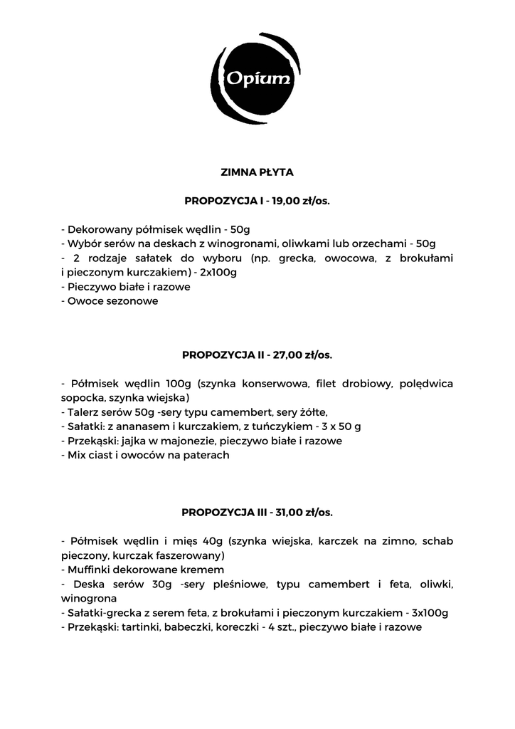 ZIMNA PŁYTA PROPOZYCJA I - 19,00 zł/os. - Dekorowany półmisek wędlin - 50g - Wybór serów na deskach z winogronami, oliwkami lub orzechami - 50g - 2 rodzaje sałatek do wyboru (np. grecka, owocowa, z brokułami i pieczonym kurczakiem) - 2x100g - Pieczywo białe i razowe - Owoce sezonowe PROPOZYCJA II - 27,00 zł/os. - Półmisek wędlin 100g (szynka konserwowa, filet drobiowy, polędwica sopocka, szynka wiejska) - Talerz serów 50g -sery typu camembert, sery żółte, - Sałatki: z ananasem i kurczakiem, z tuńczykiem - 3 x 50 g - Przekąski: jajka w majonezie, pieczywo białe i razowe - Mix ciast i owoców na paterach PROPOZYCJA III - 31,00 zł/os. - Półmisek wędlin i mięs 40g (szynka wiejska, karczek na zimno, schab pieczony, kurczak faszerowany) - Muffinki dekorowane kremem - Deska serów 30g -sery pleśniowe, typu camembert i feta, oliwki, winogrona - Sałatki-grecka z serem feta, z brokułami i pieczonym kurczakiem - 3x100g - Przekąski: tartinki, babeczki, koreczki - 4 szt., pieczywo białe i razowe Minimalna kwota zamówienia 500zł (brutto), zamówienia przyjmujemy min. 7 dni przed realizacją oferty. Zastrzegamy sobie prawo doliczenia do ceny końcowej dodatkowych usług/serwisu - kwota ustalana indywidualnie w trakcie zamówienia. Opium Music Club ul. Jakuba 19 31-057 Kraków tel.: (12) 421-94-61 e-mail: [email protected]
