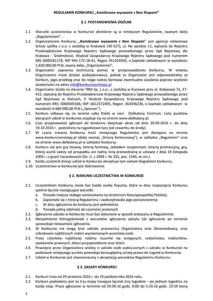 REGULAMIN KONKURSU ,,Komiksowe wyzwanie z Non Stopami” § 1. POSTANOWIENIA OGÓLNE 1.1. Warunki uczestnictwa w Konkursie określone są w niniejszym Regulaminie, zwanym dalej „Regulaminem”. 1.2. Organizatorem Konkursu ,,Komiksowe wyzwanie z Non Stopami” jest agencja reklamowa Schulz spółka z o.o. z siedzibą w Krakowie (30-527), ul. Na zjeździe 11, wpisana do Rejestru Przedsiębiorców Krajowego Rejestru Sądowego prowadzonego przez Sąd Rejonowy dla Krakowa - Śródmieście, Wydział Gospodarczy Krajowego Rejestru Sądowego pod numerem KRS 0000181178, NIP 945-172-18-41, Regon 351324593, o kapitale zakładowym w wysokości 1.630.000,00 PLN, zwana dalej „Organizatorem”. 1.3. Organizator zapewnia techniczną pomoc w przeprowadzeniu Konkursu. W imieniu Organizatora może działać podwykonawca, jednak to Organizator jest odpowiedzialny za Konkurs, jego przebieg oraz do niego należy kierować ewentualne zażalenia poprzez wysłanie wiadomości na adres [email protected] 1.4. Organizator działa na zlecenie TBM Sp. z o.o., z siedzibą w Kunowie przy ul. Kolejowej 7a, 27415, wpisaną do Rejestru Przedsiębiorców Krajowego Rejestru Sądowego prowadzonego przez Sąd Rejonowy w Kielcach, X Wydział Gospodarczy Krajowego Rejestru Sądowego pod numerem KRS: 0000595506; NIP: 6612372405, Regon: 363436236, o kapitale zakładowym w wysokości 6 660 000,00 PLN (,,Sponsor”). 1.5. Konkurs odbywa się na terenie całej Polski w sieci Delikatesy Centrum. Lista punktów biorących udział w konkursie znajduje się na stronie www.delikatesy.pl. 1.6. Czas przyjmowania zgłoszeń do Konkursu obejmuje okres od dnia 29.09.2016 r. do dnia 19.10.2016 r. podzielony na tygodniowe tury (od czwartku do środy). 1.7. W czasie trwania Konkursu treść niniejszego Regulaminu jest dostępna na stronie www.konkursnonstopy.pl (dalej zwanej „Stroną Konkursową”), w zakładce „Regulamin” oraz na stronie www.delikatesy.pl w zakładce Konkursy. 1.8. Konkurs nie jest grą losową, loterią fantową, zakładem wzajemnym, loterią promocyjną, grą, której wynik zależy od przypadku ani żadną inną przewidzianą w ustawie z dnia 19 listopada 2009 r. o grach hazardowych (Dz. U. z 2009 r. Nr 201, poz. 1540, ze zm.). 1.9. Każdy uczestnik biorąc udział w Konkursie akceptuje tym samym Regulamin Konkursu. 1.10. Uczestnictwo w Konkursie jest dobrowolne. § 2. WARUNKI UCZESTNICTWA W KONKURSIE 2.1. 2.2. 2.3. 2.4. 2.5. 2.6. 2.7. Uczestnikiem Konkursu może być każda osoba fizyczna, która w dniu rozpoczęcia Konkursu spełnia łącznie następujące warunki: a. Posiada miejsce stałego zamieszkania na terytorium Rzeczypospolitej Polskiej; b. Zapoznała się z treścią Regulaminu i zaakceptowała jego postanowienia; c. W dniu zgłoszenia do konkursu jest pełnoletnia d. Posiada pełną zdolność do czynności prawnych Zgłoszenie udziału w Konkursie musi być dokonane w sposób wskazany w Regulaminie. Niespełnienie któregokolwiek z warunków zgłoszenia udziału lub zgłoszenie po terminie spowoduje nieważność zgłoszenia. W Konkursie nie mogą brać udziału pracownicy Organizatora oraz Zleceniodawcy, oraz członkowie najbliższych rodzin wymienionych wcześniej osób. Przez członków najbliższej rodziny rozumie się wstępnych, rodzeństwo, małżonków, opiekunów prawnych, dzieci przysposobione oraz dzieci. Powzięcie przez Organizatora wiedzy o udziale osób wykluczonych z udziału w Konkursie na podstawie niniejszego punktu powoduje bezwzględną utratę prawa do nagród w Konkursie. Udział w Konkursie jest równoznaczny z akceptacją warunków Regulaminu Konkursu. § 3. ZASADY KONKURSU 3.1. 3.2. 1 Konkurs trwa od 29 września 2016 r. do 19 października 2016 roku. Konkurs podzielony jest na trzy etapy trwające łącznie trzy tygodnie – po jednym tygodniu na każdy etap. Prace zgłoszone w terminie od 29.09.16 godz. 0:00 do 5.10.16 godz. 23:59 biorą 3.3. 3.4. 3.5. 3.6. 3.7. 3.8. 3.9. 3.10. 3.11. 3.12. 3.13. 3.14. 3.15. 3.16. 3.17. 3.18. 3.19. 3.20. 3.21. 2 udział w I losowaniu, prace zgłoszone w terminie 6.10.16 godz. 0:00 do 12.10.16 godz. 23:59 biorą udział w II losowaniu, prace zgłoszone w 13.10.16 godz. 0:00 do 19.10.16 godz. 23:59 biorą udział w III losowaniu. Raz w tygodniu będzie odbywał się wybór zwycięskich prac konkursowych i zostaną przyznane nagrody: a. jedna nagroda pierwszego stopnia b. dwie nagrody drugiego stopnia c. trzy nagrody trzeciego stopnia Aby wziąć udział w konkursie należy kupić co najmniej 2 dowolne produkty marki ,,Non Stop” w Delikatesach Centrum znajdujących się na terenie Rzeczypospolitej Polskiej spośród produktów: Non Stop chrupki kukurydziane pizza 70g, Non Stop chrupki kukurydziane zielona cebulka 70g, Non Stop chrupki kukurydziane keczup 70g, Non Stop BACON snaki bekonowe 110g, w okresie trwania konkursu należy wejść na stronę konkursową www.konkursnonstopy.pl i wpisać teksty w dymki znajdujące się w przygotowanym wcześniej szablonie komiksu (foto story z Non Stopami: trzy różne komiksy – po jednym na każdy tydzień trwania zabawy). Po wykonaniu zadania konkursowego należy zapisać zgłoszenie zgodnie ze wskazówkami znajdującymi się na stronie. W ten sposób powstaje Praca konkursowa. Zakup musi być udowodniony na jednym paragonie (zakup co najmniej 2 dowolnych produktów marki ,,Non Stop” potwierdzony na jednym paragonie). W przypadku braku któregoś z produktów wymienionych w pkt. 3.4 sklepie Delikatesy Centrum należy zgłosić taką sytuację pracownikowi sklepu i poprosić o domówienie produktu. Jeden paragon spełniający wymagania niniejszego regulaminu uprawnia do zgłoszenia jednej Pracy konkursowej, bez względu na ilość zestawów produktów biorących udział w promocji, które są na nim uwidocznione. Przedmiotem Konkursu jest wykonanie przez Uczestnika najciekawszego i najbardziej kreatywnego uzupełnienia tekstu komiksów. Po wykonaniu zadania konkursowego należy zapisać zgłoszenie zg