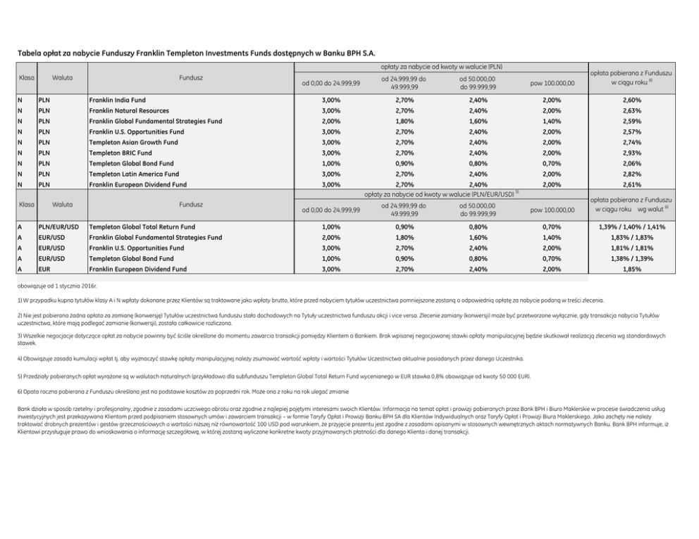 Tabela opłat za nabycie Funduszy Franklin Templeton Investments Funds dostępnych w Banku BPH S.A. opłaty za nabycie od kwoty w walucie (PLN) Klasa Waluta Fundusz od 0,00 do 24.999,99 od 24.999,99 do 49.999,99 od 50.000,00 do 99.999,99 pow 100.000,00 opłata pobierana z Funduszu w ciągu roku 6) N PLN Franklin India Fund 3,00% 2,70% 2,40% 2,00% 2,60% N PLN Franklin Natural Resources 3,00% 2,70% 2,40% 2,00% 2,63% N PLN Franklin Global Fundamental Strategies Fund 2,00% 1,80% 1,60% 1,40% 2,59% N PLN Franklin U.S. Opportunities Fund 3,00% 2,70% 2,40% 2,00% 2,57% N PLN Templeton Asian Growth Fund 3,00% 2,70% 2,40% 2,00% 2,74% N PLN Templeton BRIC Fund 3,00% 2,70% 2,40% 2,00% 2,93% N PLN Templeton Global Bond Fund 1,00% 0,90% 0,80% 0,70% 2,06% N PLN Templeton Latin America Fund 3,00% 2,70% 2,40% 2,00% 2,82% N PLN Franklin European Dividend Fund 3,00% 2,00% 2,61% Klasa Waluta Fundusz 2,70% 2,40% opłaty za nabycie od kwoty w walucie (PLN/EUR/USD) 5) od 0,00 do 24.999,99 od 24.999,99 do 49.999,99 od 50.000,00 do 99.999,99 pow 100.000,00 opłata pobierana z Funduszu w ciągu roku wg walut 6) A PLN/EUR/USD Templeton Global Total Return Fund 1,00% 0,90% 0,80% 0,70% 1,39% / 1,40% / 1,41% A EUR/USD Franklin Global Fundamental Strategies Fund 2,00% 1,80% 1,60% 1,40% 1,83% / 1,83% A EUR/USD Franklin U.S. Opportunities Fund 3,00% 2,70% 2,40% 2,00% 1,81% / 1,81% A EUR/USD Templeton Global Bond Fund 1,00% 0,90% 0,80% 0,70% 1,38% / 1,39% A EUR Franklin European Dividend Fund 3,00% 2,70% 2,40% 2,00% 1,85% obowiązuje od 1 stycznia 2016r. 1) W przypadku kupna tytułów klasy A i N wpłaty dokonane przez Klientów są traktowane jako wpłaty brutto, które przed nabyciem tytułów uczestnictwa pomniejszone zostaną o odpowiednią opłatę za nabycie podaną w treści zlecenia. 2) Nie jest pobierana żadna opłata za zamianę (konwersję) Tytułów uczestnictwa funduszu stało dochodowych na Tytuły uczestnictwa funduszu akcji i vice versa. Zlecenie zamiany (konwersji) może być przetworzone wyłącznie, gdy transakcja nabycia Tytułów uczestnictwa, które mają podlegać zamianie (konwersji), została całkowicie rozliczona. 3) Wszelkie negocjacje dotyczące opłat za nabycie powinny być ściśle określone do momentu zawarcia transakcji pomiędzy Klientem a Bankiem. Brak wpisanej negocjowanej stawki opłaty manipulacyjnej będzie skutkował realizacją zlecenia wg standardowych stawek. 4) Obowiązuje zasada kumulacji wpłat tj. aby wyznaczyć stawkę opłaty manipulacyjnej należy zsumować wartość wpłaty i wartości Tytułów Uczestnictwa aktualnie posiadanych przez danego Uczestnika. 5) Przedziały pobieranych opłat wyrażone są w walutach naturalnych (przykładowo dla subfunduszu Templeton Global Total Return Fund wycenianego w EUR stawka 0,8% obowiązuje od kwoty 50 000 EUR). 6) Opata roczna pobierana z Funduszu określana jest na podstawie kosztów za poprzedni rok. Może ona z roku na rok ulegać zmianie Bank działa w sposób rzetelny i profesjonalny, zgodnie z zasadami uczciwego obrotu oraz zgodnie z najlepiej pojętymi interesami swoich Klientów. Informacja na temat opłat i prowizji pobieranych przez Bank BPH i Biuro Maklerskie w procesie świadczenia usług inwestycyjnych jest przekazywana Klientom przed podpisaniem stosownych umów i zawarciem transakcji – w formie Taryfy Opłat i Prowizji Banku BPH SA dla Klientów Indywidualnych oraz Taryfy Opłat i Prowizji Biura Maklerskiego. Jako zachęty nie należy traktować drobnych prezentów i gestów grzecznościowych o wartości niższej niż równowartość 100 USD pod warunkiem, że przyjęcie prezentu jest zgodne z zasadami opisanymi w stosownych wewnętrznych aktach normatywnych Banku. Bank BPH informuje, iż Klientowi przysługuje prawo do wnioskowania o informację szczegółową, w której zostaną wyliczone konkretne kwoty przyjmowanych płatności dla danego Klienta i danej transakcji.