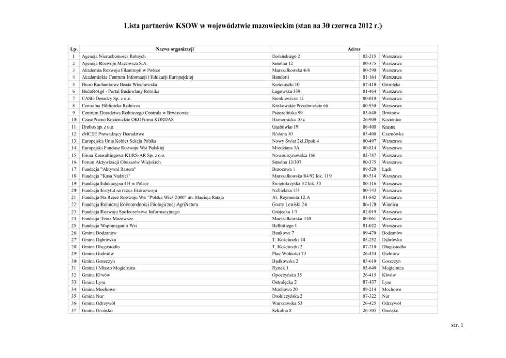 Lista partnerów KSOW w województwie mazowieckim (stan na 30