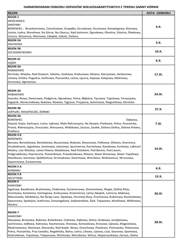 HARMONOGRAM ODBIORU ODPADÓW WIELKOGABARYTOWYCH Z TERENU GMINY KÓRNIK REJON REJON 1 MOŚCIENICA SKRZYNKI BORÓWIEC : Brzoskwiniowa, Czereśniowa, Drapałka, Gruszkowa, Gruntowa, Kempingowa, Klonowa, Letnia, Ładna, Morelowa, Na Górce, Na Uboczu, Nad Jeziorem, Ogrodowa, Okreżna, Szkolna, Śliwkowa, Urocza, Wiosenna, Wiśniowa, Zakątek, Zakole, Zielona. REJON 2A DACHOWA REJON 2B SZCZODRZYKOWO REJON 2C GĄDKI REJON 3A ROBAKOWO Żernicka, Wiejska, Nad Stawem, Szkolna, Azaliowa, Krokusowa, Różana, Narcyzowa, Gerberowa, Liliowa, Krótka, Pogodna, Szafirowa, Poznańska, Leśna, Łączna, Gajowa, Kolejowa, Malinowa, Aroniowa, Agrestowa. REJON 3A ROBAKOWO Szeroka, Nowa, Dworcowa, Podgórna, Ogrodowa, Polna, Błękitna, Tęczowa, Topolowa, Forsycjowa, Zagajnik, Słonecznikowa, Bukowa, Nowina, Tygrysie, Przyjazna, Jaśminowa, Magnoliowa, Kórnicka REJON 3B JARYSZKI, ŚWIĄTNICZKI, ŻERNIKI REJON 4A BORÓWIEC Dębowa, Dojazd, Kręta, Kwitnąca, Leśna, Łąkowa, Mała Rekreacyjna, Na Skarpie, Piaskowe, Polna, Poznańska, Prosta, Rekreacyjna, Uroczysko, Warzywna, Widokowa, Zacisze, Zaułek, Zielona Dolina, Zielona Polana, Źródlana REJON 4 B BORÓWIEC Borowa, Borowikowa, Borówkowa, Buczynowa, Bukowa, Deszczowa, Fiołkowa, Główna, Graniczna, Grzybobranie, Jagodowa, Jesionowa, Jeżynowa, Jęczmienna, Karmelowa, Kozakowa, Kurkowa, Labirynt Wodny, Lisa Witalisa, Leśna Polana, Maślakowa, Nad Potokiem, Pod Borem, Pod Lasem, Podgrzybkowa, Poprzeczna, Poziomkowa, Prawdziwkowa, Różana, Skwer Brzozowy, Skwer Topolowy, Słowikowa, Sosnowa, Spółdzielcza, Strumykowa, Świerkowa, Wierzbina, Wolniewicza, Wrzosowa, Zapomniana, Żurawinowa REJON 5 A KONINKO REJON 5 B SZCZYTNIKI REJON 6 KAMIONKI Agatowa, Bazaltowa, Brylantowa, Chabrowa, Cynamonowa, Diamentowa, Długie, Dzikiej Róży, Granitowa, Kamienna, Kartingowa, Krokusowa, Krzemienna, Leśny Zakątek, Lotnicza, Makowa, Mieczewska, Modelarzy, Na Skraju Lasu, Opalowa, Porannej Rosy, Promienna, Rubinowa, Rumiankowa, Spacerowa, Spokojna, Szafirowa, Szmaragdowa, Szybowników, Świt, Topazowa, Waniliowa, Wiklinowa, Wodna. REJON 7 KAMIONKI Akacjowa, Brzozowa, Bukowa, Bułankowa, Cedrowa, Dębowa, Dolna, Grabowa, Jarzębinowa, Jaśminowa, Jodłowa, Kalinowa, Kasztanowa, Klonowa, Konwaliowa, Kresowe, Łąkowa, Magnoliowa, Modrzewiowa, Mostowa, Murarska, Nad Kople, Nowa, Orzechowa, Piaskowa, Piotrowska, Platanowa, Polna, Poznańska, Przy Łowisku, Rogalińska, Rolna, Leśna, Liliowa, Lipowa, Lisia, Sosnowa, Sportowa, Stokrotkowa, Topolowa, Tulipanowa, Wichrowa, Wierzbowa, Wilcza, Wypoczynkowa, Zacisze, Zielna DATA ODBIORU 4.X. 3.X. 10.X. 6.X. 17.XI. 24.XI. 27.X. 7.XI. 14.XI. 6.X. 13.X. 26.XI. 28.XI. REJON 8 BIERNATKI (Dębiecka, Główna, Jarzębinowa, Rekreacyjna) BŁAŻEJEWO (Cicha, Jeziorna, Krótka, Leśna, Polna, Rybacka, Słoneczna, Spokojna, Mikołajczyka, Zaniemyska) BŁAŻEJEWKO DĘBIEC PRUSINOWO REJON 9A CZMONIEC CZMOŃ REJON 9B DWORZYSKA KONARSKIE RADZEWO TRZYKOLNE MŁYNY CZOŁOWO REJON 10 CELESTYNOWO KROMOLICE PIERZCHNO RUNOWO DZIEĆMIEROWO KÓRNIK, Czereśniowa REJON 11 A KÓRNIK Pl. Browarowy, Pl. Niepodległości, Pl. Powstańców Wlkp., Harcerska, ks. Jabłońskiego, Kolegiacka, Kuśnierska, Leśna, Pocztowa, Poprzeczna, Poznańska, Szkolna, Średzka, Wodna, Wojska Polskiego, Woźniaka, Zamkowa, Reja, Słowackiego, Mickiewicza REJON 11 B KÓRNIK Al.. Flensa, os. Białoboka, Celichowskiego, E.Pohla, Modrzewiowa, Parkowa, Prowent BIERNATKI Al.. Flensa, Laskowa, S. Nowaka, Gawrycha, Toboły, Wiatrakowa. REJON 12 KÓRNIK Asnyka, Dworcowa, Działyńskich, Fredry, Kołłątaja, Krasickiego, Krótka, Leśmiana, Patriotów, Potulickiej, Staszica, Stodolna, Strzelecka, Wiatraczna, Wróblewskiego, Wyspiańskiego, Zamoyskiego, ul. 20-go Października, św. Floriana, Weymana, Z. Steckiego, Kantego, Młyńska REJON 13 BNIN Akacjowa, Armii Krajowej, Biernacka, Błażejewska, Brzozowa, Bukowa, Cmentarna, Dębowa, Dojazd, Droga Kalejska, Jagodowa, Jaśminowa, Jeziorna, Jodłowa, Kalinowa, Kasztanowa, Kościelna, Lipowa, Piaskowa, Pl. Jesionowy, Rynek, Sosnowa, Szeroka, Świerkowa, Topolowa, Wierzbowa, Wrzosowa, Żwirowa BŁAŻEJEWO - Zacisze REJON 14 BNIN Czołowska Droździka, Fludry, Grześkowiaka, Kanałowa, Konarska, Krauthofera, ks. Janasika, Ładna, Michałowskiego, Mikołajczyka, Molińskiej - Wojkowskiej, Radosna, Śremska, Trąmpczyńskiego, Wieruszowskiego, Witosa, Wójkiewicza, Kasztelana Jarosa, Zwierzyniecka, Żurowskiego BŁAŻEJEWO - os. Przylesie INFORMACJA: - W wyznaczonym dniu wystawić można: zuzyty sprzęt elektryczny i elektroniczny (RTV, AGD), meble, kanapy, sofy, materace, wykładziny, dywany, zużyte baterie i akumulatory, odpady niebezpieczne i problemowe pochodzące z gospodarstw domowych takie jak: przetermnowane leki i chemikalia. - Odpady będą odbierane przez mobilny punkt gromadzenia odpadów problemowych - Prosimy o wystawienie odpadów przed posesję do godz. 7.00 10.X. 3.X. 4.X. 27.X. 15.X. 15.X. 15.X. 24.X. 24.X.