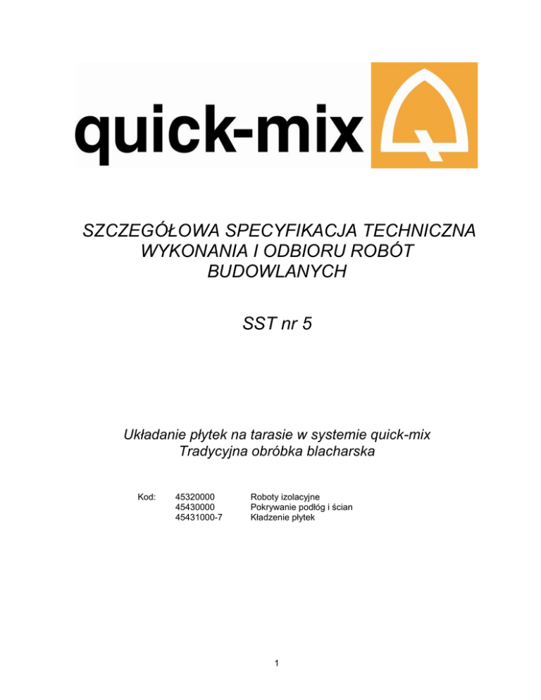 SZCZEGÓŁOWA SPECYFIKACJA TECHNICZNA WYKONANIA I ODBIORU ROBÓT BUDOWLANYCH SST nr 5 Układanie płytek na tarasie w systemie quick-mix Tradycyjna obróbka blacharska Kod: 45320000 45430000 45431000-7 Roboty izolacyjne Pokrywanie podłóg i ścian Kładzenie płytek 1 Spis treści 1. WSTĘP ............................................................................................................................................ 4 1.1. 1.2. 1.3. 1.4. 1.5. 2. PRZEDMIOT SST ........................................................................................................................... 4 ZAKRES STOSOWANIA SST ............................................................................................................ 4 ZAKRES ROBÓT OBJĘTYCH SST ..................................................................................................... 4 OKREŚLENIA PODSTAWOWE ........................................................................................................... 4 OGÓLNE WYMAGANIA DOTYCZĄCE ROBÓT ....................................................................................... 5 MATERIAŁY .................................................................................................................................... 5 2.1. CEMENTOWA MASA SZPACHLOWA BRS........................................................................................... 5 2.2. OBRÓBKI BLACHARSKIE .................................................................................................................. 5 2.3. JASTRYCH CEMENTOWY ZE 04 ....................................................................................................... 6 2.4. W ARSTWA SZCZEPNA H4 ............................................................................................................... 6 2.5. BITUMICZNA POWŁOKA USZCZELNIAJĄCA BD2K .............................................................................. 6 2.6. ŚRODEK GRUNTUJĄCY BAT ........................................................................................................... 7 2.7. PŁYTY Z POLISTYRENU EKSTRUDOWANEGO ..................................................................................... 7 2.8. FDS 2K ELASTYCZNA ZAPRAWA USZCZELNIAJĄCA .......................................................................... 8 2.9. FX 900 WYSOKOELASTYCZNA ZAPRAWA KLEJĄCA ........................................................................... 8 2.10. FUGA FF911............................................................................................................................. 9 2.11. TAŚMY, NAROŻNIKI I MANSZETY USZCZELNIAJĄCE (DBF, DE, DM-W, DM-B) ............................... 9 2.12. MATERIAŁ OKŁADZINOWY ........................................................................................................... 9 3. SPRZĘT ........................................................................................................................................... 9 4. TRANSPORT ................................................................................................................................ 10 4.1. MATERIAŁY FIRMY QUICK-MIX ....................................................................................................... 10 4.2. MATERIAŁY OKŁADZINOWE ........................................................................................................... 10 4.3. PŁYTY Z POLISTYRENU EKSTRUDOWANEGO ................................................................................... 10 5. WYKONANIE ROBÓT .................................................................................................................. 10 5.1. PRZYGOTOWANIE PODŁOŻA .......................................................................................................... 10 5.1.1. Przygotowanie masy szpachlowej BRS ........................................................................... 10 5.2. MONTAŻ OBRÓBEK BLACHARSKICH ............................................................................................... 10 5.3. W ARSTWA SPADKOWA – JASTRYCH CEMENTOWY ZE 04 ................................................................ 11 5.3.1. Podłoże ............................................................................................................................. 11 5.3.2. Przygotowanie jastrychu cementowego ZE 04 ................................................................ 11 5.4. W YKONANIE IZOLACJI PAROSZCZELNEJ ......................................................................................... 11 5.4.1. Gruntowanie przy użyciu cienkowarstwowej powłoki uszczelniającej BAT ..................... 11 5.4.2. Wykonanie izolacji paroszczelnej z BD2K Bitumicznej powłoki uszczelniającej. ............. 11 5.5. IZOLACJA TERMICZNA ................................................................................................................... 12 5.6. W ARSTWA DOCISKOWA Z ZAPRAWY ZE 04 JASTRYCH CEMENTOWY................................................ 12 5.7. IZOLACJA PRZECIWWODNA Z FDS 2K ELASTYCZNEJ ZAPRAWY USZCZELNIAJĄCEJ ........................... 12 5.7.1. Przygotowanie .................................................................................................................. 12 5.7.2. Podłoże pod izolację ......................................................................................................... 12 5.7.3. Wykonanie izolacji z FDS 2K ............................................................................................ 12 5.8. ZABEZPIECZANIA NAROŻY I SZCZELIN ............................................................................................ 12 5.8.1. Taśmy, narożniki i manszety uszczelniające (DBF, DE, DM-W, DM-B) .......................... 12 5.8.2. Inne elementy. .................................................................................................................. 13 5.9. KLEJENIE OKŁADZIN CERAMICZNYCH ..