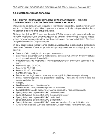 PROJEKT PLANU GOSPODARKI ODPADAMI DO 2015 - Miasto i Gmina ŁAPY 7.3. UNIESZKODLIWIANIE ODPADÓW 7.3.1. ODZYSK I RECYKLING ODPADÓW OPAKOWANIOWYCH – MIEJSKIE CENTRUM ODZYSKU SUROWCÓW ODPADOWYCH W ŁAPACH Warunkiem podstawowym odzysku i recyklingu odpadów opakowaniowych jest ich możliwości zbytu. Aby zbywane surowce znalazły nabywców konieczne jest ich odpowiednie przygotowanie. Dlatego też już w 1999 roku na terenie PGKIM rozpoczęto gromadzenie surowców odpadowych pochodzących ze zbiórki selektywnej. Miejsce czasowego gromadzenia odpadów opakowaniowych nazwano Miejskim Centrum Odzysku Surowców Odpadowych. W celu sprawnego realizowania zadań związanych z gospodarką odpadami powstałe Gminne Centrum powinno być wyposażone w następujące urządzenia: Samochód z dźwigiem bocznym i wywrotem Belownica do prasowania makulatury, butelek PET, innych tworzyw sztucznych, puszek aluminiowych itp. Rozdrabniacz do odpadów wielkogabarytowych zielonych (gałęzie i konary), Pojemniki typu DZWON, Pojemniki PA 1100 Pojemniki 110 i 120 litrów, Kontenery typu Kp-7. Boksy technologiczne na stłuczkę szklaną (białą i kolorową) - istnieją, Boksy technologiczne na pozostałe odpady – tak jak na schemacie na następnej stronie, Waga , Worki plastikowe – oznakowane Worki BIG-BAG na polimery i puszki aluminiowe, Beczki 200 litowe do przechowywania odpadów niebezpiecznych, Specjalistyczne pojemniki EURO do świetlówek, Specjalistyczne pojemniki EURO do akumulatorów Specjalistyczne pojemniki EURO do baterii, Specjalistyczne pojemniki EURO do lekarstw, Specjalistyczne pojemniki EURO do opakowań po farbach i lakierach. Atestowane beczki 200 l do flamastrów, kaset video, termometrów, itp. 63 PROJEKT PLANU GOSPODARKI ODPADAMI DO 2015 - Miasto i Gmina ŁAPY Schemat ideowy wyposażenia MIEJSKIEGO CENTRUM ODZYSKU SUROWCÓW ODPADOWYCH w ŁAPACH STŁUCZKA BEZBARWNA PAPIER I TEKTURA STŁUCZKA KOLOROWA TWORZYWA SZTUCZNE BIAŁE METALE Prasy, Rozdrabniacze Wózek widłowy STACJA CHEMICZNA ODPADY GABARYTOWE Gosp. domowe ODPADY GABARYTOWE MEBLE BIOLOGICZNE ODPADY WIELKOGABARYTOWE (gałęzie, drzewka itp.) KOMPOST GRUZ OPONY BUDOWLANY 64 ODPADY KOŃCOWE PROJEKT PLANU GOSPODARKI ODPADAMI DO 2015 - Miasto i Gmina ŁAPY Miejskie Centrum Odzysku Surowców Odpadowych w Łapach do momentu powołania ponad gminnej struktury tzw. Zakładu Zagospodarowania Odpadów pełnić będzie jego funkcje: gromadzenie odpadów opakowaniowych, transport odpadów opakowaniowych, rozdzielanie frakcji zmieszanych, prasowanie i konfekcjonowanie surowców, sprzedaż surowców recyklerom ostatecznym. 7.3.2. KOMPOSTOWANIE ODPADÓW BIODEGRADOWALNYCH. Kompostowanie jest biotermicznym procesem przerobu odpadów biologicznych w którym do rozkładu substancji organicznych wykorzystuje się pracę drobnoustrojów. Im zawdzięczamy naturalne procesy tworzenia się gleb pozwalające na rozwój życia roślinnego. Kompostowanie odpadów jest więc w najszerszym ujęciu naśladownictwem procesów występujących w przyrodzie. Przez rozwiązania techniczne procesy te intensyfikujemy, stwarzając optymalne warunki dla przemian metabolicznych. W ramach planu oprócz kompostowania przydomowego proponuje się dwa główne sposoby wdrożenia systemu kompostowania: kompostowanie osadów ściekowych w oparciu o materiał strukturalny w postaci trocin, słomy itp., kompostowanie osadów wraz z wyselekcjonowaną częścią odpadów biodegradowalnych, Do realizacji ww. zadań konieczne jest zastosowanie takiej technologii przekształcania osadów w produkty rynkowe, by ich koszt wytworzenia był niższy niż ogólnie znane i funkcjonujące na rynku podobne, konkurencyjne produkty, np. obornik, torf, węgiel brunatny itp. Funkcją tego systemu jest minimalizacja kosztów jakie winni ponieść bezpośredni producenci odpadów (ścieków) czyli mieszkańcy. 65 PROJEKT PLANU GOSPODARKI ODPADAMI DO 2015 - Miasto i Gmina ŁAPY Technologię opartą na powyższych założeniach prezentuje firma GWDA, która jest min. producentem KOMPROL – u. KOMPROL jest nawozem organicznym przeznaczonym do poprawy żyzności gleb i rozwoju roślin. Wytwarzany jest z biomasy stabilizowanego osadu czynnego z dodatkiem surowców celulozowych. Działanie nawozowe Komprolu podobne jest do działania obornika. Jego właściwości agrotechniczne sprawiają, że może on być użyty na wszystkich rodzajach gleb, zwłaszcza lekkich. Na podstawie Komprolu wytwarza się również ziemię ogrodniczą, produkt gotowy do zastosowania w miejscach pozbawionych gleby, bez dodatkowego mieszania. KOMPROL podobnie jak obornik działa w glebie strukturotwórczo, poprawia stosunki wodnopowietrzne gleby. Wysoka zawartość materii organicznej umożliwia pobieranie składników pokarmowych przez roślinę co najmniej przez 3 lata. Komprol uzyskał pozytywną opinię Instytutu Uprawy Nawożenia i Gleboznawstwa w Puławach oraz Instytutu Warzywnictwa w Skierniewicach. Najdogodniejszą lokalizacją instalacji do kompostowania odpadów biodegradowalnych jest teren składowiska odpadów w UHOWIE. KOSZT INSTALACJI POKAZANEJ NA ZDJĘCIU DLA WARUNKÓW ŁAP WYNOSI OKOŁO 50.000,00 PLN 7.3.3. UNIESZKODLIWIANIE ODPADÓW NIEBEZPIECZNYCH Zgromadzone odpady niebezpieczne na terenie Miejskiego Centrum dostarczane będą do wyspecjalizowanych zakładów unieszkodliwiania odpadów niebezpiecznych. W poniższej tabeli zawarto informacje o odbiorcach odpadów niebezpiecznych: Lp. 1. 2. 3. 4. 5. 6. UWAGI Odbiorca odpadów „ABBA EKOMED” Poznańska 152; 87- 100 Toruń Tel. 0- 56 654 70 71 BIONIKA Sp. Z o.o. 85-082 Bydgoszcz , ul. Zygmunta Augusta 5 „ BIO- ECOLOGY SERVICES” Rzymowskiego 30; 02- 697 Warszawa Tel. 0- 22 647 39 45; fax 0- 22 647 06 84 „ EKO- KRAK 2000” Romanowicza2; 30-702 Kraków Tel. 0- 12 423 50 63 fax 0- 12 412 35 89 „ EKO-MED” Dawida 2; 50-527 Wrocław Tel. 0-71 73 29 01; fax 0-71 67 40 76 „ EKO- NEUTRAL” 66 Unieszkodliwianie termiczne, Mechaniczne, chemiczne, zestal