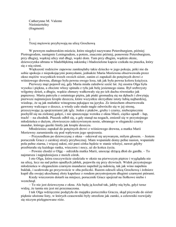 Catherynne M. Valente Nieśmiertelny (fragment) 1 Trzej mężowie przybywają na ulicę Grochową W pewnym nadmorskim mieście, które niegdyś nazywano Petersburgiem, później Piotrogrodem, następnie Leningradem, a potem, znacznie później, ponownie Petersburgiem, przy długiej, wąskiej ulicy stał długi, wąski dom. Tam przy długim, wąskim oknie, dziewczynka ubrana w bladobłękitną sukienkę i bladozielone kapcie czekała na ptaszka, który się z nią ożeni. Większość rodziców zapewne zamknęłaby takie dziecko w jego pokoju, póki nie da sobie spokoju z niepokojącymi pomysłami, jednakże Maria Moriewna obserwowała przez okno mężów wszystkich trzech swoich sióstr, zanim ci zapukali do potężnych drzwi z wiśniowego drewna, dlatego była pewna swego losu, tak jak była pewna koloru księżyca. Pierwszy mąż pojawił się, gdy Maria miała zaledwie sześć lat. Jej siostra Olga była wysoka i piękna, a złociste włosy spinała z tyłu jak belę jesiennego siana. Był srebrzysty wilgotny dzień, a długie, wąskie chmury wałkowały się po ich dachu równiutko jak papierosy. Maria patrzyła z ostatniego piętra, jak ptaki gromadzą się na dębach i chwytają pierwsze najmniejsze krople deszczu, które wszystkie skrzydlate istoty lubią najbardziej, wiedząc, że są jak malutkie winogrona pękające na języku. Ze śmiechem obserwowała gawrony walczące o deszcz, a wtedy całe stado nagle odwróciło się w jej stronę, przeszywając ją spojrzeniami jak igły. Jeden z ptaków, gruby i czarny, niebezpiecznie pochylił się na zielonej gałęzi, i nie spuszczając wzroku z okna Marii, ciężko upadł – łup, trach! – na chodnik. Ptaszek odbił się, a gdy stanął na nogach, zmienił się w przystojnego młodzieńca o dużym, złowieszczo zakrzywionym nosie, ubranego w elegancki czarny mundur, którego guziki lśniły jak krople deszczu. Młodzieniec zapukał do potężnych drzwi z wiśniowego drewna, a matka Marii Moriewny zarumieniła się pod wpływem jego spojrzenia. – Przyszedłem po dziewczynę z okna – odezwał się urywanym, miłym głosem. – Jestem porucznik Gracz z carskiej straży przybocznej. Mam wspaniałe domy pełne nasion, wspaniałe pola pełne ziarna, i więcej sukni, niż pani córka będzie w stanie włożyć, nawet gdyby przebierała się każdego ranka, wieczoru i nocy, aż do końca życia. – Pewnie chodzi o Olgę – odrzekła matka Marii, unosząc drżącą dłoń do gardła. – To najstarsza i najpiękniejsza z moich córek. I oto Olga, która rzeczywiście siedziała w oknie na pierwszym piętrze i wyglądała nie na ulicę, lecz na sad pełen opadłych jabłek, pojawiła się przy drzwiach. Widok przystojnego młodzieńca w eleganckim czarnym mundurze napełnił ją radością, tak jak wino napełnia bukłak, i ucałowała go przyzwoicie w oba policzki. Razem odeszli ulicą Grochową i żołnierz kupił dla swojej ukochanej złoty kapelusz z rondem przystrojonym długimi czarnymi piórami. Kiedy wieczorem dotarli na miejsce, porucznik Gracz spojrzał na fiołkowe niebo i westchnął. – To nie jest dziewczyna z okna. Ale będę ją kochał tak, jakby nią była, gdyż teraz widzę, że tamta nie jest mi przeznaczona. I tak Olga wdzięcznie podążyła do majątku porucznika Gracza, skąd pisywała do sióstr pięknie ułożone listy, w których czasowniki były strzeliste jak zamki, a celowniki rozwijały się niczym pielęgnowane róże. Drugi mąż się pojawił, gdy Maria miała dziewięć lat. Jej siostra Tatiana była przebiegła i rumiana jak lisica, a jej bystre szare oczy łapczywie spoglądały na wszystko, co ją zaciekawiło. Maria Moriewna siedziała w oknie i haftowała rąbek szatki do chrztu dla drugiego synka Olgi. Była wiosna i po porannym deszczu długa, wąska ulica lśniła wilgocią, a mokre różowe płatki zdobiły ją jak klejnoty. Maria patrzyła z ostatniego piętra, jak ptaki ponownie gromadzą się na potężnym dębie i chwytają przemoczone, pomarszczone kwiaty wiśni, jakie wszystkie skrzydlate istoty lubią najbardziej, wiedząc, że są niczym korzenne ciasteczka rozpuszczające się na języku. Ze śmiechem obserwowała siewki kłócące się o kwiaty, a wtedy całe stado nagle odwróciło się w jej stronę, przeszywając ją spojrzeniami jak noże. Jeden z ptaków, mały i brązowy, niebezpiecznie pochylił się na zielonej gałęzi, i nie spuszczając wzroku z okna Marii, ciężko upadł – łup, trach! – na chodnik. Ptaszek odbił się, a gdy stanął na nogach, zmienił się w przystojnego młodzieńca o krągłych i życzliwych ustach, ubranego w elegancki brązowy mundur z długą białą szarfą, którego guziki lśniły jak słońce. Młodzieniec zapukał do potężnych drzwi z wiśniowego drewna, a matka Marii Moriewny uśmiechnęła się pod wpływem jego spojrzenia. – Jestem porucznik Zujok z Białej Gwardii – powiedział, ponieważ oblicze świata się zmieniło. – Przyszedłem po dziewczynę z okna. Mam wspaniałe domy pełne owoców, wspaniałe pola pełne dżdżownic, i więcej klejnotów, niż pani córka będzie w stanie włożyć, nawet gdyby zmieniała pierścionki każdego ranka, wieczoru i nocy, aż do końca życia. – Pewnie chodzi o Tatianę – odrzekła matka Marii, przyciskając dłoń do piersi. – To druga pod względem wieku i piękności spośród moich córek. I oto Tatiana, która rzeczywiście siedziała w oknie na pierwszym piętrze i wyglądała nie na ulicę, lecz na sad pełen kwiatów jabłoni, pojawiła się przy drzwiach. Widok przystojnego młodzieńca w eleganckim brązowym mundurze napełnił ją ogniem, tak jak gorące powietrze napełnia jedwabny balon, i ucałowała go niezbyt przyzwoicie w same usta. Razem odeszli ulicą Grochową i żołnierz kupił dla swojej ukochanej biały kapelusz z rondem przystrojonym długimi kasztanowymi piórami. Kiedy wieczorem dotarli na miejsce, porucznik Zujok spojrzał na turkusowe niebo i west