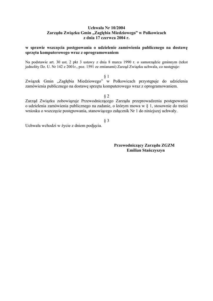 Uchwała Nr 10/2004 Zarządu Związku Gmin „Zagłębia