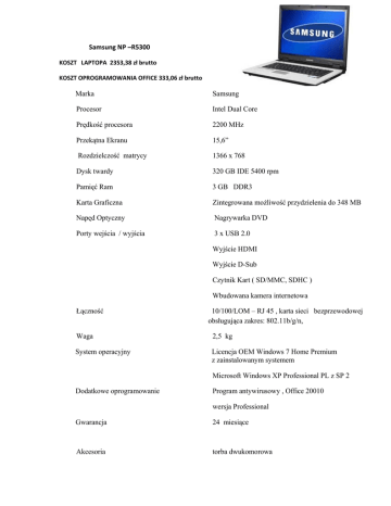 Samsung NP –R5300 KOSZT LAPTOPA 2353,38 zł brutto KOSZT OPROGRAMOWANIA OFFICE 333,06 zł brutto Marka Samsung Procesor Intel Dual Core Prędkość procesora 2200 MHz Przekątna Ekranu 15,6” Rozdzielczość matrycy 1366 x 768 Dysk twardy 320 GB IDE 5400 rpm Pamięć Ram 3 GB DDR3 Karta Graficzna Zintegrowana możliwość przydzielenia do 348 MB Napęd Optyczny Nagrywarka DVD Porty wejścia / wyjścia 3 x USB 2.0 Wyjście HDMI Wyjście D-Sub Czytnik Kart ( SD/MMC, SDHC ) Wbudowana kamera internetowa Łączność 10/100/LOM – RJ 45 , karta sieci bezprzewodowej obsługująca zakres: 802.11b/g/n, Waga 2,5 kg System operacyjny Licencja OEM Windows 7 Home Premium z zainstalowanym systemem Microsoft Windows XP Professional PL z SP 2 Dodatkowe oprogramowanie Program antywirusowy , Office 20010 wersja Professional Gwarancja 24 miesiące Akcesoria torba dwukomorowa