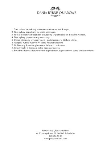 DANIA RYBNE OBIADOWE 1. Filet rybny zapiekany w sosie śmietanowo-ziołowym. 2. Filet rybny zapiekany w sosie serowym. 3. Filet opiekany z boczkiem i duszony w pomidorach z białym winem. 4. Filet rybny panierowany smażony. 5. Dorsz pieczony w warzywach i podduszany w białym winie. 6. Gołąbki rybno-ryżowe w sosie neapolitańskim. 7. Grillowany łosoś w glazurze z tabasco i miodem. 8. Polędwiczki z dorsza z salsą brzoskwiniową. 9. Roladki z łososia faszerowane szpinakiem, zapiekane w sosie śmietanowym. Restauracja „Pod Aniołami” ul. Przemysłowa 23, 66-100 Sulechów 68 385 84 37 www.podaniolami.com