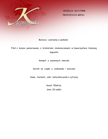 WIGILIA DLA FIRM PROPOZYCJA MENU Barszcz czerwony z uszkami Filet z karpia panierowany z krokietami ziemniaczanymi w towarzystwie kiszonej kapustki Kompot z suszonych owoców Sernik na ciepło z czekoladą i owocami Kawa , herbata , soki naturalne,woda z cytryną Koszt 50zł/os. (min. 20 osób)