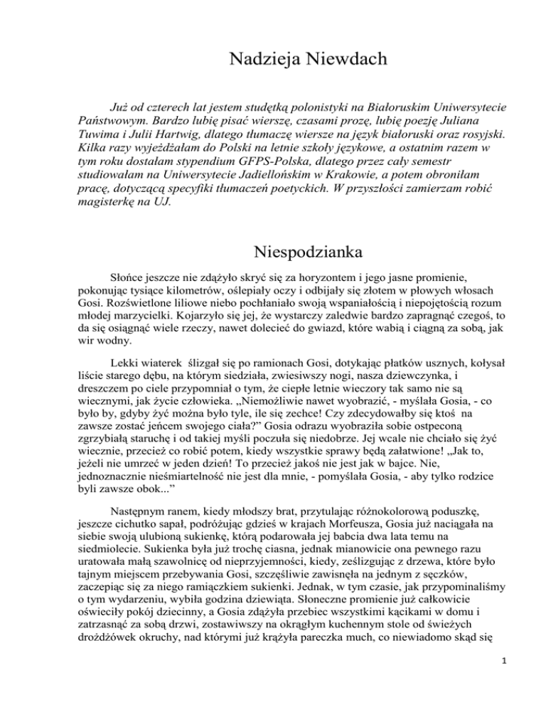 Nadzieja Niewdach Już od czterech lat jestem studętką polonistyki na Białoruskim Uniwersytecie Państwowym. Bardzo lubię pisać wierszę, czasami prozę, lubię poezję Juliana Tuwima i Julii Hartwig, dlatego tłumaczę wiersze na język białoruski oraz rosyjski. Kilka razy wyjeżdżałam do Polski na letnie szkoły językowe, a ostatnim razem w tym roku dostałam stypendium GFPS-Polska, dlatego przez cały semestr studiowałam na Uniwersytecie Jadiellońskim w Krakowie, a potem obroniłam pracę, dotyczącą specyfiki tłumaczeń poetyckich. W przyszłości zamierzam robić magisterkę na UJ. Niespodzianka Słońce jeszcze nie zdążyło skryć się za horyzontem i jego jasne promienie, pokonując tysiące kilometrów, oślepiały oczy i odbijały się złotem w płowych włosach Gosi. Rozświetlone liliowe niebo pochłaniało swoją wspaniałością i niepojętością rozum młodej marzycielki. Kojarzyło się jej, że wystarczy zaledwie bardzo zapragnąć czegoś, to da się osiągnąć wiele rzeczy, nawet dolecieć do gwiazd, które wabią i ciągną za sobą, jak wir wodny. Lekki wiaterek ślizgał się po ramionach Gosi, dotykając płatków usznych, kołysał liście starego dębu, na którym siedziała, zwiesiwszy nogi, nasza dziewczynka, i dreszczem po ciele przypomniał o tym, że ciepłe letnie wieczory tak samo nie są wiecznymi, jak życie człowieka. „Niemożliwie nawet wyobrazić, - myślała Gosia, - co było by, gdyby żyć można było tyle, ile się zechce! Czy zdecydowałby się ktoś na zawsze zostać jeńcem swojego ciała?” Gosia odrazu wyobraziła sobie ostpeconą zgrzybiałą staruchę i od takiej myśli poczuła się niedobrze. Jej wcale nie chciało się żyć wiecznie, przecież co robić potem, kiedy wszystkie sprawy będą załatwione! „Jak to, jeżeli nie umrzeć w jeden dzień! To przecież jakoś nie jest jak w bajce. Nie, jednoznacznie nieśmiartelność nie jest dla mnie, - pomyślała Gosia, - aby tylko rodzice byli zawsze obok...” Następnym ranem, kiedy młodszy brat, przytulając różnokolorową poduszkę, jeszcze cichutko sapał, podróżując gdzieś w krajach Morfeusza, Gosia już naciągała na siebie swoją ulubioną sukienkę, którą podarowała jej babcia dwa lata temu na siedmiolecie. Sukienka była już trochę ciasna, jednak mianowicie ona pewnego razu uratowała małą szawolnicę od nieprzyjemności, kiedy, ześlizgując z drzewa, które było tajnym miejscem przebywania Gosi, szczęśliwie zawisnęła na jednym z sęczków, zaczepiąc się za niego ramiączkiem sukienki. Jednak, w tym czasie, jak przypominaliśmy o tym wydarzeniu, wybiła godzina dziewiąta. Słoneczne promienie już całkowicie oświeciły pokój dziecinny, a Gosia zdążyła przebiec wszystkimi kącikami w domu i zatrzasnąć za sobą drzwi, zostawiwszy na okrągłym kuchennym stole od świeżych drożdżówek okruchy, nad którymi już krążyła pareczka much, co niewiadomo skąd się 1 wzięły, szklankę z nie dopitym mlekiem i kartkę: „Babciu, nie martw się, szybko wrócę, Twoja najukochańsza wnuczka!” Kręta ścieżka wzdłuż płytkiej rzeczki prowadziła do najdroższego wieloletniego dębu, na którym tyle czasu spędzała Gosia. Tutaj rodziły się najbardziej nietypowe marzenia i plany, tutaj można się rozpłynąć w naturze i poczuć jej niewielką częścią, liściem, kołysanym przez wiatr. Tutaj można nawet zapomnieć o tym, że jeden brzydki chłopiec ze szkoły przez cały rok pozostawia w skrzynce pocztowej dziwne karteczki z wyznaniami miłości. „I dlaczego Mateusz nigdy na mnie nie patrzy?” – czas od czasu smuciła się Gosia. Jednak nawet o takich rzeczach nie chce się myśleć, gdy cały świat, wszystkie pola i rzeki, góry i lasy, które są widoczne na wierzchołkach starego drzewa, były posiadłością jej bogatej wyobraźni... Wreszcie dąb spojrzał prosto w niebieskie oczy swojej wiernej przyjaciółki. Dotarłszy celu, Gosia zręcznie weszła na drzewo i wyjęła coś z kieszeni sukienki i szybko ukryła to coś w dziupli starego dębu. W tej dziupli Gosia przechowywała swoje niezwykłe skarby: piękne kamyczki, odłamki starej ceramiki, którą czasami znajdowała w ziemi, kiedy pomagała swojej babci pielić klomby, - krótko mówiąc, wszystko, co ona uważała za trofeum młodego archeologa. A tym razem miała szczęście znaleźć wśród kwiatów krzemień, który był bardzo podobny do ostrza strzały. „A jeśli to jest ostrze tych samych osób, które żyły miliony lat temu! Muszę jak najszybciej podzielić się tym odkryciem z dębem i zostawić mu ten krzemień na przechowywanie!” - pomyślała poprzedniego wieczoru Gosia. Sprawa była załatwiona, pozostawało jej jedynie trochę odpocząć z podróży i udać się w powrotną drogę... „Na lewo, na prawo, w górę i w dół...”- śpiewała cichutko swoją ulubioną piosenkę Gosia, patrząc z uśmiechem dookoła i machając rękami, wyobrażając sobie, że to są nie ręce, a lekkie, jak piórka, skrzydła. „Szła dzieweczka do laseczka...” próbowała iść w rytm piosenki i śpiewała półgłosem, delikatnie wyciągając wszystkie wysokie noty jak uczyła jej mama. „Oh, a przecież mama ma tak piękny i delikatny głos, nikt tak nie śpiewa, no, może tylko tata! - pomyślała Gosia i rozśmiała się głośno, wyobraząc zaskoczone twarze rodziców. Ale naprawdę rodzice śpiewają w duecie choć rzadko, ale bardzo ładnie. Wszyscy pamiętają jak oni śpiewali w dwa głosy „tą piosękę” (Gosia tak ją nazywała) z filmu „Ogniem i mieczem” na weselu cioci Agaty. „Trzeba będzie poprosić, żeby na moim weselu też to zaśpiewali! Ale kiedy to będzie! Trzeba jeszcze dożyć!” - myśłała przyszła panna młoda. Jednakże myśli nagle się zmieniły na inne... „Czyżby ktoś mnie śledził? - pomyślała Gosia i rozejrzała się kilka razy. – Pewnie mi się wydało”. Zrobiwszy ostrożny krok naprzó