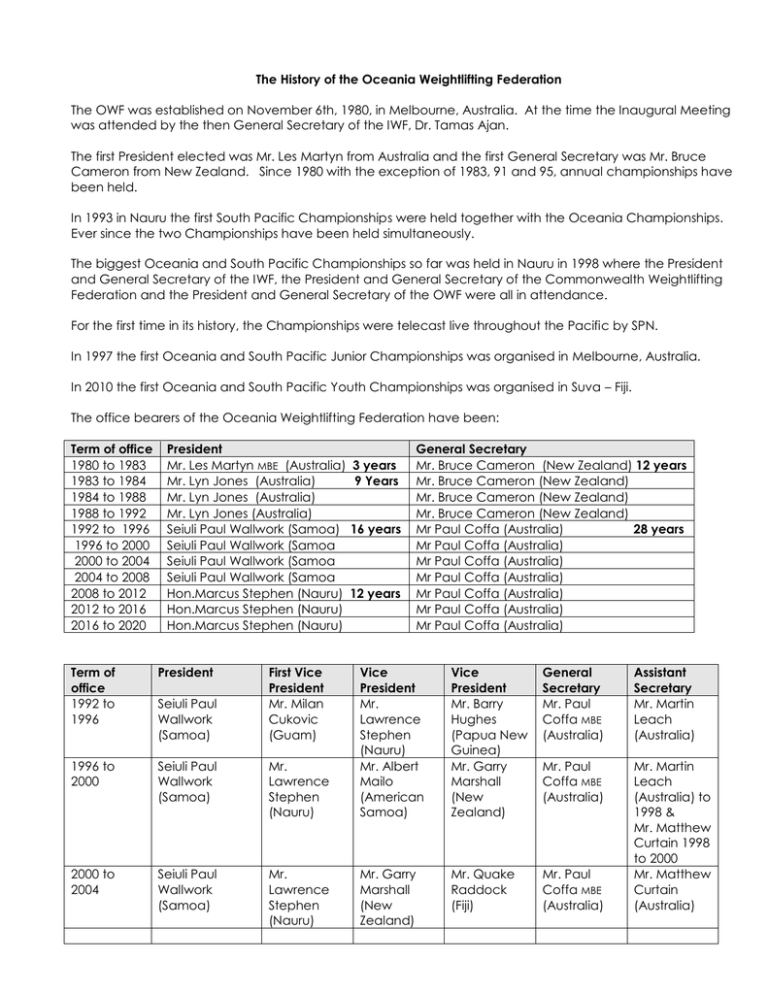 The History of the Oceania Weightlifting Federation The OWF was established on November 6th, 1980, in Melbourne, Australia. At the time the Inaugural Meeting was attended by the then General Secretary of the IWF, Dr. Tamas Ajan. The first President elected was Mr. Les Martyn from Australia and the first General Secretary was Mr. Bruce Cameron from New Zealand. Since 1980 with the exception of 1983, 91 and 95, annual championships have been held. In 1993 in Nauru the first South Pacific Championships were held together with the Oceania Championships. Ever since the two Championships have been held simultaneously. The biggest Oceania and South Pacific Championships so far was held in Nauru in 1998 where the President and General Secretary of the IWF, the President and General Secretary of the Commonwealth Weightlifting Federation and the President and General Secretary of the OWF were all in attendance. For the first time in its history, the Championships were telecast live throughout the Pacific by SPN. In 1997 the first Oceania and South Pacific Junior Championships was organised in Melbourne, Australia. In 2010 the first Oceania and South Pacific Youth Championships was organised in Suva – Fiji. The office bearers of the Oceania Weightlifting Federation have been: Term of office 1980 to 1983 1983 to 1984 1984 to 1988 1988 to 1992 1992 to 1996 1996 to 2000 2000 to 2004 2004 to 2008 2008 to 2012 2012 to 2016 2016 to 2020 President Mr. Les Martyn MBE (Australia) Mr. Lyn Jones (Australia) Mr. Lyn Jones (Australia) Mr. Lyn Jones (Australia) Seiuli Paul Wallwork (Samoa) Seiuli Paul Wallwork (Samoa Seiuli Paul Wallwork (Samoa Seiuli Paul Wallwork (Samoa Hon.Marcus Stephen (Nauru) Hon.Marcus Stephen (Nauru) Hon.Marcus Stephen (Nauru) Term of office 1992 to 1996 President 1996 to 2000 Seiuli Paul Wallwork (Samoa) 2000 to 2004 Seiuli Paul Wallwork (Samoa) Seiuli Paul Wallwork (Samoa) First Vice President Mr. Milan Cukovic (Guam) 3 years 9 Years 16 years 12 years General Secretary Mr. Bruce Cameron (New Zealand) 12 years Mr. Bruce Cameron (New Zealand) Mr. Bruce Cameron (New Zealand) Mr. Bruce Cameron (New Zealand) Mr Paul Coffa (Australia) 28 years Mr Paul Coffa (Australia) Mr Paul Coffa (Australia) Mr Paul Coffa (Australia) Mr Paul Coffa (Australia) Mr Paul Coffa (Australia) Mr Paul Coffa (Australia) Vice President Mr. Barry Hughes (Papua New Guinea) Mr. Garry Marshall (New Zealand) General Secretary Mr. Paul Coffa MBE (Australia) Assistant Secretary Mr. Martin Leach (Australia) Mr. Lawrence Stephen (Nauru) Vice President Mr. Lawrence Stephen (Nauru) Mr. Albert Mailo (American Samoa) Mr. Paul Coffa MBE (Australia) Mr. Lawrence Stephen (Nauru) Mr. Garry Marshall (New Zealand) Mr. Quake Raddock (Fiji) Mr. Paul Coffa MBE (Australia) Mr. Martin Leach (Australia) to 1998 & Mr. Matthew Curtain 1998 to 2000 Mr. Matthew Curtain (Australia) 2004 to 2008 Seiuli Paul Wallwork (Samoa) Mr. Tony Hole (Cook Islands) Mr. Robert Grimaldi (New Caledonia) Hon. Marcus Stephen (Nauru) Mr. Paul Coffa MBE (Australia) Mr. Matthew Curtain (Australia) 2008 to 2012 Hon. Marcus Stephen (Nauru) Mr. Tony Hole (Cook Islands) Mr.Ronald Frere (New Caledonia) Mr Frank Robby (PNG) Mr. Paul Coffa MBE (Australia) Mr. Matthew Curtain (Australia) 2012 to 2016 Hon. Marcus Stephen (Nauru) Mr.Jerry Wallwork (Samoa) Mr.Samuel Pera (Cook Islands) Mr Manuel Minginfel (Micronesia) Mr. Paul Coffa MBE (Australia) Mr. Trent Dabwido (Nauru) Mr Frank Robby (Papua New Guinea) Mr Kokoria Iabeta (Kiribati0 Mr. Paul Coffa MBE (Australia) Mrs Lilly Coffa (Australia) Mr Phil Maunder (Australia) 2016 to 2020 Hon. Marcus Stephen (Nauru) Mr.Jerry Wallwork (Samoa) Mr Garry Marshall New Zealand Ms Luisa Peters (Cook Islands) Mr Manuel Minginfel (Micronesia) Mr Frank Robby (Papua New Guinea) Mr Kokoria Iabeta (Kiribati0 Mr Phil Maunder (Australia) Oceania Championships YEAR 1980 1981 1982 1983 1984 1985 1986 1987 1988 1989 1990 1991 1992 1993 1994 1995 1996 1997 1998 1999 2000 2001 2002 2003 2004 2005 2006 2007 2008 2009 2010 2011 2012 2013 2014 2015 2016 2017 CITY Melbourne Brisbane Apia Nil Papeete Auckland Noumea Canberra Papeete Auckland Melbourne Nil Auckland Nauru Guam Nil Apia Wellington Nauru Melbourne Nauru Auckland Suva Nuka’alofa Suva Melbourne Apia Apia Auckland Darwin Suva Darwin Apia Brisbane Mont Dore Port Moresby Suva Australia New Zealand 9 times 6 Samoa Fiji 5 4 COUNTRY Australia Australia Samoa Nil Tahiti New Zealand New Caledonia Australia Tahiti New Zealand Australia Nil New Zealand Nauru Guam Nil Samoa New Zealand Nauru Australia Nauru New Zealand Fiji Tonga Fiji Australia Samoa Samoa New Zealand Australia Fiji Australia Samoa Australia New Caledonia Papua New Guinea Fiji Nauru Tahiti N. Caledonia Guam 3 2 2 1 Oceania Junior Championships YEAR 1997 1998 1999 2000 CITY Melbourne Suva Auckland Brisbane COUNTRY Australia Fiji New Zealand Australia Tonga 1 PNG 1 2001 2002 2003 2004 2005 2006 2007 2008 2009 2010 2011 2012 2013 2014 2015 2016 Tarawa Melbourne Niue Suva Darwin Apia Darwin Auckland Darwin Suva Darwin Apia Brisbane Mont Dore Port Moresby Suva Australia 8 times Fiji 4 Kiribati Australia Niue Fiji Australia Samoa Australia New Zealand Australia Fiji Australia Samoa Australia New Caledonia Papua new Guinea Fiji New Zealand 2 Samoa 2 Kiribati 1 Niue New Caledonia 1 1 Oceania Youth Championships YEAR 2010 2011 2012 2013 2014 2015 2016 Australia 2 CITY Suva Darwin Apia Brisbane Mont Dore Port Moresby Suva Fiji 2 Samoa 1 COUNTRY Fiji Australia Samoa Australia New Caledonia Papua new Guinea Fiji New Caledonia 1 PNG 1 PNG 1