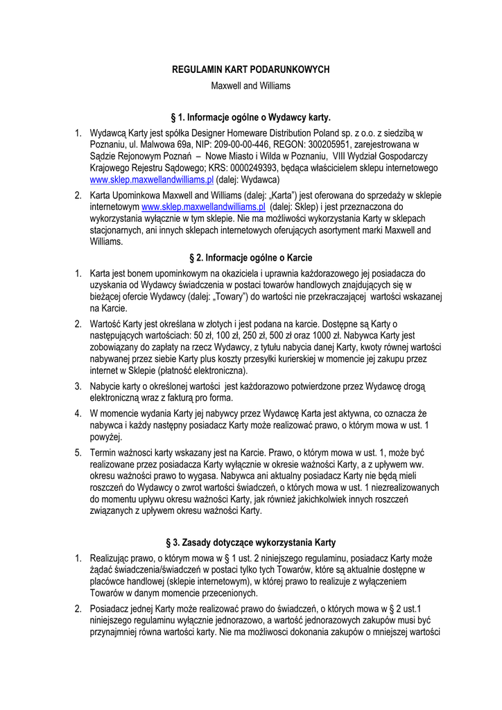 REGULAMIN KART PODARUNKOWYCH Maxwell and Williams § 1. Informacje ogólne o Wydawcy karty. 1. Wydawcą Karty jest spółka Designer Homeware Distribution Poland sp. z o.o. z siedzibą w Poznaniu, ul. Malwowa 69a, NIP: 209-00-00-446, REGON: 300205951, zarejestrowana w Sądzie Rejonowym Poznań – Nowe Miasto i Wilda w Poznaniu, VIII Wydział Gospodarczy Krajowego Rejestru Sądowego; KRS: 0000249393, będąca właścicielem sklepu internetowego www.sklep.maxwellandwilliams.pl (dalej: Wydawca) 2. Karta Upominkowa Maxwell and Williams (dalej: „Karta”) jest oferowana do sprzedaży w sklepie internetowym www.sklep.maxwellandwilliams.pl (dalej: Sklep) i jest przeznaczona do wykorzystania wyłącznie w tym sklepie. Nie ma możliwości wykorzystania Karty w sklepach stacjonarnych, ani innych sklepach internetowych oferujących asortyment marki Maxwell and Williams. § 2. Informacje ogólne o Karcie 1. Karta jest bonem upominkowym na okaziciela i uprawnia każdorazowego jej posiadacza do uzyskania od Wydawcy świadczenia w postaci towarów handlowych znajdujących się w bieżącej ofercie Wydawcy (dalej: „Towary”) do wartości nie przekraczającej wartości wskazanej na Karcie. 2. Wartość Karty jest określana w złotych i jest podana na karcie. Dostępne są Karty o następujących wartościach: 50 zł, 100 zł, 250 zł, 500 zł oraz 1000 zł. Nabywca Karty jest zobowiązany do zapłaty na rzecz Wydawcy, z tytułu nabycia danej Karty, kwoty równej wartości nabywanej przez siebie Karty plus koszty przesyłki kurierskiej w momencie jej zakupu przez internet w Sklepie (płatność elektroniczna). 3. Nabycie karty o określonej wartości jest każdorazowo potwierdzone przez Wydawcę drogą elektroniczną wraz z fakturą pro forma. 4. W momencie wydania Karty jej nabywcy przez Wydawcę Karta jest aktywna, co oznacza że nabywca i każdy następny posiadacz Karty może realizować prawo, o którym mowa w ust. 1 powyżej. 5. Termin ważnosci karty wskazany jest na Karcie. Prawo, o którym mowa w ust. 1, może być realizowane przez posiadacza Karty wyłącznie w okresie ważności Karty, a z upływem ww. okresu ważności prawo to wygasa. Nabywca ani aktualny posiadacz Karty nie będą mieli roszczeń do Wydawcy o zwrot wartości świadczeń, o których mowa w ust. 1 niezrealizowanych do momentu upływu okresu ważności Karty, jak również jakichkolwiek innych roszczeń związanych z upływem okresu ważności Karty. § 3. Zasady dotyczące wykorzystania Karty 1. Realizując prawo, o którym mowa w § 1 ust. 2 niniejszego regulaminu, posiadacz Karty może żądać świadczenia/świadczeń w postaci tylko tych Towarów, które są aktualnie dostępne w placówce handlowej (sklepie internetowym), w której prawo to realizuje z wyłączeniem Towarów w danym momencie przecenionych. 2. Posiadacz jednej Karty może realizować prawo do świadczeń, o których mowa w § 2 ust.1 niniejszego regulaminu wyłącznie jednorazowo, a wartość jednorazowych zakupów musi być przynajmniej równa wartości karty. Nie ma możliwosci dokonania zakupów o mniejszej wartości i pozostawienia salda na karcie, a posiadaczowi Karty nie służy prawo do otrzymania tej różnicy w gotówce. 3. W przypadku, gdyby posiadacz Karty chciał zrealizować świadczenie, o których mowa w § 2 ust. 1 niniejszego regulaminu, o wartości większej, niż wartość Karty, różnica tych wartości powinna zostać przez posiadacza Karty dopłacona kartą kredytową lub przelewem, pod rygorem odmowy spełnienia świadczenia/świadczeń przez Wydawcę. 4. Wartość świadczenia wyznacza każdorazowo cena detaliczna Towaru/Towarów będącego/będących przedmiotem świadczenia obowiązująca w Sklepie w chwili realizacji tego prawa, o którym mowa w § 2. ust.1 . 5. Warunkiem realizacji prawa do świadczenia, o którym mowa w § 2 ust. 1 niniejszego regulaminu, jest wpisanie indywidualnego kodu znajdującego się na karcie w polu "kupon rabatowy" podczas dokonywania zakupów w Sklepie. 6. Karta działa jak kod rabatowy obniżając łączną wartość zakupów o kwotę wskazaną na Karcie. Wykorzystując Kartę okaziciel nie ma możliwości skorzystania dodatkowo z innych promocji dostępnych w danym momencie, jak np. rabat za rejestrację, promocja cenowa itp., gdyż ustawienia Sklepu uniemożliwiają łączenie promocji. 7. Po realizacji świadczenia, o którym mowa w § 2 ust. 1 niniejszego regulaminu, posiadacz Karty otrzymuje fakturę opisującą sprzedaż Towaru/Towarów będącego/będących przedmiotem świadczenia. 8. Posiadacz Karty może realizować prawo do świadczenia, o którym mowa w § 2 ust.1 wyłącznie w okresie ważności Karty. Po upływie okresu ważności Karty Wydawca dezaktywuje Kartę wraz z jej unikalnym kodem, a posiadaczowi nie przysluguje roszczenie o zwrot wartości Karty. § 4. Zagubienie, kradzież i zwroty. 1. Ryzyko utraty, zniszczenia lub uszkodzenia Karty przechodzi na nabywcę z chwilą wydania mu Karty. 2. Karta jest wydawana na okaziciela i opatrzona indywidualnym, unikalnym kodem niezbędnym do jej wykorzystania. Zarówno nabywca, jak i posiadacz mają obowiązek zabezpieczyć ją przez zgubieniem lub kradzieżą. Wydawca nie ponosi odpowiedzialności za karty zagubione bądź skradzione, a posiadaczowi Karty nie przysługuje w związku z tym roszczenie o zwrot wartości karty. 3. Wydawca nie ponosi odpowiedzialności za zrealizowanie świadczenia, o którym mowa w § 2 ust. 1 niniejszego regulaminu do rąk osoby nieuprawnionej (w szczególności osoby, która bezprawnie weszła w posiadanie Karty), jeżeli osoba ta przedstawi mu Kartę z ważnym kodem. 4. Karta nie podlega zwrotowi. Nabywca ani posiadacz Karty nie może dochodzić od Wydawcy wymiany Karty na gotówkę, jak również wydania części wartości Karty w gotówce. 5. Ewentualne zwroty Towarów będących przedmiotem świadczenia, o których mowa w §2 ust. 1 niniejszego regulaminu, dopuszczone przez Wydawcę, będą się 