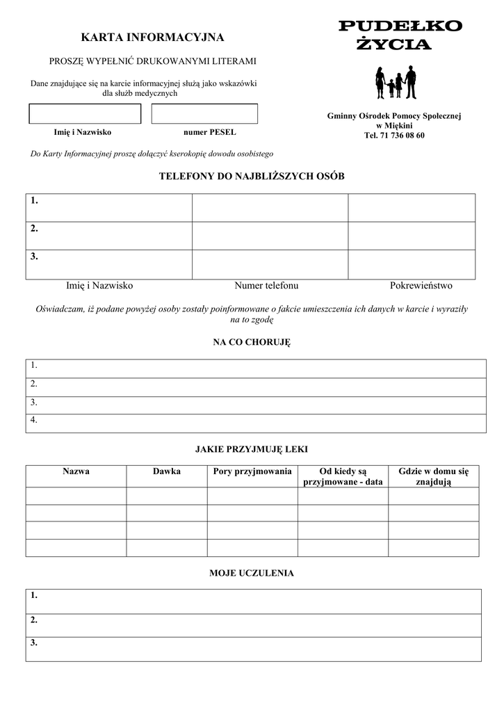 PUDEŁKO ŻYCIA KARTA INFORMACYJNA PROSZĘ WYPEŁNIĆ DRUKOWANYMI LITERAMI Dane znajdujące się na karcie informacyjnej służą jako wskazówki dla służb medycznych Imię i Nazwisko Gminny Ośrodek Pomocy Społecznej w Miękini Tel. 71 736 08 60 numer PESEL Do Karty Informacyjnej proszę dołączyć kserokopię dowodu osobistego 55-330 Miękinia ul. Kościuszki 41 tel. (71) 3178556 TELEFONY DO NAJBLIŻSZYCH OSÓB 1. 2. 3. Imię i Nazwisko Pokrewieństwo Numer telefonu Oświadczam, iż podane powyżej osoby zostały poinformowane o fakcie umieszczenia ich danych w karcie i wyraziły na to zgodę NA CO CHORUJĘ 1. 2. 3. 4. JAKIE PRZYJMUJĘ LEKI Nazwa Dawka Pory przyjmowania MOJE UCZULENIA 1. 2. 3. Od kiedy są przyjmowane - data Gdzie w domu się znajdują