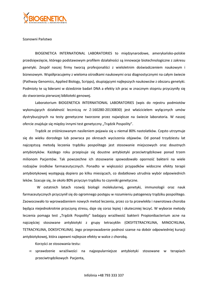 Szanowni Państwo BIOGENETICA INTERNATIONAL LABORATORIES to międzynarodowe, amerykańsko-polskie przedsięwzięcie, którego podstawowym profilem działalności są innowacje biotechnologiczne z zakresu genetyki. Zespół naszej firmy tworzą profesjonaliści z wieloletnim doświadczeniem naukowym i biznesowym. Współpracujemy z wieloma ośrodkami naukowymi oraz diagnostycznymi na całym świecie (Pathway Genomics, Applied Biology, Scripps), skupiającymi najlepszych naukowców z obszaru genetyki. Podmioty te są liderami w dziedzinie badań DNA a efekty ich prac w znacznym stopniu przyczyniły się do stworzenia pierwszej biblioteki genowej. Laboratorium BIOGENETICA INTERNATIONAL LABORATORIES (wpis do rejestru podmiotów wykonujących działalność leczniczą nr Z-160280-20130830) jest właścicielem wyłącznych umów dystrybucyjnych na testy genetyczne tworzone przez największe na świecie laboratoria. W naszej ofercie znajduje się między innymi test genetyczny „Trądzik Pospolity”. Trądzik ze zróżnicowanym nasileniem pojawia się u niemal 80% nastolatków. Często utrzymuje się do wieku dorosłego lub powraca po okresach wyciszenia objawów. Od ponad trzydziestu lat najczęstszą metodą leczenia trądziku pospolitego jest stosowanie miejscowych oraz doustnych antybiotyków. Każdego roku przepisuje się doustne antybiotyki przeciwtrądzikowe ponad trzem milionom Pacjentów. Tak powszechne ich stosowanie spowodowało oporność bakterii na wiele rodzajów środków farmaceutycznych. Ponadto w większości przypadków widoczne efekty terapii antybiotykowej występują dopiero po kilku miesiącach, co dodatkowo utrudnia wybór odpowiednich leków. Szacuje się, że około 80% przyczyn trądziku to czynniki genetyczne. W ostatnich latach rozwój biologii molekularnej, genetyki, immunologii oraz nauk farmaceutycznych przyczynił się do ogromnego postępu w rozumieniu patogenezy trądziku pospolitego. Zaowocowało to wprowadzeniem nowych metod leczenia, przez co ta przewlekła i nawrotowa choroba będąca niejednokrotnie przyczyną stresu, daje się coraz lepiej i skuteczniej leczyć. W wyborze metody leczenia pomaga test „Trądzik Pospolity” badający wrażliwość bakterii Propionibacterium acne na najczęściej stosowane antybiotyki z grupy tetracyklin (OKSYTETRACYKLINA, MINOCYKLINA, TETRACYKLINA, DOKSYCYKLINA). Jego przeprowadzenie podnosi szanse na dobór odpowiedniej kuracji antybiotykowej, która zapewni najlepsze efekty w walce z chorobą. Korzyści ze stosowania testu: • sprawdzenie wrażliwości na najpopularniejsze antybiotyki przeciwtrądzikowych Pacjenta, Infolinia +48 793 333 337 stosowane w terapiach • pozwala dobrać skuteczne metody leczenia, uwzględniając jego indywidualne predyspozycje genetyczne, • możliwość zapobiegnięciu uodpornieniu się bakterii odpowiedzialnej za chorobowe zmiany skórne na antybiotyki, • ograniczenie błędów w leczeniu, które wydłużają terapię, narażając Pacjenta na zwiększone ryzyko rozwoju objawów trądziku i dodatkowe koszty, • zyskanie innowacyjnego narzędzie diagnostyczne, będącego wyróżnikiem na rynku i budującego wizerunek gabinetu świadczącego nowoczesne usługi medyczne, • profesjonalna i nowoczesna wiedza na temat genetycznych podstaw trądziku pospolitego. Test otrzymał osobistą rekomendację Prezesa Polskiego Towarzystwa Dermatologicznego prof. dr hab. med. Jacka Szepietowskiego. Test oparty jest o badanie próbki łoju skóry policzka, nosa lub czoła Pacjenta za pomocą wacika załączonego w zestawie. Test wykonuje się raz w życiu. Spis referencji naukowych: Badania naukowe, do których odnosi się ten raport, wymienione zostały poniżej. 1. Kinney MA, et al. Trends in the treatment of acne vulgaris: are measures being taken to avoid antimicrobial resistance? J Drugs Dermatol. 2010;9:519-24. 2. Yentzer BA, et al. Differences in acne treatment prescribing patterns of pediatricians and dermatologists: an analysis of nationally representative data. Pediatr Dermatol. 2008;25:635-9. 3. Ozolins M, et al. Comparison of five antimicrobial regimens for treatment of mild to moderate inflammatory facial acne vulgaris in the community: randomized controlled trial. Lancet. 2004;364:2188-95. 4. Ross JI, et al. Resistance to erythromycin and clindamycin in cutaneous propionibacteria is associated with mutations in 23s rRNA. Dermatology. 1998;196:69-70. 5. Ross JI, et al. 16s rRNA mutation associated with tetracycline resistance in a gram-positive bacterium. Antimicrob Agents Chemother. 1998;42:1702-5. 6. Eady EA, et al. Erythromycin resistant propionibacteria in antibiotic treated acne patients: association with therapeutic failure. Br J Dermatol. 1989;121:51-7. Infolinia +48 793 333 337