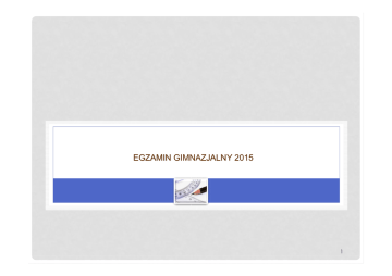 EGZAMIN GIMNAZJALNY 2015 1 Komunikat dyrektora CKE z dnia 3 lipca 2014 r. HARMONOGRAM EGZAMINU GIMNAZJALNEGO W 2014 R. Data 21 kwietnia (wtorek) 22 kwietnia (środa) 23 kwietnia (czwartek) Część egzaminu humanistyczna matematyczno-przyrodnicza język obcy nowożytny Godzina rozpoczęcia Czas trwania regulaminowy wydłużony dla uprawnionych Historia i wiedza o społeczeństwie 9.00 60 min 80 min Język polski 11.00 90 min 135 min Przedmioty przyrodnicze 9.00 60 min 80 min Matematyka 11.00 90 min 135 min Poziom podstawowy 9.00 60 min 80 min Poziom rozszerzony 11.00 60 min 90 min 2 POCZĄTEK EGZAMINU • Uczeń (słuchacz) zgłasza się na każdy zakres/poziom egzaminu w miejscu i czasie wyznaczonym przez dyrektora szkoły godz. 8.00/ godz. 10.45 • O ustalonej godzinie zdający wchodzą do sali pojedynczo, według kolejności na liście i zajmują miejsca przy stolikach, których numery wylosowali. Każdy uczeń powinien mieć przy sobie dokument stwierdzający tożsamość (np. ważną legitymację szkolną) i okazać go, jeśli zostanie o to poproszony. PRZYBORY • Na egzamin uczeń (słuchacz) przynosi ze sobą wyłącznie przybory do pisania, tj. pióro lub długopis z czarnym tuszem/atramentem, oraz – w przypadku egzaminu z zakresu matematyki – przybory do rysowania: ołówek, który może być wykorzystany tylko do rysowania, gumkę, linijkę, ekierkę, cyrkiel i kątomierz. Na egzaminie nie można korzystać z kalkulatora oraz słowników. Nie wolno także przynosić i używać żadnych urządzeń telekomunikacyjnych. CZYNNOŚCI ORGANIZACYJNE ZDAJĄCEGO Zdający bez uprawnień do dostosowania warunków i/lub formy egzaminu rozwiązujący zadania z arkusza standardowego 1.zapoznaje się z Informacją /Instrukcją z pierwszej strony arkusza 2.sprawdza liczbę stron arkusza i jakość wydruku 3.zgłasza braki i usterki w celu wymiany arkusza (w razie potrzeby) 4.wyrywa kartę rozwiązań zadań otwartych z arkusza do języka polskiego, matematyki, poziomu rozszerzonego języka obcego 5.sprawdza poprawność numeru PESEL na nalepkach z OKE 6.koduje arkusz • umieszczając w wyznaczonych miejscach arkusza (VI, Procedura 9) trzyznakowy kod numer PESEL nalepkę z kodem kreskowym i numerem PESEL ucznia 7. 8. 9. 10. zaznacza odpowiedzi do zadań zamkniętych na karcie odpowiedzi zapisuje rozwiązania zadań otwartych w karcie rozwiązań zadań otwartych zgłasza wcześniejsze zakończenie pracy z arkuszem po zakończeniu pracy odkłada arkusz na brzeg ławki 5 SCHEMAT STANDARDOWEGO ARKUSZA EGZAMINACYJNEGO (G1) Z ZAKRESU HISTORII I WIEDZY O SPOŁECZEŃSTWIE, PRZEDMIOTÓW PRZYRODNICZYCH I JĘZYKA OBCEGO NOWOŻYTNEGO NA POZIOMIE PODSTAWOWYM Karta odpowiedzi do zadań zamkniętych Zeszyt zadań Wstęp do Procedur…, str. 6. 6 SCHEMAT STANDARDOWEGO ARKUSZA EGZAMINACYJNEGO (G1) Z ZAKRESU JĘZYKA POLSKIEGO, MATEMATYKI I JĘZYKA OBCEGO NOWOŻYTNEGO NA POZIOMIE ROZSZERZONYM Karta rozwiązań zadań otwartych (do wyrwania przez ucznia) Zeszyt zadań Karta odpowiedzi do zadań zamkniętych Wstęp do Procedur…, str. 6. 7 KODOWANIE ARKUSZY STANDARDOWYCH Z ZAKRESU HISTORII I WOS, PRZEDMIOTÓW PRZYRODNICZYCH I POZIOMU PODSTAWOWEGO JĘZYKA OBCEGO Pola na zeszycie zadań i karcie odpowiedzi, które należy wypełnić. Przykładowa karta odpowiedzi Przykładowa pierwsza strona zeszytu zadań (VI, Procedura 6, p.2, 4m) 8 KODOWANIE ARKUSZY STANDARDOWYCH Z ZAKRESU JĘZYKA POLSKIEGO, MATEMATYKI I POZIOMU ROZSZERZONEGO JĘZYKA OBCEGO Pola na zeszycie zadań, karcie rozwiązań zadań otwartych i karcie odpowiedzi, które należy wypełnić. Przykładowa pierwsza strona zeszytu zadań Przykładowa karta odpowiedzi Przykładowa pierwsza strona karty rozwiązań zadań otwartych w przypadku uczniów uprawnionych do nieprzenoszenia zaznaczeń do zadań zamkniętych na kartę odpowiedzi lub/i do dostosowania kryteriów oceniania (VI, Procedura 6, p.2, 4m) 9 PRZYKŁADOWA KARTA ODPOWIEDZI Kod kreskowy arkusza Nie zaklejać Nalepkę z kodem kreskowym ucznia należy umieścić w miejscu na nią przeznaczonym, nie na kodzie kreskowym arkusza. ! Nalepka z kodem kreskowym ucznia ! 10 KODOWANIE ARKUSZY EGZAMINACYJNYCH Z MATEMATYKI W 2015 ROKU W przypadku arkusza z matematyki kodowaniu będą podlegać obie kartki przeznaczone na zapisanie zadań otwartych w karcie rozwiązań zadań otwartych. (VI, Procedura 6, p.2) 11 CZYNNOŚCI SKŁADAJĄCE SIĘ NA KODOWANIE ARKUSZY EGZAMINACYJNYCH Z ZAKRESU HISTORII I WOS, PRZEDMIOTÓW PRZYRODNICZYCH I POZIOMU PODSTAWOWEGO JĘZYKA OBCEGO Na pierwszej stronie zeszytu zadań Na karcie odpowiedzi wpisanie trzyznakowego kodu zdającego w odpowiednie pola wpisanie trzyznakowego kodu zdającego w odpowiednie pola wpisanie numeru PESEL zdającego w odpowiednie pola wpisanie numeru PESEL zdającego w odpowiednie pola naklejenie nalepki z kodem kreskowym i numerem PESEL ucznia w polu na nią przeznaczonym naklejenie nalepki z kodem kreskowym i numerem PESEL ucznia w polu na nią przeznaczonym 12 CZYNNOŚCI SKŁADAJĄCE SIĘ NA KODOWANIE ARKUSZY EGZAMINACYJNYCH Z ZAKRESU JĘZYKA POLSKIEGO, MATEMATYKI I POZIOMU ROZSZERZONEGO JĘZYKA OBCEGO Na pierwszej stronie zeszytu zadań wpisanie trzyznakowego kodu zdającego w odpowiednie pola wpisanie numeru PESEL zdającego w odpowiednie pola naklejenie nalepki z kodem kreskowym i numerem PESEL ucznia w polu na nią przeznaczonym Na karcie rozwiązań zadań otwartych wpisanie trzyznakowego kodu zdającego w odpowiednie pola wpisanie numeru PESEL zdającego w odpowiednie pola naklejenie nalepki z kodem kreskowym i numerem PESEL ucznia w polu na nią przeznaczonym Na karcie odpowiedzi wpisanie trzyznakowego kodu zdającego w odpowiednie pola wpisanie numeru PESEL zdającego w odpowiednie pola naklejenie nalepki z kodem kreskowym i numerem PESEL ucznia w polu na nią przeznaczonym 13 PRACA Z ARKUSZEM • Zdający rozwiązuje zadania, zaznacza lub zapisuje odpowiedzi w wyznaczonych miejscach wyłącznie długopisem lub piórem z czarnym tuszem/atram