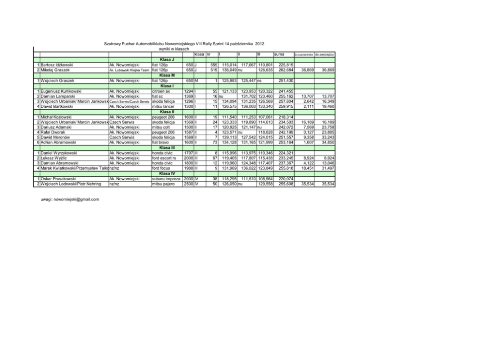 1 2 1 1 2 3 4 1 2 3 4 5 6 1 2 3 4 1 2 Szutrowy Puchar Automobilklubu Nowomiejskiego VIII Rally Sprint 14 października 2012 wyniki w klasach klasa nr I II III suma Klasa J Bartosz Idźkowski Ak. Nowomiejski fiat 126p 650 J 555 115,014 117,667 110,801 225,815 Mikołaj Graszek Ak. Lubawski Klejna Team fiat 126p 650 J 519 136,049 nu 126,635 262,684 Klasa M Wojciech Graszek Ak. Nowomiejski fiat 126p 650 M 1 125,983 125,447 ns 251,430 Klasa I Eugeniusz Kurlikowski Ak. Nowomiejski citroen ax 1294 I 55 121,133 123,953 120,322 241,455 Damian Lamparski Ak. Nowomiejski fiat sc 1369 I 16 nu 131,702 123,460 255,162 Wojciech Urbaniak/ Marcin JankowskiCzech Serwis/Czech Serwis skoda felicja 1296 I 15 134,094 131,235 126,569 257,804 Dawid Bartkowski Ak. Nowomiejski mitsu lancer 1300 I 11 126,575 136,003 133,340 259,915 Klasa II Michał Kozłowski Ak. Nowomiejski peugeot 206 1600 II 19 111,540 111,253 107,061 218,314 Wojciech Urbaniak/ Marcin JankowskiCzech Serwis skoda felicja 1569 II 24 123,333 119,890 114,613 234,503 Dariusz Adamski Ak. Nowomiejski mitsu colt 1500 II 17 120,925 121,147 nu 242,072 Rafał Dworak Ak. Nowomiejski peugeot 206 1587 II 4 123,571 nu 118,628 242,199 Dawid Meronów Czech Serwis skoda felicja 1569 II 7 139,113 127,542 124,015 251,557 Adrian Abramowski Ak. Nowomiejski fiat bravo 1600 II 73 134,128 131,165 121,999 253,164 Klasa III Daniel Wyrzykowski Ak. Nowomiejski honda civic 1797 III 8 115,996 113,975 110,346 224,321 Łukasz WyŜlic Ak. Nowomiejski ford escort rs 2000 III 67 119,405 117,807 115,438 233,245 Damian Abramowski Ak. Nowomiejski honda civic 1800 III 12 119,960 124,348 117,407 237,367 Marek Kwiatkowski/Przemysław Talkowski nz/nz ford focus 1988 III 9 131,969 136,022 123,849 255,818 Klasa IV Oskar Prusakowski Ak. Nowomiejski subaru impreza 2000 IV 38 118,295 111,510 108,564 220,074 Wojciech Lodowski/Piotr Nehring nz/nz mitsu pajero 2500 IV 50 126,050 nu 129,558 255,608 uwagi: [email protected] do poprzednika do zwycięŜcy 36,869 36,869 13,707 2,642 2,111 13,707 16,349 18,460 16,189 7,569 0,127 9,358 1,607 16,189 23,758 23,885 33,243 34,850 8,924 4,122 18,451 8,924 13,046 31,497 35,534 35,534