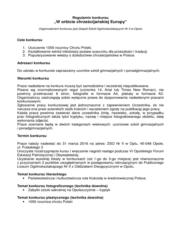 Regulamin konkursu „W orbicie chrześcijańskiej Europy” Organizatorem konkursu jest Zespół Szkół Ogólnokształcących Nr II w Opolu Cele konkursu 1. Uczczenie 1050 rocznicy Chrztu Polski. 2. Kształtowanie wśród młodzieży postaw szacunku dla przeszłości i tradycji. 3. Popularyzowanie wiedzy o dziedzictwie chrześcijaństwa w Polsce. Adresaci konkursu Do udziału w konkursie zapraszamy uczniów szkół gimnazjalnych i ponadgimnazjalnych. Warunki konkursu Prace nadesłane na konkurs muszą być samodzielne i wcześniej niepublikowane. Pisane wg znormalizowanych reguł (czcionka 14, Arial lub Times New Roman), nie powinny przekraczać 6 stron, fotografie w formacie A4, plakaty w formacie A3. Organizatorzy zastrzegają sobie wyłączne prawa do dysponowania nadesłanymi pracami konkursowymi. Zgłoszenie pracy konkursowej jest jednoznaczne z zapewnieniem Uczestnika, że nie narusza ona praw autorskich osób trzecich i wyrażeniem zgody na publikację jego pracy. Każda praca powinna zawierać dane uczestnika (imię, nazwisko, szkołę, w przypadku prac fotograficznych także tytuł tryptyku, nazwę i miejsce fotografowanego obiektu, datę wykonania zdjęcia). Prace oceniane będą w dwóch kategoriach wiekowych: uczniowie szkół gimnazjalnych i ponadgimnazjalnych. Termin konkursu Prace należy nadesłać do 31 marca 2016 na adres: ZSO Nr II w Oplu, 45-048 Opole, ul. Pułaskiego 3 Uroczyste rozstrzygnięcie kursu i wręczenie nagród nastąpi podczas VI Opolskiego Forum Edukacji Patriotycznej i Obywatelskiej. Uzyskanie wysokiej lokaty w konkursach (od 1-go do 3-go miejsca) jest równoznaczne z przyznaniem 2 punktów uwzględnianych w postępowaniu rekrutacyjnym do Publicznego Liceum Ogólnokształcącego Nr II z Oddziałami Dwujęzycznymi w Opolu. Temat konkursu literackiego • Państwotwórcza i kulturotwórcza rola Kościoła w średniowiecznej Polsce. Temat konkursu fotograficznego (technika dowolna) • Zabytki sztuki sakralnej na Opolszczyźnie – tryptyk Temat konkursu plastycznego (technika dowolna) • 1050 rocznica chrztu Polski