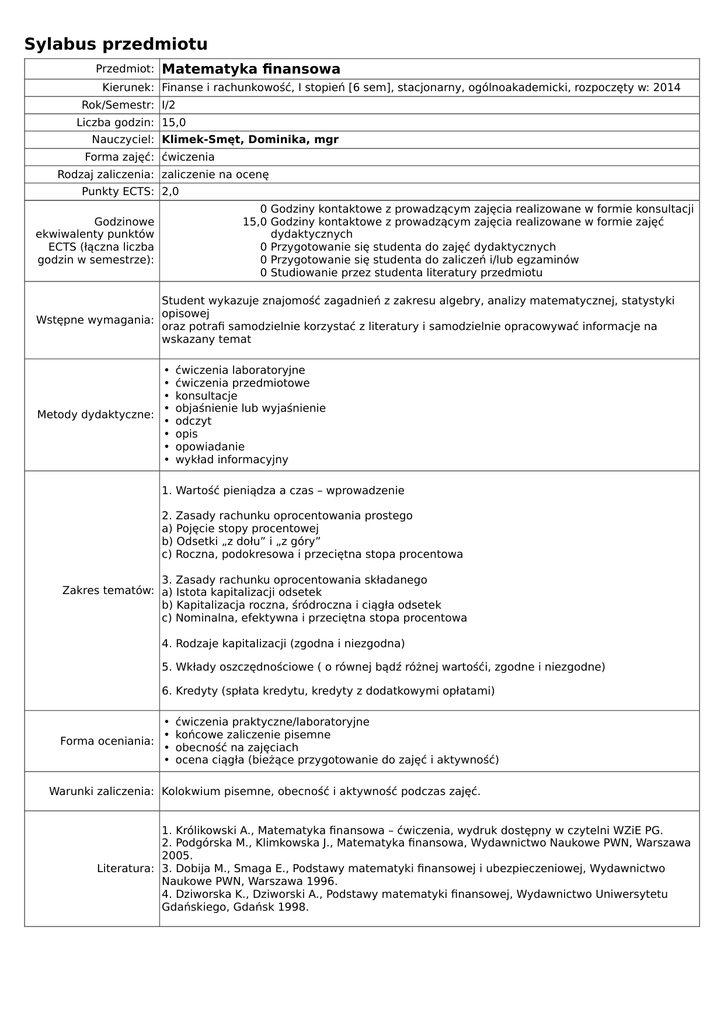 Sylabus przedmiotu Przedmiot: Matematyka finansowa Kierunek: Finanse i rachunkowość, I stopień [6 sem], stacjonarny, ogólnoakademicki, rozpoczęty w: 2014 Rok/Semestr: I/2 Liczba godzin: 15,0 Nauczyciel: Klimek-Smęt, Dominika, mgr Forma zajęć: ćwiczenia Rodzaj zaliczenia: zaliczenie na ocenę Punkty ECTS: 2,0 0 Godziny kontaktowe z prowadzącym zajęcia realizowane w formie konsultacji 15,0 Godziny kontaktowe z prowadzącym zajęcia realizowane w formie zajęć dydaktycznych 0 Przygotowanie się studenta do zajęć dydaktycznych 0 Przygotowanie się studenta do zaliczeń i/lub egzaminów 0 Studiowanie przez studenta literatury przedmiotu Godzinowe ekwiwalenty punktów ECTS (łączna liczba godzin w semestrze): Student wykazuje znajomość zagadnień z zakresu algebry, analizy matematycznej, statystyki opisowej Wstępne wymagania: oraz potrafi samodzielnie korzystać z literatury i samodzielnie opracowywać informacje na wskazany temat • • • • Metody dydaktyczne: • • • • ćwiczenia laboratoryjne ćwiczenia przedmiotowe konsultacje objaśnienie lub wyjaśnienie odczyt opis opowiadanie wykład informacyjny 1. Wartość pieniądza a czas – wprowadzenie 2. Zasady rachunku oprocentowania prostego a) Pojęcie stopy procentowej b) Odsetki „z dołu” i „z góry” c) Roczna, podokresowa i przeciętna stopa procentowa 3. Zasady rachunku oprocentowania składanego Zakres tematów: a) Istota kapitalizacji odsetek b) Kapitalizacja roczna, śródroczna i ciągła odsetek c) Nominalna, efektywna i przeciętna stopa procentowa 4. Rodzaje kapitalizacji (zgodna i niezgodna) 5. Wkłady oszczędnościowe ( o równej bądź różnej wartośći, zgodne i niezgodne) 6. Kredyty (spłata kredytu, kredyty z dodatkowymi opłatami) • • Forma oceniania: • • ćwiczenia praktyczne/laboratoryjne końcowe zaliczenie pisemne obecność na zajęciach ocena ciągła (bieżące przygotowanie do zajęć i aktywność) Warunki zaliczenia: Kolokwium pisemne, obecność i aktywność podczas zajęć. 1. Królikowski A., Matematyka finansowa – ćwiczenia, wydruk dostępny w czytelni WZiE PG. 2. Podgórska M., Klimkowska J., Matematyka finansowa, Wydawnictwo Naukowe PWN, Warszawa 2005. Literatura: 3. Dobija M., Smaga E., Podstawy matematyki finansowej i ubezpieczeniowej, Wydawnictwo Naukowe PWN, Warszawa 1996. 4. Dziworska K., Dziworski A., Podstawy matematyki finansowej, Wydawnictwo Uniwersytetu Gdańskiego, Gdańsk 1998.