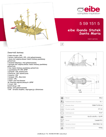 5 59 151 5 eibe ibondo Statek Santa Maria made in germany Zawartość dostawy 2 koła sterowe: HPL 1 kotwa z łańcuchem: HPL, stal galwanizowana 1 duża sieć wspinaczkowa: kabel stalowy powlekany poliestrem 1 mostek kołyszący: stal galwanizowana 1 pochyła sieć wspinaczkowa: kabel stalowy powlekany poliestrem 1 lina: kabel stalowy powlekany poliestrem 1 zjeżdżalnia PH 145: GFRP 3 ptaszki: SW, wykończone 4 lanterns: SW, wykończone 3 maszty: SW 1 kompas: HPL, Macrolon 1 baner: HPL 7 kabli: stal nierdzewna 18 chwytów wspinaczkowych: GFRP 1 trzon: SW Konstrukcja: SW Kotwy: stal galwanizowana *SW - Drewno miękkie, impregnacja ciśnieniowa Materiał Fundamentowanie i ich poziom Minimalny obszar Wysokość upadku Strefa bezpieczna Fundamenty Montaż Największy element Najcięższy element [email protected] | Tel. +48 508 070 589 | www.eibe.pl SW pi FL 1 1506x771x704 cm 211 cm 70 m² 10x CF or 9x PFs + 13x PFl 3 people/16 h 500x140x5,7 cm 150 kg