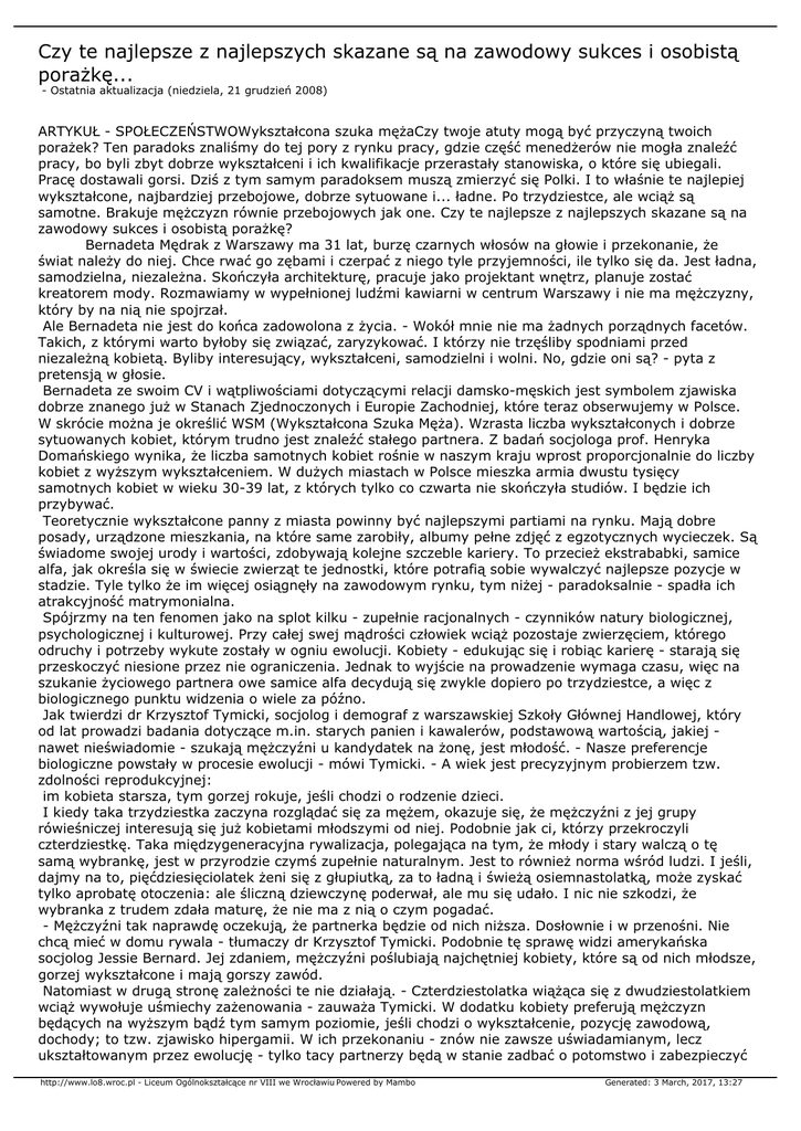 Czy te najlepsze z najlepszych skazane są na zawodowy sukces i osobistą porażkę... - Ostatnia aktualizacja (niedziela, 21 grudzień 2008) ARTYKUŁ - SPOŁECZEŃSTWOWykształcona szuka mężaCzy twoje atuty mogą być przyczyną twoich porażek? Ten paradoks znaliśmy do tej pory z rynku pracy, gdzie część menedżerów nie mogła znaleźć pracy, bo byli zbyt dobrze wykształceni i ich kwalifikacje przerastały stanowiska, o które się ubiegali. Pracę dostawali gorsi. Dziś z tym samym paradoksem muszą zmierzyć się Polki. I to właśnie te najlepiej wykształcone, najbardziej przebojowe, dobrze sytuowane i... ładne. Po trzydziestce, ale wciąż są samotne. Brakuje mężczyzn równie przebojowych jak one. Czy te najlepsze z najlepszych skazane są na zawodowy sukces i osobistą porażkę? Bernadeta Mędrak z Warszawy ma 31 lat, burzę czarnych włosów na głowie i przekonanie, że świat należy do niej. Chce rwać go zębami i czerpać z niego tyle przyjemności, ile tylko się da. Jest ładna, samodzielna, niezależna. Skończyła architekturę, pracuje jako projektant wnętrz, planuje zostać kreatorem mody. Rozmawiamy w wypełnionej ludźmi kawiarni w centrum Warszawy i nie ma mężczyzny, który by na nią nie spojrzał. Ale Bernadeta nie jest do końca zadowolona z życia. - Wokół mnie nie ma żadnych porządnych facetów. Takich, z którymi warto byłoby się związać, zaryzykować. I którzy nie trzęśliby spodniami przed niezależną kobietą. Byliby interesujący, wykształceni, samodzielni i wolni. No, gdzie oni są? - pyta z pretensją w głosie. Bernadeta ze swoim CV i wątpliwościami dotyczącymi relacji damsko-męskich jest symbolem zjawiska dobrze znanego już w Stanach Zjednoczonych i Europie Zachodniej, które teraz obserwujemy w Polsce. W skrócie można je określić WSM (Wykształcona Szuka Męża). Wzrasta liczba wykształconych i dobrze sytuowanych kobiet, którym trudno jest znaleźć stałego partnera. Z badań socjologa prof. Henryka Domańskiego wynika, że liczba samotnych kobiet rośnie w naszym kraju wprost proporcjonalnie do liczby kobiet z wyższym wykształceniem. W dużych miastach w Polsce mieszka armia dwustu tysięcy samotnych kobiet w wieku 30-39 lat, z których tylko co czwarta nie skończyła studiów. I będzie ich przybywać. Teoretycznie wykształcone panny z miasta powinny być najlepszymi partiami na rynku. Mają dobre posady, urządzone mieszkania, na które same zarobiły, albumy pełne zdjęć z egzotycznych wycieczek. Są świadome swojej urody i wartości, zdobywają kolejne szczeble kariery. To przecież ekstrababki, samice alfa, jak określa się w świecie zwierząt te jednostki, które potrafią sobie wywalczyć najlepsze pozycje w stadzie. Tyle tylko że im więcej osiągnęły na zawodowym rynku, tym niżej - paradoksalnie - spadła ich atrakcyjność matrymonialna. Spójrzmy na ten fenomen jako na splot kilku - zupełnie racjonalnych - czynników natury biologicznej, psychologicznej i kulturowej. Przy całej swej mądrości człowiek wciąż pozostaje zwierzęciem, którego odruchy i potrzeby wykute zostały w ogniu ewolucji. Kobiety - edukując się i robiąc karierę - starają się przeskoczyć niesione przez nie ograniczenia. Jednak to wyjście na prowadzenie wymaga czasu, więc na szukanie życiowego partnera owe samice alfa decydują się zwykle dopiero po trzydziestce, a więc z biologicznego punktu widzenia o wiele za późno. Jak twierdzi dr Krzysztof Tymicki, socjolog i demograf z warszawskiej Szkoły Głównej Handlowej, który od lat prowadzi badania dotyczące m.in. starych panien i kawalerów, podstawową wartością, jakiej nawet nieświadomie - szukają mężczyźni u kandydatek na żonę, jest młodość. - Nasze preferencje biologiczne powstały w procesie ewolucji - mówi Tymicki. - A wiek jest precyzyjnym probierzem tzw. zdolności reprodukcyjnej: im kobieta starsza, tym gorzej rokuje, jeśli chodzi o rodzenie dzieci. I kiedy taka trzydziestka zaczyna rozglądać się za mężem, okazuje się, że mężczyźni z jej grupy rówieśniczej interesują się już kobietami młodszymi od niej. Podobnie jak ci, którzy przekroczyli czterdziestkę. Taka międzygeneracyjna rywalizacja, polegająca na tym, że młody i stary walczą o tę samą wybrankę, jest w przyrodzie czymś zupełnie naturalnym. Jest to również norma wśród ludzi. I jeśli, dajmy na to, pięćdziesięciolatek żeni się z głupiutką, za to ładną i świeżą osiemnastolatką, może zyskać tylko aprobatę otoczenia: ale śliczną dziewczynę poderwał, ale mu się udało. I nic nie szkodzi, że wybranka z trudem zdała maturę, że nie ma z nią o czym pogadać. - Mężczyźni tak naprawdę oczekują, że partnerka będzie od nich niższa. Dosłownie i w przenośni. Nie chcą mieć w domu rywala - tłumaczy dr Krzysztof Tymicki. Podobnie tę sprawę widzi amerykańska socjolog Jessie Bernard. Jej zdaniem, mężczyźni poślubiają najchętniej kobiety, które są od nich młodsze, gorzej wykształcone i mają gorszy zawód. Natomiast w drugą stronę zależności te nie działają. - Czterdziestolatka wiążąca się z dwudziestolatkiem wciąż wywołuje uśmiechy zażenowania - zauważa Tymicki. W dodatku kobiety preferują mężczyzn będących na wyższym bądź tym samym poziomie, jeśli chodzi o wykształcenie, pozycję zawodową, dochody; to tzw. zjawisko hipergamii. W ich przekonaniu - znów nie zawsze uświadamianym, lecz ukształtowanym przez ewolucję - tylko tacy partnerzy będą w stanie zadbać o potomstwo i zabezpieczyć http://www.lo8.wroc.pl - Liceum Ogólnokształcące nr VIII we Wrocławiu Powered by Mambo Generated: 3 March, 2017, 13:27 rodzinę na przyszłość. W całym zachodnim świecie rośnie liczba kobiet alfa, natomiast pula odpowiednich dla nich partnerów się nie powiększa. I we wszystkich krajach największy problem ze znalezieniem partnera mają właśnie wykształcone kobiety. W Niemczech ich 