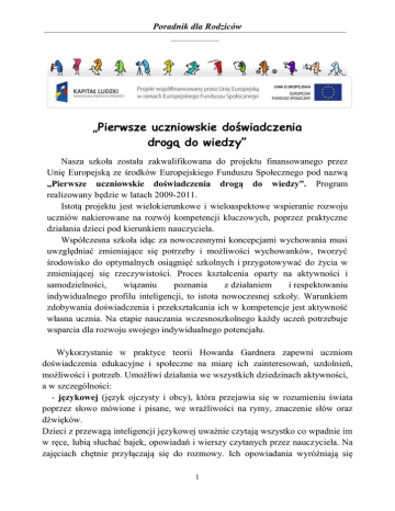 Poradnik dla Rodziców ¯¯¯¯¯¯¯¯¯¯¯¯¯¯¯¯¯¯¯¯¯¯¯¯¯¯¯¯¯¯¯¯¯¯¯¯¯¯¯¯¯¯¯¯¯¯¯¯¯¯¯¯¯¯¯¯¯¯¯¯¯¯¯¯¯¯¯¯¯¯¯¯¯¯¯¯ ¯¯¯¯¯¯¯¯¯¯¯¯ „Pierwsze uczniowskie doświadczenia drogą do wiedzy” Nasza szkoła została zakwalifikowana do projektu finansowanego przez Unię Europejską ze środków Europejskiego Funduszu Społecznego pod nazwą „Pierwsze uczniowskie doświadczenia drogą do wiedzy”. Program realizowany będzie w latach 2009-2011. Istotą projektu jest wielokierunkowe i wieloaspektowe wspieranie rozwoju uczniów nakierowane na rozwój kompetencji kluczowych, poprzez praktyczne działania dzieci pod kierunkiem nauczyciela. Współczesna szkoła idąc za nowoczesnymi koncepcjami wychowania musi uwzględniać zmieniające się potrzeby i możliwości wychowanków, tworzyć środowisko do optymalnych osiągnięć szkolnych i przygotowywać do życia w zmieniającej się rzeczywistości. Proces kształcenia oparty na aktywności i samodzielności, wiązaniu poznania z działaniem i respektowaniu indywidualnego profilu inteligencji, to istota nowoczesnej szkoły. Warunkiem zdobywania doświadczenia i przekształcania ich w kompetencje jest aktywność własna ucznia. Na etapie nauczania wczesnoszkolnego każdy uczeń potrzebuje wsparcia dla rozwoju swojego indywidualnego potencjału. Wykorzystanie w praktyce teorii Howarda Gardnera zapewni uczniom doświadczenia edukacyjne i społeczne na miarę ich zainteresowań, uzdolnień, możliwości i potrzeb. Umożliwi działania we wszystkich dziedzinach aktywności, a w szczególności: - językowej (język ojczysty i obcy), która przejawia się w rozumieniu świata poprzez słowo mówione i pisane, we wrażliwości na rymy, znaczenie słów oraz dźwięków. Dzieci z przewagą inteligencji językowej uważnie czytają wszystko co wpadnie im w ręce, lubią słuchać bajek, opowiadań i wierszy czytanych przez nauczyciela. Na zajęciach chętnie przyłączają się do rozmowy. Ich opowiadania wyróżniają się 1 Poradnik dla Rodziców ¯¯¯¯¯¯¯¯¯¯¯¯¯¯¯¯¯¯¯¯¯¯¯¯¯¯¯¯¯¯¯¯¯¯¯¯¯¯¯¯¯¯¯¯¯¯¯¯¯¯¯¯¯¯¯¯¯¯¯¯¯¯¯¯¯¯¯¯¯¯¯¯¯¯¯¯ ¯¯¯¯¯¯¯¯¯¯¯¯ bogatym słownictwem. Umieją objaśniać, argumentować i bronić swojego zdania. Często tłumaczą innym jak rozwiązać dany problem. Lubią ćwiczenia ortograficzno-gramatyczne. - matematyczno-logicznej, przejawiającej się w rozumieniu świata przez liczby, ciągi zdarzeń, myślenie logiczne i kreatywne rozwiązywanie problemów. Uczniowie z przewagą tej inteligencji są nad wiek poważni. Zawsze dobrze zorganizowani. Starają się przewidzieć skutki swojego postępowania. Lubią liczyć, rozwiązywać zadania, zagadki i wyciągać wnioski. Są dociekliwi, systematyczni i dokładni. W czasie zajęć szkolnych zadają dużo pytań i sprawdzają, czy wszystko zostało poprawnie policzone i napisane. - wizualno-przestrzennej, przejawiającej się w rozumieniu świata poprzez myślenie obrazami, wrażliwość wzrokowo-przestrzenną, wizualizację i orientację przestrzenną. Dzieci z przewagą tej inteligencji są twórcze i pomysłowe, doskonale orientują się w przestrzeni trójwymiarowej. Często fantazjują podczas zajęć. Lubią, gdy w książkach obok tekstów pojawiają się diagramy, obrazki, mapki, labirynty, a na zajęciach prezentowane są filmy lub pokazy multimedialne. Dostrzegają w nich szczegóły, które umykają innym. Wykonane przez nich prace plastyczne są ciekawe tematycznie, wyróżniają się dobrym poczuciem koloru, proporcją i dużą ilością szczegółów. Lubią lepić z plasteliny, wykonywać prace plastyczne z różnych materiałów. - przyrodniczej, widzianej jako rozumienie świata poprzez otoczenie, środowisko, umiejętność rozpoznawania i kategoryzowania świata fauny i flory oraz innych obiektów przyrodniczych. Dzieci z przewagą inteligencji przyrodniczej żyją w świecie przyrody. Potrafią godzinami oglądać albumy ze zwierzętami. Szybko uczą się rozpoznawać wiele gatunków roślin i zwierząt. Na wycieczkach przyrodniczych zawsze mają coś ciekawego do powiedzenia o napotkanych okazach. W szkole opiekują się kwiatami, marzą o egzotycznych podróżach. - inteligencji muzycznej, przejawiającej się w rozumieniu świata poprzez rytm i melodię. Dzieci z jej przewagą bardzo ładnie śpiewają, ożywiają się, gdy słyszą melodię, uczą się piosenki lub tańców. Są szczególnie wrażliwe na wysokość dźwięków i emocje zawarte w utworach muzycznych. Z łatwością rozpoznają brzmienia instrumentów. Szybko uczą się grać na instrumentach. W czasie zajęć i przerw często nucą coś pod nosem, pogwizdują. Lubią się uczyć, gdy w tle słyszą muzykę. 2 Poradnik dla Rodziców ¯¯¯¯¯¯¯¯¯¯¯¯¯¯¯¯¯¯¯¯¯¯¯¯¯¯¯¯¯¯¯¯¯¯¯¯¯¯¯¯¯¯¯¯¯¯¯¯¯¯¯¯¯¯¯¯¯¯¯¯¯¯¯¯¯¯¯¯¯¯¯¯¯¯¯¯ ¯¯¯¯¯¯¯¯¯¯¯¯ - inteligencji interpersonalnej, czyli zdolność rozumienia innych ludzi, współodczuwania, negocjowania i wypracowywania kompromisów, oraz patrzenia na świat oczami innej osoby. Dzieci obdarzone takimi cechami uwielbiają chodzić do szkoły. Łatwo nawiązują kontakty z rówieśnikami i dorosłymi. Mają talent organizatorski. Lubią się uczyć w grupie z innymi dziećmi i często im przewodzą. Są czułe na nastroje, potrzeby oraz krzywdę innych. Są lubiane w grupie, a inni często je proszą o rozstrzyganie sporów. Mają wielu przyjaciół. - inteligencji intrapersonalnej, czyli zdolność do rozumienia samego siebie, własnych uczuć, patrzenie na świat z własnego punktu widzenia, umiejętność kierowania własnym postępowaniem. To dzieci wyciszone, skoncentrowane na własnych przeżyciach i emocjach. Bardzo zdyscyplinowane, na zajęciach siedzą raczej z boku i są mało aktywne. Są świadomi swoich mocnych i słabych stron