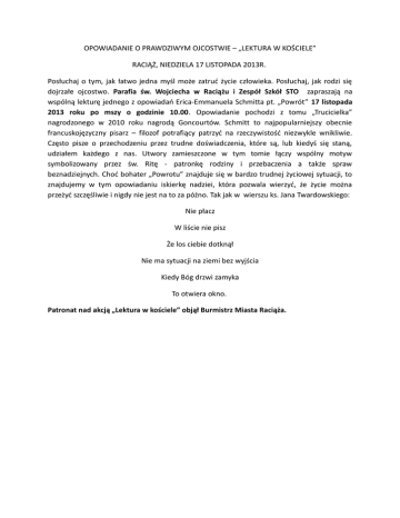OPOWIADANIE O PRAWDZIWYM OJCOSTWIE – „LEKTURA W KOŚCIELE” RACIĄŻ, NIEDZIELA 17 LISTOPADA 2013R. Posłuchaj o tym, jak łatwo jedna myśl może zatruć życie człowieka. Posłuchaj, jak rodzi się dojrzałe ojcostwo. Parafia św. Wojciecha w Raciążu i Zespół Szkół STO zapraszają na wspólną lekturę jednego z opowiadań Erica-Emmanuela Schmitta pt. „Powrót” 17 listopada 2013 roku po mszy o godzinie 10.00. Opowiadanie pochodzi z tomu „Trucicielka” nagrodzonego w 2010 roku nagrodą Goncourtów. Schmitt to najpopularniejszy obecnie francuskojęzyczny pisarz – filozof potrafiący patrzyć na rzeczywistość niezwykle wnikliwie. Często pisze o przechodzeniu przez trudne doświadczenia, które są, lub kiedyś się staną, udziałem każdego z nas. Utwory zamieszczone w tym tomie łączy wspólny motyw symbolizowany przez św. Ritę - patronkę rodziny i przebaczenia a także spraw beznadziejnych. Choć bohater „Powrotu” znajduje się w bardzo trudnej życiowej sytuacji, to znajdujemy w tym opowiadaniu iskierkę nadziei, która pozwala wierzyć, że życie można przeżyć szczęśliwie i nigdy nie jest na to za późno. Tak jak w wierszu ks. Jana Twardowskiego: Nie płacz W liście nie pisz Że los ciebie dotknął Nie ma sytuacji na ziemi bez wyjścia Kiedy Bóg drzwi zamyka To otwiera okno. Patronat nad akcją „Lektura w kościele” objął Burmistrz Miasta Raciąża.