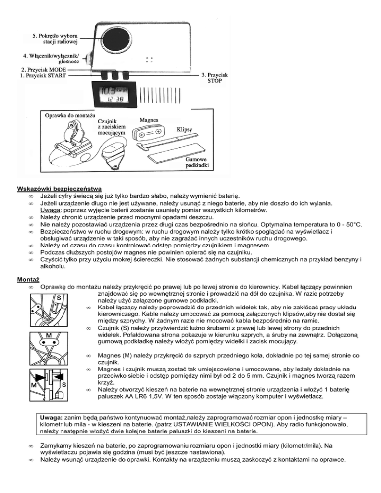 Wskazόwki bezpieczeństwa • Jeżeli cyfry świecą się już tylko bardzo słabo, należy wymienić baterię. • Jeżeli urządzenie długo nie jest używane, należy usunąć z niego baterie, aby nie doszło do ich wylania. Uwaga: poprzez wyjęcie baterii zostanie usunięty pomiar wszystkich kilometrόw. • Należy chronić urządzenie przed mocnymi opadami deszczu. • Nie należy pozostawiać urządzenia przez długi czas bezpośrednio na słońcu. Optymalna temperatura to 0 - 50°C. • Bezpieczeństwo w ruchu drogowym: w ruchu drogowym należy tylko krótko spoglądać na wyświetlacz i obsługiwać urządzenie w taki sposόb, aby nie zagrażać innych uczestników ruchu drogowego. • Należy od czasu do czasu kontrolować odstęp pomiędzy czujnikiem i magnesem. • Podczas dłuższych postojόw magnes nie powinien opierać się na czujniku. • Czyścić tylko przy użyciu mokrej ściereczki. Nie stosować żadnych substancji chemicznych na przykład benzyny i alkoholu. Montaż • Oprawkę do montażu należy przykręcić po prawej lub po lewej stronie do kierownicy. Kabel łączący powinnien znajdować się po wewnętrznej stronie i prowadzić na dół do czujnika. W razie potrzeby należy użyć załączone gumowe podkładki. • Kabel łączący należy poprowadzić do przednich widełek tak, aby nie zakłócać pracy układu kierowniczego. Kable należy umocować za pomocą załączonych klipsόw,aby nie dostał się między szprychy. W żadnym razie nie mocować kabla bezpośrednio na ramie. • Czujnik (S) należy przytwierdzić luźno śrubami z prawej lub lewej strony do przednich widełek. Pofałdowana strona pokazuje w kierunku szprych, a śruby na zewnątrz. Dołączoną gumową podkładkę należy włożyć pomiędzy widełki i zacisk mocujący. • • • Magnes (M) należy przykręcić do szprych przedniego koła, dokładnie po tej samej stronie co czujnik. Magnes i czujnik muszą zostać tak umiejscowione i umocowane, aby leżały dokładnie na przeciwko siebie i odstęp pomiędzy nimi był od 2 do 5 mm. Czujnik i magnes tworzą razem krzyż. Należy otworzyć kieszeń na baterie na wewnętrznej stronie urządzenia i włożyć 1 baterię paluszek AA LR6 1,5V. W ten sposόb zostaje włączony komputer i wyświetlacz. Uwaga: zanim będą państwo kontynuować montaż,należy zaprogramować rozmiar opon i jednostkę miary – kilometr lub mila - w kieszeni na baterie. (patrz USTAWIANIE WIELKOŚCI OPON). Aby radio funkcjonowało, należy następnie włożyć dwie kolejne baterie paluszki do kieszeni na baterie. • • Zamykamy kieszeń na baterie, po zaprogramowaniu rozmiaru opon i jednostki miary (kilometr/mila). Na wyświetlaczu pojawia się godzina (musi być jeszcze nastawiona). Należy wsunąć urządzenie do oprawki. Kontakty na urządzeniu muszą zaskoczyć z kontaktami na oprawce. • Należy podnieść przednie koło i zakręcić nim. Jeżeli magnes i czujnik zostały odpowiednio zamontowane, na wyświetlaczu w gόrnym szeregu powinnien pojawić sie pomiar prędkości. Jeżeli tak nie jest, należy dopasować na nowo położenie magnesu i czujnika. Ustawianie wielkości opon Aby można dokonać dokładnego pomiaru prędkości i przebiegu, musi zostać zaprogramowany obwód przedniej opony. Należy zaznaczyć kredą punkt na oponie i zmierzyć taśmą mierniczą obwód opony lub zmierzyć zewnętrzną przekątną przedniego koła i można wtedy obliczyć obwód według formuły: przekątna x 3,14 = obwód. Powszechnie stosowane rozmiary opon zostały zapisane w tabeli. Wielkość w calach Obwόd w mm 24 x 1.75 26 x 1.50 26 x 1.75 28 x 1.75 1880 2030 2045 2150 • • • • Aby ustawić wielkość opony, należy przesunąć prawy włącznik w kieszeni na baterie na pozycję „Rad“ . Na wyświetlaczu zaświeci się w dolnym szeregu pierwsza z czterech cyfr. Za pomocą przycisku Start (1) należy ustawić pierwszą cyfrę. Następnie należy nacisnąć przycisk Stop (3) i potem przyciskiem Start (1) ustawić drugą cyfrę. Te czynności należy tak długo powtarzać, aż wszystkie cztery cyfry pojawią się na wyświetlaczu. Na zakończenie należy przesunąć prawy włącznik w kieszeni na baterię na pozycje „Betrieb“. W ten sposόb zostaje zapamiętana w komputerze wielkość opony potrzebna do poprawnego pomiaru prędkości i przebiegu. Zmiana z KM na mile • Wybraną jednostkę pomiaru nastawia się za pomocą lewego włącznik w kieszeni na baterię. Ustawienie czasu • Aby ustawić czas, należy nacisnąć przycisk Mode (2). Na wyświetlaczu pojawi się dwukropek. • Należy trzymać przyciśnięty przcisk Stop (3) około 2 sekundy, aż do momentu gdy godzina zacznie pulsować i wtedy można przyciskiem Start (1) ustwić godzinę. • Należy ponownie trzymać przyciśnięty przcisk Stop (3), aż do momentu gdy minutnik zacznie pulsować i wtedy można przyciskiem Start (1) ustawić minuty. • Poprzez kolejne przyciśnięcie przycisku Stop (3) czas zostanie zapamiętany w komputerze i rozpoczyna się liczenie czasu. Wyświetlanie prędkości Pomiar prędkości jest automatycznie wyświetlany w górnej części wyświetlacza, stopniowo co 0,5 km/h. Wyświetlanie dziennego przebiegu kilometrόw (DST) Pomiar przebiegu rozpoczyna się w miejscu startu i jest pokazywany w dolnej części wyświetlacza z dopiskiem “DST”. W celu ustawienia dziennego przebiegu należy nacisnąć przycisk Mode(2), aż do momentu pojawienia sie DST na wyświetlaczu. Poprzez przyciśnięcie przycisku Start (1) pomiar kilometrόw zostanie uruchomiony. Ponowne naciśnięcie przycisku Stop (3) zatrzymuje ten pomiar w każdej chwili. Jeżeli naciśniemy przycisk Stop (3) trzymając go przez około 3 sekundy, dokonamy kasacji licznika automatycznie do stanu 0. Wyświetlanie całkowitego przebiegu (ACC) Całkowity przebieg jest automatycznie zapamiętywany i sumowany. Jest on pokazywany w dolnej części wyświetlacza z dopiskiem “ACC”. W celu ustawienia całko