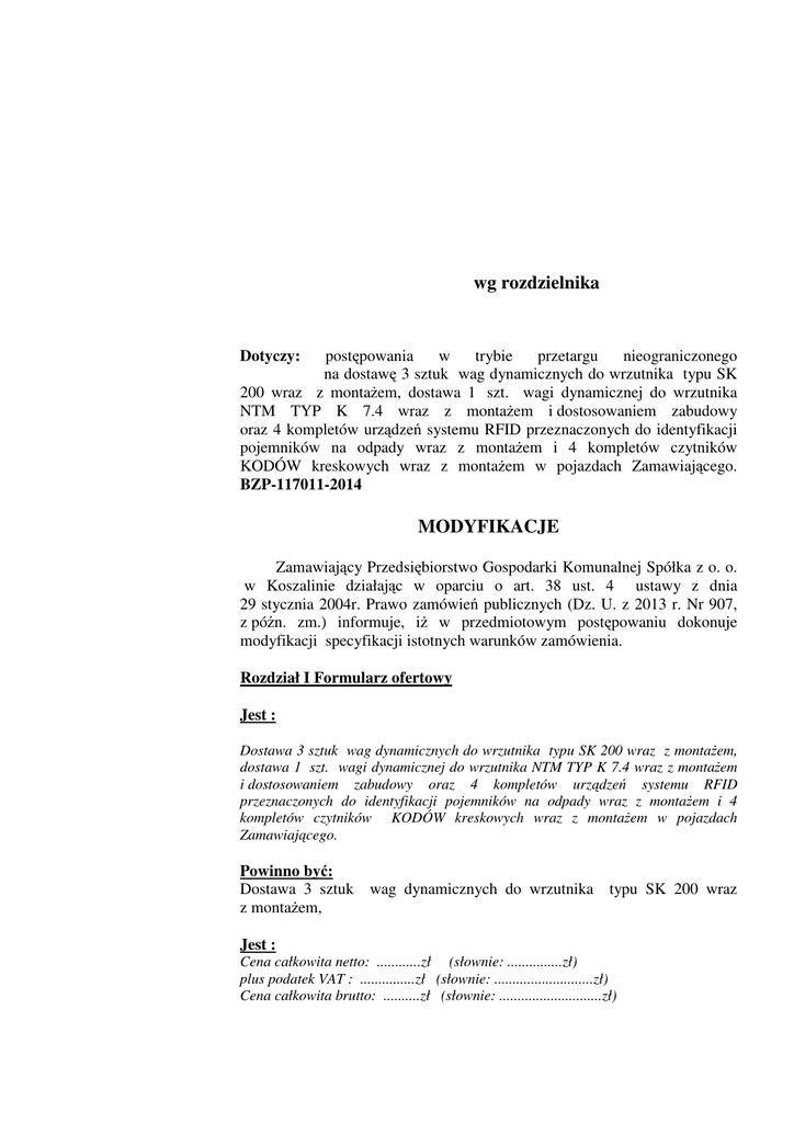 wg rozdzielnika postępowania w trybie przetargu nieograniczonego na dostawę 3 sztuk wag dynamicznych do wrzutnika typu SK 200 wraz z montażem, dostawa 1 szt. wagi dynamicznej do wrzutnika NTM TYP K 7.4 wraz z montażem i dostosowaniem zabudowy oraz 4 kompletów urządzeń systemu RFID przeznaczonych do identyfikacji pojemników na odpady wraz z montażem i 4 kompletów czytników KODÓW kreskowych wraz z montażem w pojazdach Zamawiającego. BZP-117011-2014 Dotyczy: MODYFIKACJE Zamawiający Przedsiębiorstwo Gospodarki Komunalnej Spółka z o. o. w Koszalinie działając w oparciu o art. 38 ust. 4 ustawy z dnia 29 stycznia 2004r. Prawo zamówień publicznych (Dz. U. z 2013 r. Nr 907, z późn. zm.) informuje, iż w przedmiotowym postępowaniu dokonuje modyfikacji specyfikacji istotnych warunków zamówienia. Rozdział I Formularz ofertowy Jest : Dostawa 3 sztuk wag dynamicznych do wrzutnika typu SK 200 wraz z montażem, dostawa 1 szt. wagi dynamicznej do wrzutnika NTM TYP K 7.4 wraz z montażem i dostosowaniem zabudowy oraz 4 kompletów urządzeń systemu RFID przeznaczonych do identyfikacji pojemników na odpady wraz z montażem i 4 kompletów czytników KODÓW kreskowych wraz z montażem w pojazdach Zamawiającego. Powinno być: Dostawa 3 sztuk z montażem, wag dynamicznych do wrzutnika typu SK 200 wraz Jest : Cena całkowita netto: ............zł (słownie: ...............zł) plus podatek VAT : ...............zł (słownie: ...........................zł) Cena całkowita brutto: ..........zł (słownie: ............................zł) W tym cena: - za jedną wagę dynamiczną z montażem do wrzutnika typu SK 200: Cena netto: ....................................zł (słownie: ...............................zł) plus podatek VAT : .........................zł (słownie: ...............................zł) Cena brutto: ....................................zł (słownie: ...............................zł) - za jedną wagę dynamiczną z montażem do wrzutnika NTM TYP K 7.4 Cena netto: ....................................zł (słownie: ...............................zł) plus podatek VAT : .........................zł (słownie: ...............................zł) Cena brutto: ....................................zł (słownie: ...............................zł) - za jeden komplet urządzeń do odczytu RFID z montażem: Cena netto: ....................................zł (słownie: ...............................zł) plus podatek VAT : .........................zł (słownie: ...............................zł) Cena brutto: ....................................zł (słownie: ...............................zł) - za jeden komplet urządzeń do odczytu kodów kreskowych z montażem: Cena netto: ....................................zł (słownie: ...............................zł) plus podatek VAT : .........................zł (słownie: ...............................zł) Cena brutto: ....................................zł (słownie: ...............................zł) Powinno być: Cena całkowita netto za dostawę 3 wag dynamicznych z montażem do wrzutnika typu SK 200: ............zł (słownie: ...............zł) plus podatek VAT : ...............zł (słownie: ...........................zł) Cena całkowita brutto: ..........zł (słownie: ............................zł) W tym cena: - za jedną wagę dynamiczną z montażem do wrzutnika typu SK 200: Cena netto: .....................................zł (słownie: ...............................zł) plus podatek VAT : .........................zł (słownie: ...............................zł) Cena brutto: ....................................zł (słownie: ...............................zł) Jest : Zobowiązania Wykonawcy: 1. Zobowiązuję się dostarczyć przedmiot zamówienia w terminie do dnia …………. . 2. Oświadczam, że całkowity okres gwarancji na wagę dynamiczną z montażem wynosi ……. miesięcy; 3. Oświadczam, że całkowity okres gwarancji na komplet urządzeń do odczytu RFID z montażem wynosi …….. miesiące; 4. Oświadczam, że całkowity okres gwarancji na komplet urządzeń do odczytu kodów kreskowych z montażem wynosi …….. miesiące; 5. Oświadczam, że całkowity okres gwarancji na terminal na zainstalowane oprogramowanie z montażem wynosi ……miesiące; Powinno być: 1. Zobowiązuję się dostarczyć przedmiot zamówienia w terminie do dnia …………. . 2. Oświadczam, że całkowity okres gwarancji na wagi dynamiczne z montażem wynosi 12 miesięcy; Rozdział II Opis przedmiotu zamówienia Jest : Zmienia się opis przedmiotu zamówienia wg klasyfikacji, 38 . 31 . 10 . 00 – 8 Waga elektroniczna i akcesoria 30 . 21 . 61 . 30 – 6 Czytniki kodu kreskowego 31 . 71 . 00 . 00 – 6 Sprzęt elektroniczny 48 . 00 . 00 . 00 – 8 Pakiety oprogramowania i systemy informatyczne Powinno być: 38 . 31 . 10 . 00 – 8 Waga elektroniczna i akcesoria Jest : OPIS PRZEDMIOTU ZAMÓWIENIA DOSTAWA 3SZT WAG DYNAMICZNYCH DO WRZUTNIKA TYPU SK 200 WRAZ Z MONTAŻEM, DOSTAWA 1 SZT WAGI DYNAMICZNEJ DO WRZUTNIKA NTM TYP K 7.4 WRAZ Z MONTAŻEM I DOSTOSOWANIEM ZABUDOWY,4 KOMPLETÓW URZĄDZEŃ SYSTEMU RFID PRZEZNACZONYCH DO IDENTYFIKACJI POJEMNIKÓW NA ODPADY WRAZ Z MONTAŻEM ORAZ 4 KOMPLETÓW CZYTNIKÓW KODÓW KRESKOWYCH, WRAZ Z MONTAŻEM W POJAZDACH ZAMAWIAJĄCEGO Powinno być: Opis przedmiotu zamówienia: wraz z montażem Dostawa 3 szt. wag dynamicznych do wrzutnika typu SK 200 Jest : 1. Przedmiot dostawy : Trzy wagi samochodowe dynamiczne do urządzenia zasypowego śmieciarki typ SK 200, wraz z montażem. Jedna waga samochodowa dynamiczna do urządzenia zasypowego śmieciarki typ NTM K 7.4, wraz z dostosowaniem urządzeń załadowczych i montażem. Cztery komplety urządzeń systemu RFID przeznaczonych do identyfikacji pojemników na odpady i czytników kodów kreskowych wraz z montażem do w/w urządzeń zasypowych. Powinno być: 1. Przedmiot dostawy :Trzy wagi samochodowe dynamiczne do urządzenia zasypoweg