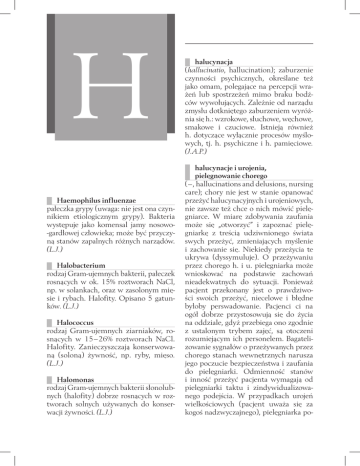 H Haemophilus influenzae pałeczka grypy (uwaga: nie jest ona czynnikiem etiologicznym grypy). Bakteria występuje jako komensal jamy nosowo-gardłowej człowieka; może być przyczyną stanów zapalnych różnych narządów. (L.J.) Halobacterium rodzaj Gram-ujemnych bakterii, pałeczek rosnących w ok. 15% roztworach NaCl, np. w solankach, oraz w zasolonym mięsie i rybach. Halofity. Opisano 5 gatunków. (L.J.) Halococcus rodzaj Gram-ujemnych ziarniaków, rosnących w 15–26% roztworach NaCl. Halofity. Zanieczyszczają konserwowaną (soloną) żywność, np. ryby, mięso. (L.J.) Halomonas rodzaj Gram-ujemnych bakterii słonolubnych (halofity) dobrze rosnących w roztworach solnych używanych do konserwacji żywności. (L.J.) halucynacja (hallucinatio, hallucination); zaburzenie czynności psychicznych, określane też jako omam, polegające na percepcji wrażeń lub spostrzeżeń mimo braku bodźców wywołujących. Zależnie od narządu zmysłu dotkniętego zaburzeniem wyróżnia się h.: wzrokowe, słuchowe, węchowe, smakowe i czuciowe. Istnieją również h. dotyczące wyłącznie procesów myślowych, tj. h. psychiczne i h. pamięciowe. (J.A.P.) halucynacje i urojenia, pielęgnowanie chorego (–, hallucinations and delusions, nursing care); chory nie jest w stanie opanować przeżyć halucynacyjnych i urojeniowych, nie zawsze też chce o nich mówić pielęgniarce. W miarę zdobywania zaufania może się „otworzyć” i zapoznać pielęgniarkę z treścią udziwnionego świata swych przeżyć, zmieniających myślenie i zachowanie się. Niekiedy przeżycia te ukrywa (dyssymuluje). O przeżywaniu przez chorego h. i u. pielęgniarka może wnioskować na podstawie zachowań nieadekwatnych do sytuacji. Ponieważ pacjent przekonany jest o prawdziwości swoich przeżyć, niecelowe i błędne byłoby perswadowanie. Pacjenci ci na ogół dobrze przystosowują się do życia na oddziale, gdyż przebiega ono zgodnie z ustalonym trybem zajęć, są otoczeni rozumiejącym ich personelem. Bagatelizowanie sygnałów o przeżywanych przez chorego stanach wewnętrznych narusza jego poczucie bezpieczeństwa i zaufania do pielęgniarki. Odmienność stanów i inność przeżyć pacjenta wymagają od pielęgniarki taktu i zindywidualizowanego podejścia. W przypadkach urojeń wielkościowych (pacjent uważa się za kogoś nadzwyczajnego), pielęgniarka po- halucynoza 288 winna ochronić go przed porażką, nie pobudzając do współzawodnictwa i rywalizacji z innymi chorymi, mającymi także urojenia wielkościowe, gdyż wymaga to szczególnej koncentracji intelektualnej ze strony pacjenta. Umiarkowana koncentracja (liczenie, odmierzanie, przepisywanie) jest wskazana, by nie pozostawiać choremu czasu na rozważanie urojeń. W terapii zajęciowej pielęgniarka powinna odpowiednio łączyć chorych: skłonni do agresji i dominacji nie mogą pracować z chorymi depresyjnymi i lękowymi, gdyż ich ekspansywność może pogłębiać te stany. Pielęgniarka powinna obserwować tych chorych, którzy mogą zagrażać sobie lub innym, posługując się narzędziami pracy. Ważne jest przewidywanie i zapobieganie agresji, autoagresji i czynom impulsywnym. W sytuacjach, gdy pacjent czuje się zagrożony, może atakować innych, może usiłować popełnić samobójstwo, ponieważ się boi. (K.K.) transmitter, który zwiększa przepuszczalność błony dla jonów K+ i Cl–. Jony K+ wychodzą z wnętrza neuronu, jony zaś Cl– wchodzą do jego wnętrza, powodując zwiększenie ujemnego potencjału elektrycznego wewnątrz neuronu. W czasie trwania h.p.p. pobudliwość neuronu jest obniżona, co jest równoznaczne z jego hamowaniem. H.p.p., podobnie jak pobudzający potencjał postsynaptyczny, wykazuje sumowanie czasowe i przestrzenne. H.p.p. jest wywoływany przez transmittery hamujące. Zalicza się do nich kwas gamma-aminomasłowy (GABA) i glicynę. (A.M.N.) halucynoza (hallucinosis); termin stosowany najczęściej w odniesieniu do zespołu psychopatologicznego (omamica) o różnej etiologii, np. infekcyjnej lub alkoholowej, charakteryzującego się dominującymi w obrazie klinicznym halucynacjami. Mianem h. określa się czasem pojedyncze zmysłowe przeżycia omamowe, występujące przy zachowanym poczuciu nierealności odbieranych postrzeżeń (halucynoidy, halucynacje neurologiczne). (J.A.P.) hapten (–, hapten); mała cząsteczka, sama niezdolna do działania antygenowego i wywołania → odpowiedzi immunologicznej, ale mogąca ją wywołać po połączeniu z białkiem, zwanym nośnym lub nośnikiem. H. mogą być substancje nieorganiczne, lipidy, kwasy nukleinowe, niektóre leki (penicylina) i in., białkiem nośnym są natomiast m.in. białka surowicy, skóry, błony komórkowej → krwinek czerwonych i → płytek krwi. (T.S.) hamujący potencjał postsynaptyczny (–, IPSP – inhibitory postsynaptic potential); zwiększenie spoczynkowej różnicy potencjałów błony komórkowej neuronu wywołane aktywnością synapsy hamującej. Synapsa hamująca uwalnia haploid (–, haploid); komórka lub organizm z pojedynczym genomem (pojedynczym zestawem chromosomów). U człowieka takie komórki mogą powstać w warunkach patologicznych, np. w rozroście nowotworowym. (J.R.K.) HbA1c → hemoglobina glikowana HBAb (–, hepatitis B antibody); przeciwciało skierowane przeciw antygenowi wirusa zapalenia wątroby typu B, HBAg. (L.J.) 289 HBAg (–, hepatitis B antigen); antygen wirusa zapalenia wątroby typu B. (L.J.) HBcAg (–, hepatitis B central antigen); antygen rdzeniowy wirusa zapalenia wątroby. (L.J.) HBeAg (–, hepatitis B entire antigen); antygen e hepadnawirusa nr 1 (odmienny od HBsAg i HBcAg). (L.J.) HBsAb (–, hepatitis B spherical antibody); przeciwciało antygenu powierzchniowego wirusa zapalenia wątroby typu B. (L.J.) HBsAg (–, hepatitis B spherical antigen); antygen powierzchniowy hepadnawirusa nr 1. (L.J.) HBV (hepatitis B virus); wirus zapalenia wątroby typu B. (L.J.) hematoksylina i