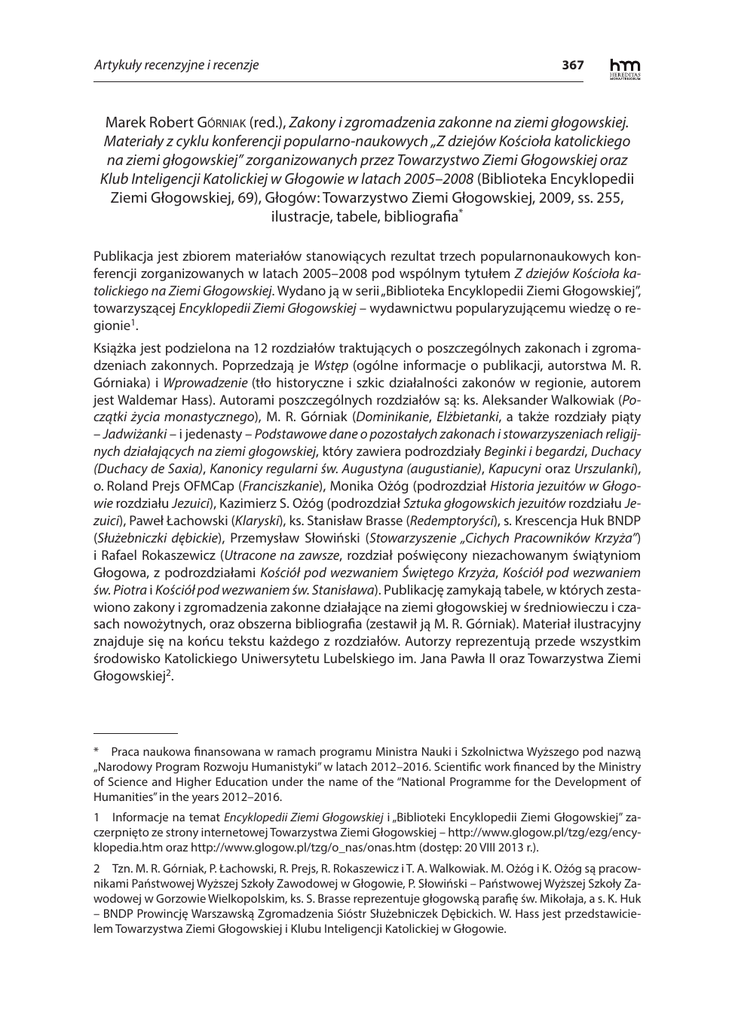 Artykuły recenzyjne i recenzje 367 Marek Robert Górniak (red.), Zakony i zgromadzenia zakonne na ziemi głogowskiej. Materiały z cyklu konferencji popularno-naukowych „Z dziejów Kościoła katolickiego na ziemi głogowskiej” zorganizowanych przez Towarzystwo Ziemi Głogowskiej oraz Klub Inteligencji Katolickiej w Głogowie w latach 2005–2008 (Biblioteka Encyklopedii Ziemi Głogowskiej, 69), Głogów: Towarzystwo Ziemi Głogowskiej, 2009, ss. 255, ilustracje, tabele, bibliografia* Publikacja jest zbiorem materiałów stanowiących rezultat trzech popularnonaukowych konferencji zorganizowanych w latach 2005–2008 pod wspólnym tytułem Z dziejów Kościoła katolickiego na Ziemi Głogowskiej. Wydano ją w serii „Biblioteka Encyklopedii Ziemi Głogowskiej”, towarzyszącej Encyklopedii Ziemi Głogowskiej – wydawnictwu popularyzującemu wiedzę o regionie1. Książka jest podzielona na 12 rozdziałów traktujących o poszczególnych zakonach i zgromadzeniach zakonnych. Poprzedzają je Wstęp (ogólne informacje o publikacji, autorstwa M. R. Górniaka) i Wprowadzenie (tło historyczne i szkic działalności zakonów w regionie, autorem jest Waldemar Hass). Autorami poszczególnych rozdziałów są: ks. Aleksander Walkowiak (Początki życia monastycznego), M. R. Górniak (Dominikanie, Elżbietanki, a także rozdziały piąty – Jadwiżanki – i jedenasty – Podstawowe dane o pozostałych zakonach i stowarzyszeniach religijnych działających na ziemi głogowskiej, który zawiera podrozdziały Beginki i begardzi, Duchacy (Duchacy de Saxia), Kanonicy regularni św. Augustyna (augustianie), Kapucyni oraz Urszulanki), o. Roland Prejs OFMCap (Franciszkanie), Monika Ożóg (podrozdział Historia jezuitów w Głogowie rozdziału Jezuici), Kazimierz S. Ożóg (podrozdział Sztuka głogowskich jezuitów rozdziału Jezuici), Paweł Łachowski (Klaryski), ks. Stanisław Brasse (Redemptoryści), s. Krescencja Huk BNDP (Służebniczki dębickie), Przemysław Słowiński (Stowarzyszenie „Cichych Pracowników Krzyża”) i Rafael Rokaszewicz (Utracone na zawsze, rozdział poświęcony niezachowanym świątyniom Głogowa, z podrozdziałami Kościół pod wezwaniem Świętego Krzyża, Kościół pod wezwaniem św. Piotra i Kościół pod wezwaniem św. Stanisława). Publikację zamykają tabele, w których zestawiono zakony i zgromadzenia zakonne działające na ziemi głogowskiej w średniowieczu i czasach nowożytnych, oraz obszerna bibliografia (zestawił ją M. R. Górniak). Materiał ilustracyjny znajduje się na końcu tekstu każdego z rozdziałów. Autorzy reprezentują przede wszystkim środowisko Katolickiego Uniwersytetu Lubelskiego im. Jana Pawła II oraz Towarzystwa Ziemi Głogowskiej2. * Praca naukowa finansowana w ramach programu Ministra Nauki i Szkolnictwa Wyższego pod nazwą „Narodowy Program Rozwoju Humanistyki” w latach 2012–2016. Scientific work financed by the Ministry of Science and Higher Education under the name of the “National Programme for the Development of Humanities” in the years 2012–2016. 1 Informacje na temat Encyklopedii Ziemi Głogowskiej i „Biblioteki Encyklopedii Ziemi Głogowskiej” zaczerpnięto ze strony internetowej Towarzystwa Ziemi Głogowskiej – http://www.glogow.pl/tzg/ezg/encyklopedia.htm oraz http://www.glogow.pl/tzg/o_nas/onas.htm (dostęp: 20 VIII 2013 r.). 2 Tzn. M. R. Górniak, P. Łachowski, R. Prejs, R. Rokaszewicz i T. A. Walkowiak. M. Ożóg i K. Ożóg są pracownikami Państwowej Wyższej Szkoły Zawodowej w Głogowie, P. Słowiński – Państwowej Wyższej Szkoły Zawodowej w Gorzowie Wielkopolskim, ks. S. Brasse reprezentuje głogowską parafię św. Mikołaja, a s. K. Huk – BNDP Prowincję Warszawską Zgromadzenia Sióstr Służebniczek Dębickich. W. Hass jest przedstawicielem Towarzystwa Ziemi Głogowskiej i Klubu Inteligencji Katolickiej w Głogowie. 368 Artykuły recenzyjne i recenzje Praca nie zgłasza pretensji do całościowego, wyczerpującego ujęcia tematu – ma być „poważnym przyczynkiem do poznania historii instytutów życia konsekrowanego”3. We Wstępie zaznaczono, że bogactwo i różnorodność materiału uniemożliwia jego kompletne przedstawienie; ponadto materiał ów jest dla poszczególnych zakonów i zgromadzeń zakonnych zróżnicowany ilościowo, „stąd nie wszystkie tematy zostały opracowane jednakowo pod względem redakcyjnym”4. Wydaje się, że celniejszym określeniem byłoby tu „opracowanie redakcyjne i merytoryczne”, poszczególne rozdziały prezentują bowiem różny poziom – redakcyjny, merytoryczny i koncepcyjny. Niestety, sprawia to wrażenie chaosu. Co prawda większość rozdziałów napisana jest według jednego schematu kompozycyjnego (szkic historii danego zgromadzenia, jego dzieje na ziemi głogowskiej), jednak poszczególni autorzy różnie porozkładali akcenty, czasem zbyt szeroko traktując uwagi wprowadzające do swoich artykułów. Mam tu na myśli zwłaszcza rozdziały poświęcone kapucynom i elżbietankom – w pierwszym wypadku artykuł zajmuje 7 stron, a kapucynom w Głogowskiem poświęcony jest... ostatni akapit5; w drugim – z 16 stron tekstu 6 zajmują opis powstania i działalności oraz charakterystyka zakonu6. Innym mankamentem jest opatrzenie przypisami tylko części artykułów (pozostałe są zakończone spisem wykorzystanej literatury)7. Różny jest też poziom szczegółowości podawanych informacji; rozdział o dominikanach przynosi w zasadzie podstawowe informacje o dziejach konwentu, postaciach z nim związanych i środowisku jego działania8, jezuici doczekali się osobnego rozdziału opisującego pod względem architektonicznym ich kościół9 (pozostałe opisy architektoniczne są bardziej ogólne), a rozdział o Stowarzyszeniu „Cichych Pracowników Krzyża” przytłacza ilością informacji (nie zawsze w opracowaniu naukowym koniecznych, jak np. lista zabiegów oferowanych chorym pensjonariuszom zakładu prowadzoneg