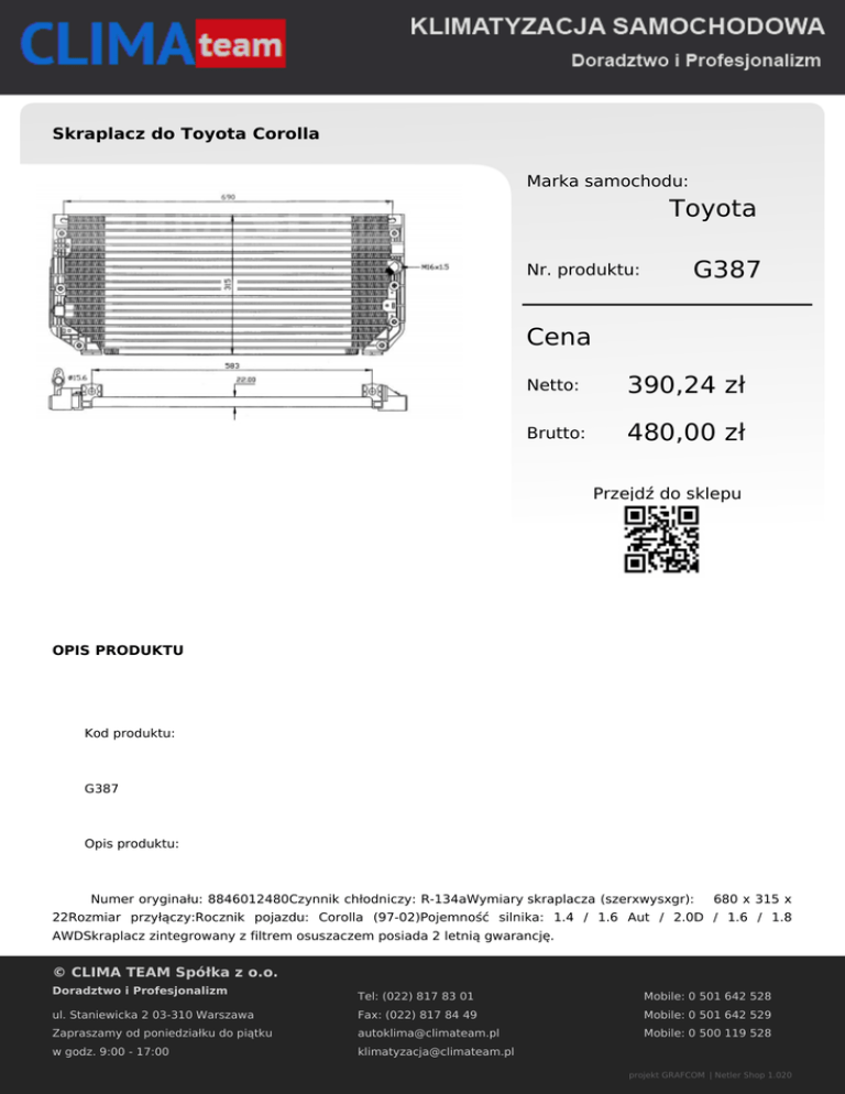 Skraplacz do Toyota Corolla Marka samochodu: Toyota Nr. produktu: G387 Cena Netto: 390,24 zł Brutto: 480,00 zł Przejdź do sklepu OPIS PRODUKTU Kod produktu: G387 Opis produktu: Numer oryginału: 8846012480Czynnik chłodniczy: R-134aWymiary skraplacza (szerxwysxgr): 680 x 315 x 22Rozmiar przyłączy:Rocznik pojazdu: Corolla (97-02)Pojemność silnika: 1.4 / 1.6 Aut / 2.0D / 1.6 / 1.8 AWDSkraplacz zintegrowany z filtrem osuszaczem posiada 2 letnią gwarancję. © CLIMA TEAM Spółka z o.o. Doradztwo i Profesjonalizm Tel: (022) 817 83 01 Mobile: 0 501 642 528 ul. Staniewicka 2 03-310 Warszawa Fax: (022) 817 84 49 Mobile: 0 501 642 529 Zapraszamy od poniedziałku do piątku [email protected] Mobile: 0 500 119 528 w godz. 9:00 - 17:00 [email protected] projekt GRAFCOM | Netler Shop 1.020 © CLIMA TEAM Spółka z o.o. Doradztwo i Profesjonalizm Tel: (022) 817 83 01 Mobile: 0 501 642 528 ul. Staniewicka 2 03-310 Warszawa Fax: (022) 817 84 49 Mobile: 0 501 642 529 Zapraszamy od poniedziałku do piątku [email protected] Mobile: 0 500 119 528 w godz. 9:00 - 17:00 [email protected] projekt GRAFCOM | Netler Shop 1.020