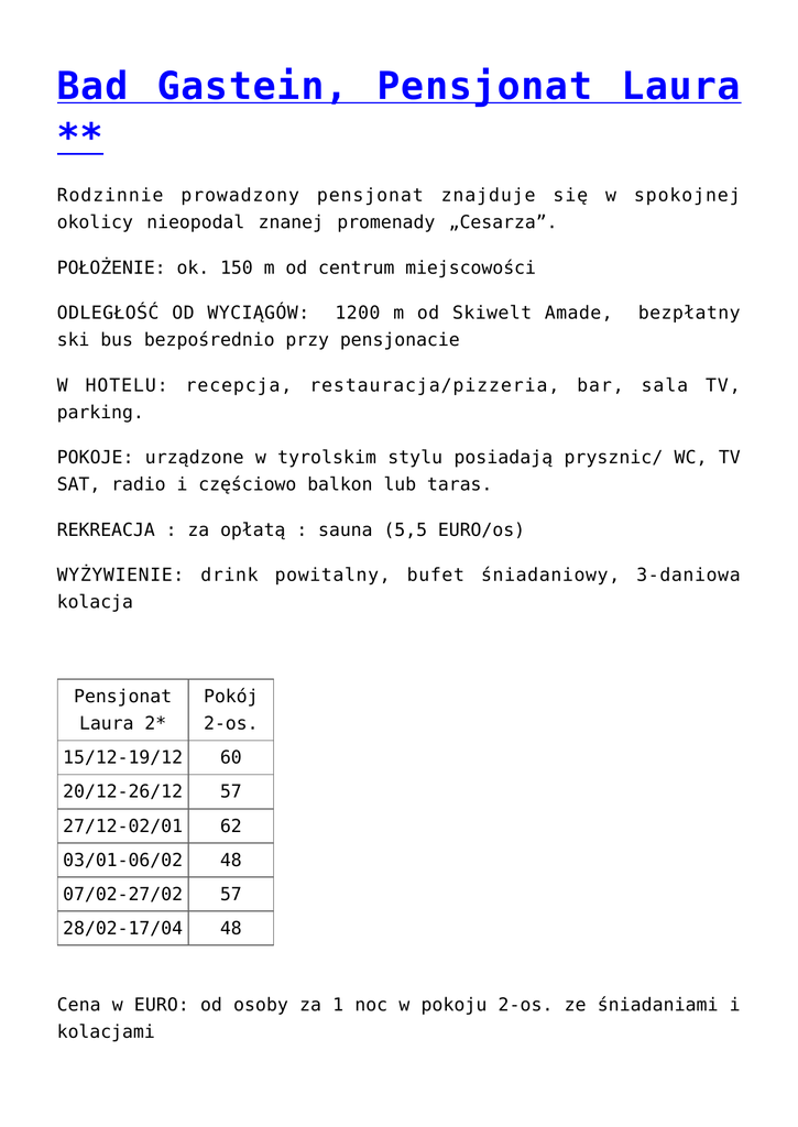 Bad Gastein, Pensjonat Laura ** Rodzinnie prowadzony pensjonat znajduje się w spokojnej okolicy nieopodal znanej promenady „Cesarza”. POŁOŻENIE: ok. 150 m od centrum miejscowości ODLEGŁOŚĆ OD WYCIĄGÓW: 1200 m od Skiwelt Amade, ski bus bezpośrednio przy pensjonacie bezpłatny W HOTELU: recepcja, restauracja/pizzeria, bar, sala TV, parking. POKOJE: urządzone w tyrolskim stylu posiadają prysznic/ WC, TV SAT, radio i częściowo balkon lub taras. REKREACJA : za opłatą : sauna (5,5 EURO/os) WYŻYWIENIE: drink powitalny, bufet śniadaniowy, 3-daniowa kolacja Pensjonat Laura 2* Pokój 2-os. 15/12-19/12 60 20/12-26/12 57 27/12-02/01 62 03/01-06/02 48 07/02-27/02 57 28/02-17/04 48 Cena w EURO: od osoby za 1 noc w pokoju 2-os. ze śniadaniami i kolacjami Zniżki: dzieci z 2 osobami dorosłymi: dziecko do 10 lat gratis, 10-14 lat 50% Pobyty: sobota/ sobota Inne: taksa klimatyczna EURO/os/noc/powyżej 15 lat do zapłaty na miejscu 2 Oferta: 7=6 nocy w terminie 03/01-06/02 oraz 28/02-17/04 Zell am Ziller, Tirolerhof **** Hotel Rodzinnie prowadzony hotel będący od 2012 roku członkiem „Lifestylehotel” POŁOŻENIE: położony w centrum Zell am Ziller, 8 km od Mayrhofen ODLEGŁOŚĆ OD WYCIĄGÓW: ok. 800 m do najbliższych wyciągów, bezpłatny ski bus zatrzymuje się przed hotelem W HOTELU: lobby, winda, restauracja, jadalnia, bar, ogrzewana narciarnia, sala do gier i zabaw dla dzieci, parking 80 m od hotelu REKREACJA: sauny, kabina na podczerwień, łaźnia turecka (16:00-20:00) POKOJE: z łazienkami, radiem, telefonem, TV kablową, niektóre z balkonem. WYŻYWIENIE: bufet śniadaniowy, 4- daniowe kolacje (menu do wyboru z 3 zestawów), 2 x tydzień przekąska popołudniowa (kanapki, napoje za dodatkową opłatą) Hotel Tirolerhof 4* Pokój 2-os. 04/12-19/12 68 20/12-26/12 84 27/12-02/01 108 03/01-09/01 84 10/01-30/01 77 31/01-13/03 88 14/03-10/04 77 Cena w Euro: od osoby w pokoju 2-os., ze śniadaniami, kolacjami oraz 2 x w tygodniu przekąska popołudniowa (bez napojów). Zniżki: dzieci z 2 osobami dorosłymi: dziecko do lat 6 gratis, 6-12 lat 50%, powyżej 12 lat 10% Inne: taksa turystyczna do EURO/os/noc/powyżej 16 lat zapłaty na miejscu 1,2 Oferta: 7=6 nocy w terminie 04/12-19/12, 14/03-20/03 oraz 04/04-10/04 Kitzbühel, Hotel Bruggerhof *** Rodzinny hotel składający się z 4 budynków. POŁOŻENIE: oddalony 2 km od centrum ODLEGŁOŚĆ OD WYCIĄGÓW: 2 km od Hornbahn i Hahnenkammbahn, bezpłatny ski bus przed hotelem. W HOTELU: recepcja, lobby, jadalnia, restauracja, bar, narciarnia, parking, WLAN bezpłatnie w lobby. POKOJE: nowoczesne, z łazienką telefonem, TV kablową REKREACJA: hotel posiada strefę wellness i studio fitness, do dyspozycji gości kryty basen12,5 m x12,5 m), whirlpool, sauna fińska, biosauna, solarium, napoje witaminizowane- wszystko w cenie (10.00-22.00). Za opłatą można skorzystać z masaży i zabiegów upiększających. WYŻYWIENIE: śniadania w formie bufetu, 4-daniowe kolacje (możliwość wyboru zestawu) z bufetem sałatkowym, raz w tygodniu farmerski bufet. Hotel Bruggerhof 3* Pokój 2-os. 13/12-26/12 87 27/12-02/01 103 03/01-06/02 84 07/02-27/02 92 28/02-28/03 82 Cena w EURO: od osoby za 1 noc w pokoju 2-os., ze śniadaniami i kolacjami Zniżki: dzieci z 2 osobami dorosłymi w pokoju 2-os.: dziecko do 5 lat gratis, 6-14 lat 50%, powyżej 14 lat 10% Pobyty: sobota/ sobota Inne: taksa turystyczna płatna na miejscu 1,80 Euro/os/noc powyżej 15 lat Oferta: 7=6 nocy w terminie 13/12-20/12, 03/01-06/02 oraz 28/02-28/03 Saalbach, Bohmerwald *** Pensjonat POŁOŻENIE: w słonecznym miejscu, 700 m od centrum Hinterglemm oraz 2 km od Saalbach ODLEGŁOŚĆ OD WYCIĄGÓW: 80 m od Mitteregg Schlepplift, ski bus 100 m od obiektu W HOTELU: sala śniadaniowa, ogrzewana narciarnia, parking POKOJE: z łazienką, TV kablową, radiem REKREACJA: sauna (16.00-20.00), za opłatą solarium WYŻYWIENIE: śniadania w formie bufetu; Pensjonat Bohmerwald 3* Pokój 2-os. 20/12-02/01 52 03/01-30/01 42 31/01-20/02 52 21/02-10/04 42 Cena w EURO: od osoby za noc w pokoju 2-os., ze śniadaniami Zniżki: dzieci w pokoju z 2 osobami dorosłymi; dziecko do 6 lat gratis , 6-12 lat 50%, 12- 15 lat 30% Pobyty: sobota/ sobota, min. 7 noclegów Oferta: 7=6 w terminie 03/01-23/01 oraz 28/02 – 10/04 Saalbach, Gasthof Unterwirt *** Znany ośrodek sportów zimowych położony w bezwietrznej dolinie ok. 30 km na północnym zachodzie od Zell am See. Miejsce rozgrywek Pucharu Świata w narciarstwie alpejskim. Trzy miejscowości Saalbach, Hinterglemm oraz Leogang połączone są siecią wyciągów i tras tworząc wspaniały kompleks zwany cyrkiem narciarskim. Przyjazne dla rodzin, szerokie stoki Kohlmaiskopf, Bernkogel, Reiterkogel i Spieleckkogel i stromy zjazd z mierzącej 2020 m n.p.m. góry Schattenberg. Każdy znajdzie coś dla siebie – zarówno narciarze jeżdżący rekreacyjnie jak i lubiący szybkość narciarze z ambicjami. W dolinie darmowe, kursujące od godz. 9 do 17 pomiędzy poszczególnymi miejscowościami ski busy odwożą narciarzy z powrotem do punktu wyjścia. POŁOŻENIE: tradycyjny, rodzinny hotel położony w centrum Saalbach ODLEGŁOŚĆ OD WYCIĄGÓW: 30 m od wyciągu Schattberg W HOTELU: recepcja, restauracja, winda, parking POKOJE: gustownie urządzone, z łazienką i suszarką do włosów, TV SAT, radiem i telefonem. REKREACJA: w cenie siłownia, sauna (16.00-19:30), za opłatą solarium WYŻYWIENIE: śniadania w formie bufetu, 4-daniowe kolacje ( menu do wyboru z 2 zestawów + bufet przekąsek i sałatek). Gasthof Unterwirt 3* Pokój 2-os. 20/12-26/12 110 27/12-02/01 127 03/01-30/01 110 31/01-27/02 118 28/02-05/05 106 Cena w EURO: od osoby za 1 noc w pokoju 2-os., ze śniadaniami i kolacjami Zniżki: dzieci w pokoju z 2 osobami dorosłymi; dziecko do 6 lat gratis, 6-14 lat 80% zniżki, powyżej 14 lat 10%; Pobyty: sobota / sobota Oferta: 7=6 nocy w terminie 20/12-26/12, 03/01-09/01 oraz 07/03-05/04 Kirchberg, Lifthotel *** POŁOŻENIE: ok. 700 m o