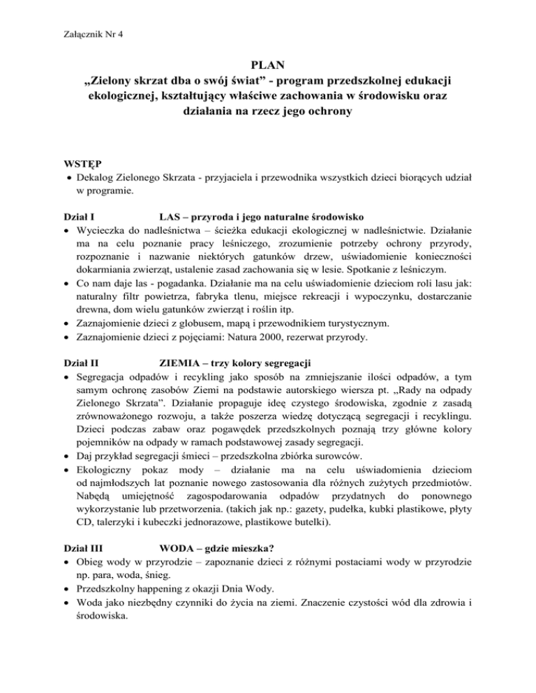 Załącznik Nr 4 PLAN „Zielony skrzat dba o swój świat” - program przedszkolnej edukacji ekologicznej, kształtujący właściwe zachowania w środowisku oraz działania na rzecz jego ochrony WSTĘP • Dekalog Zielonego Skrzata - przyjaciela i przewodnika wszystkich dzieci biorących udział w programie. Dział I LAS – przyroda i jego naturalne środowisko • Wycieczka do nadleśnictwa – ścieżka edukacji ekologicznej w nadleśnictwie. Działanie ma na celu poznanie pracy leśniczego, zrozumienie potrzeby ochrony przyrody, rozpoznanie i nazwanie niektórych gatunków drzew, uświadomienie konieczności dokarmiania zwierząt, ustalenie zasad zachowania się w lesie. Spotkanie z leśniczym. • Co nam daje las - pogadanka. Działanie ma na celu uświadomienie dzieciom roli lasu jak: naturalny filtr powietrza, fabryka tlenu, miejsce rekreacji i wypoczynku, dostarczanie drewna, dom wielu gatunków zwierząt i roślin itp. • Zaznajomienie dzieci z globusem, mapą i przewodnikiem turystycznym. • Zaznajomienie dzieci z pojęciami: Natura 2000, rezerwat przyrody. Dział II ZIEMIA – trzy kolory segregacji • Segregacja odpadów i recykling jako sposób na zmniejszanie ilości odpadów, a tym samym ochronę zasobów Ziemi na podstawie autorskiego wiersza pt. „Rady na odpady Zielonego Skrzata”. Działanie propaguje ideę czystego środowiska, zgodnie z zasadą zrównoważonego rozwoju, a także poszerza wiedzę dotyczącą segregacji i recyklingu. Dzieci podczas zabaw oraz pogawędek przedszkolnych poznają trzy główne kolory pojemników na odpady w ramach podstawowej zasady segregacji. • Daj przykład segregacji śmieci – przedszkolna zbiórka surowców. • Ekologiczny pokaz mody – działanie ma na celu uświadomienia dzieciom od najmłodszych lat poznanie nowego zastosowania dla różnych zużytych przedmiotów. Nabędą umiejętność zagospodarowania odpadów przydatnych do ponownego wykorzystanie lub przetworzenia. (takich jak np.: gazety, pudełka, kubki plastikowe, płyty CD, talerzyki i kubeczki jednorazowe, plastikowe butelki). Dział III WODA – gdzie mieszka? • Obieg wody w przyrodzie – zapoznanie dzieci z różnymi postaciami wody w przyrodzie np. para, woda, śnieg. • Przedszkolny happening z okazji Dnia Wody. • Woda jako niezbędny czynniki do życia na ziemi. Znaczenie czystości wód dla zdrowia i środowiska. Załącznik Nr 4 Dział IV POWIETRZE – tropienie Eko-przestępców • Gdzie się ukryło powietrze – wyjaśnienie pojęcia powietrze, poprzez zabawy oraz doświadczenia przeprowadzone wspólnie z dziećmi. • Tropienie Eko - przestępców – spacer po okolicy, w której znajduje się przedszkole oraz obserwacja czynników (np. fabryki, samochody, kominy), które przyczyniają się do zanieczyszczania powietrza oraz środowiska – ułożenie listy źródeł tych zanieczyszczeń; • Energia wiatru jako jedno z odnawialnych źródeł energii – zabawy w klasie. ZAKOŃCZENIE • Zrobienie przez dzieci odznaki Zielonego Skrzata ze ślubowaniem na członka jego klubu. Każdy ze zrealizowanych działów Programu powinien być udokumentowany przez koordynatora projektu. Do każdej część Wydrukowanego Programu dołączona będzie Karta sprawozdawcza, którą należy wypełnić i przesłać do RDOŚ w Łodzi w określonym terminie.